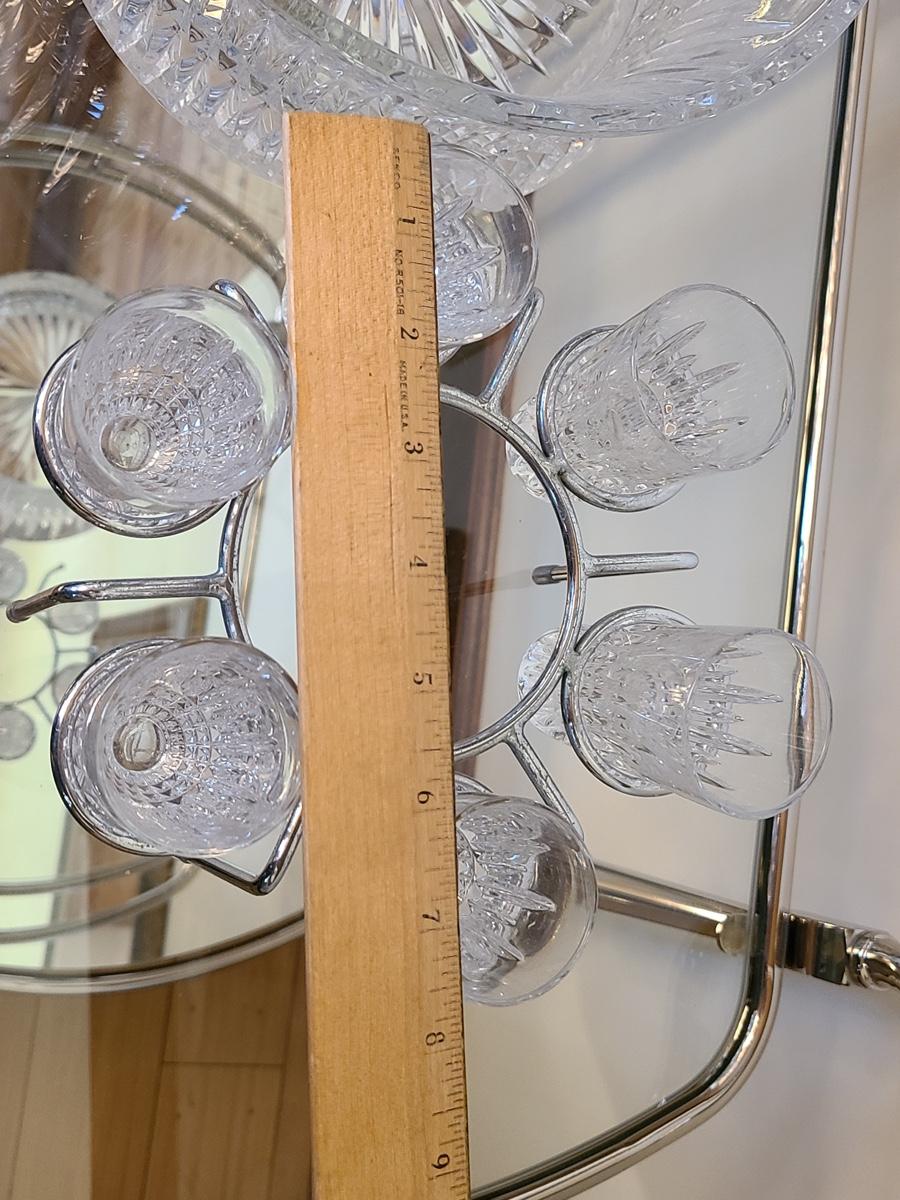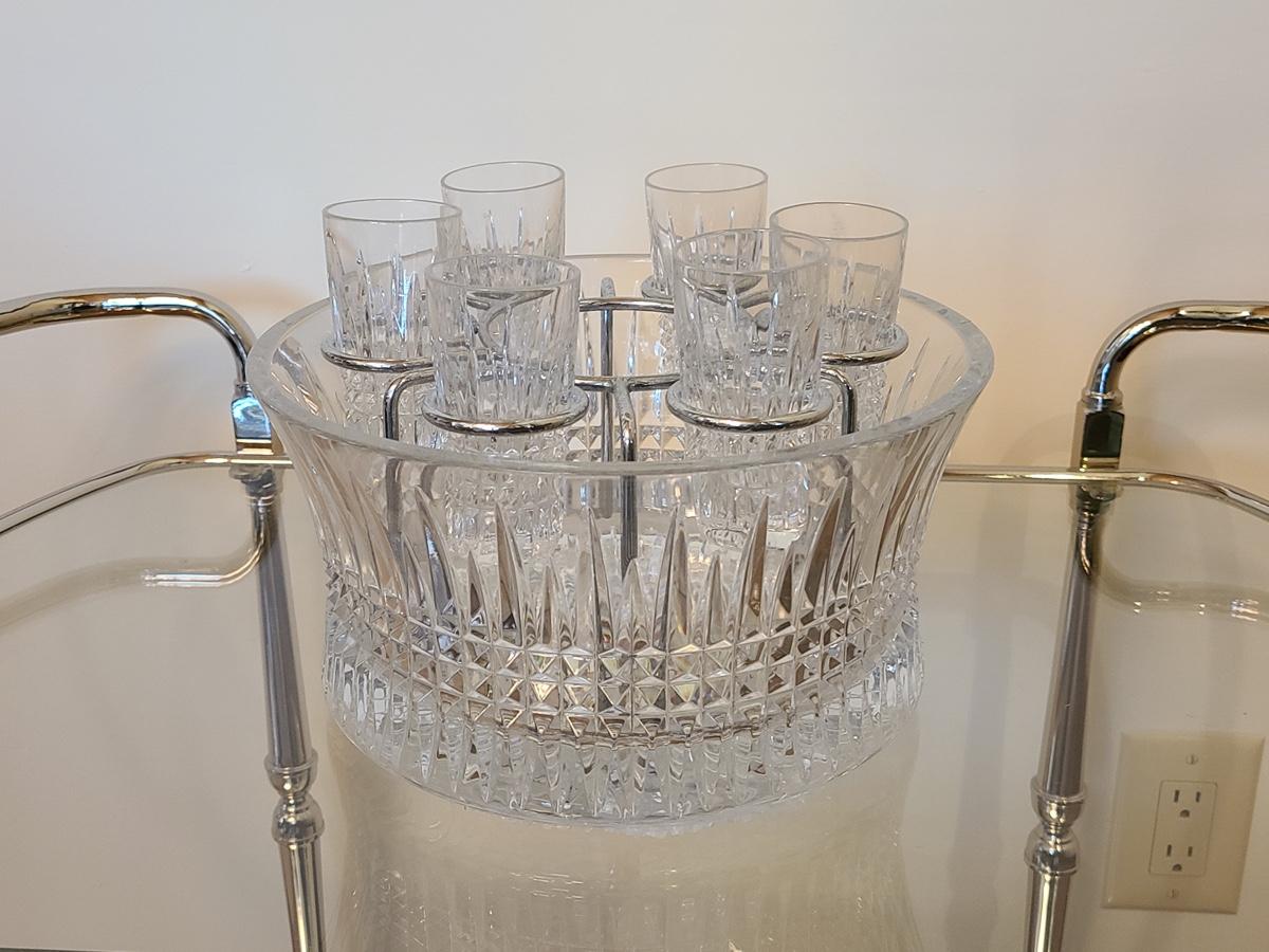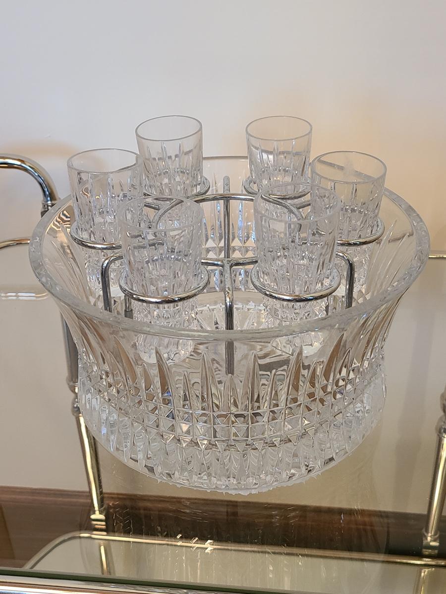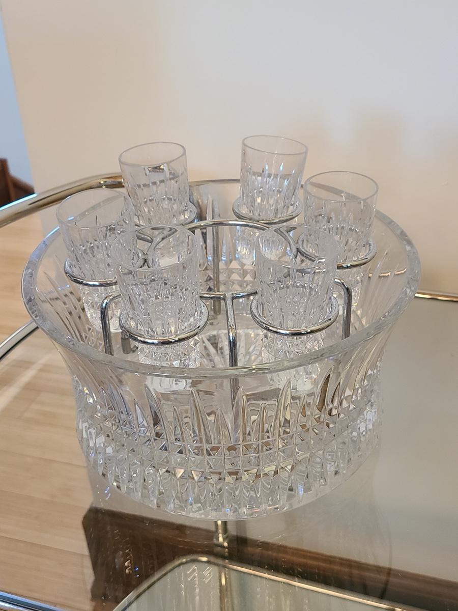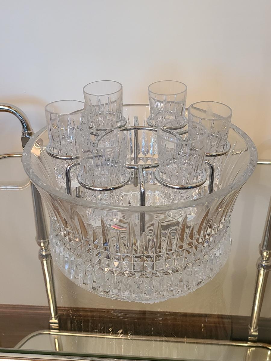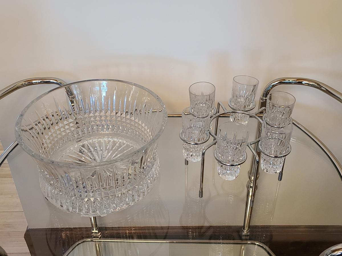 This is a highly sought after piece to add to your collection. This set includes the chill bowl, chrome designed shot glass stand (shows a little wear) and 6 shot glasses. Acid etched Waterford mark on base. Functional and Beautiful! Please see all pictures as they are the best representation of the items. The pictures show condition, measurements if taken, and what is included in the lot. Due to the large amount that we photograph and the time frame, we are not always able to take measurements. All items unless noted, are pre-owned and have been used. If you purchased furniture, you must bring help. We do not allow one person to carry large furniture out on their own. Bring help, tools and a truck for the safety of our clients homes, and your personal safety. Company policy. Thank you.