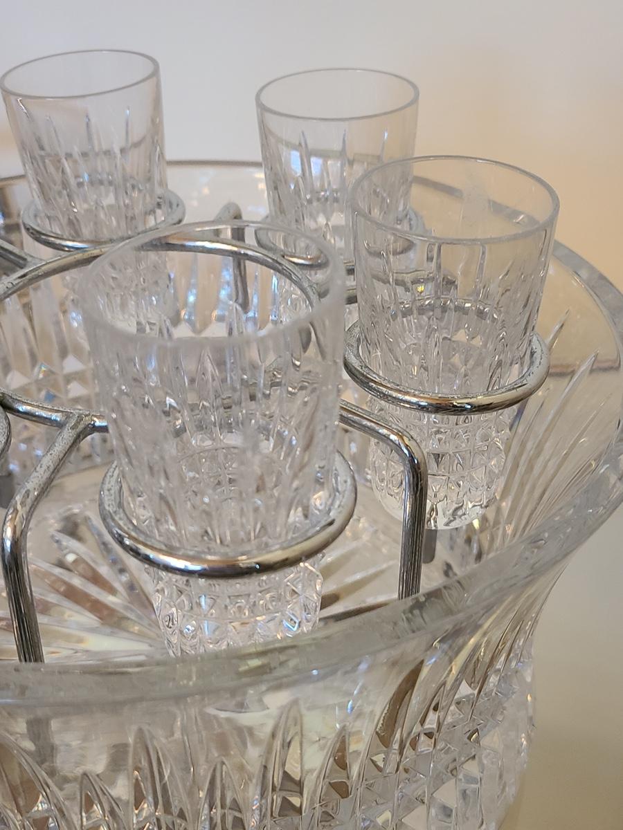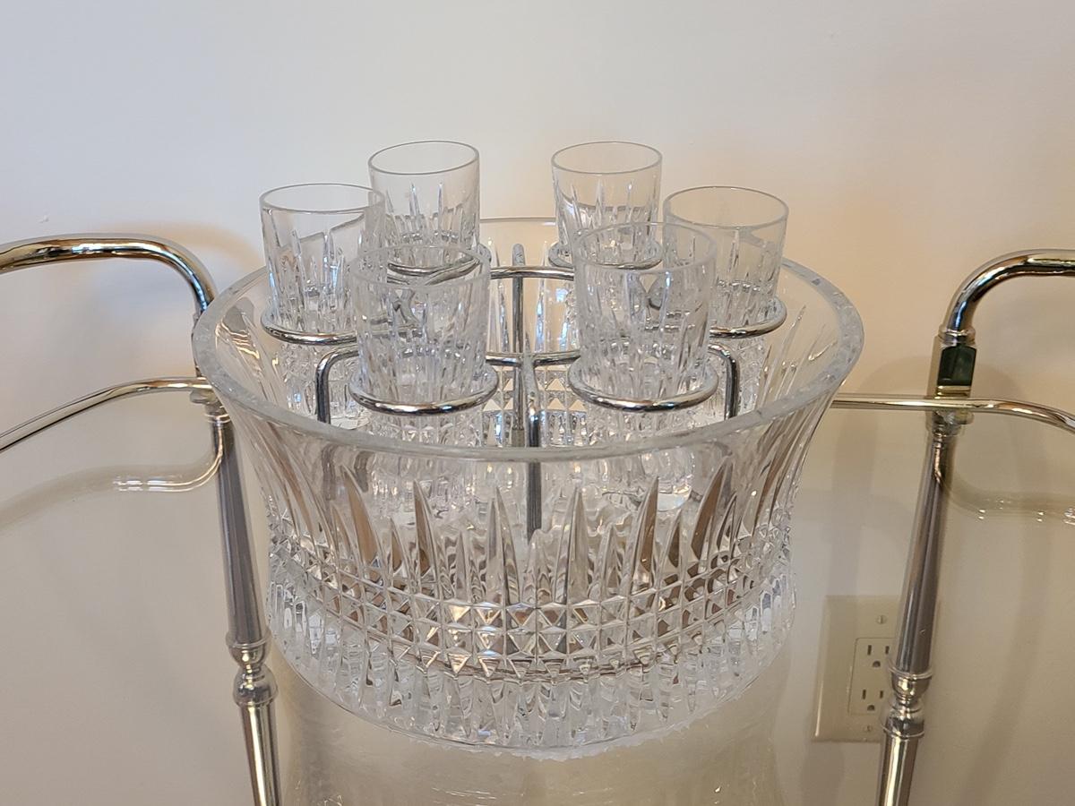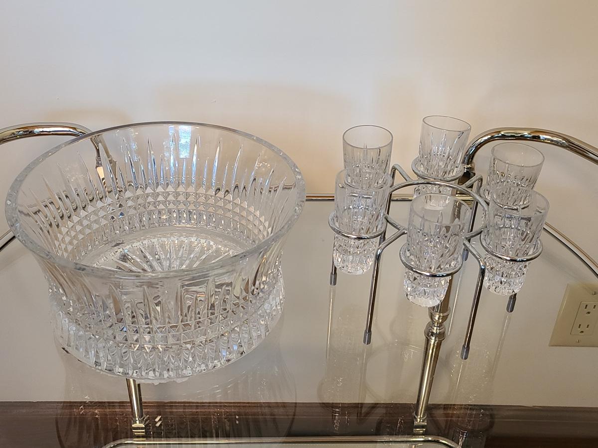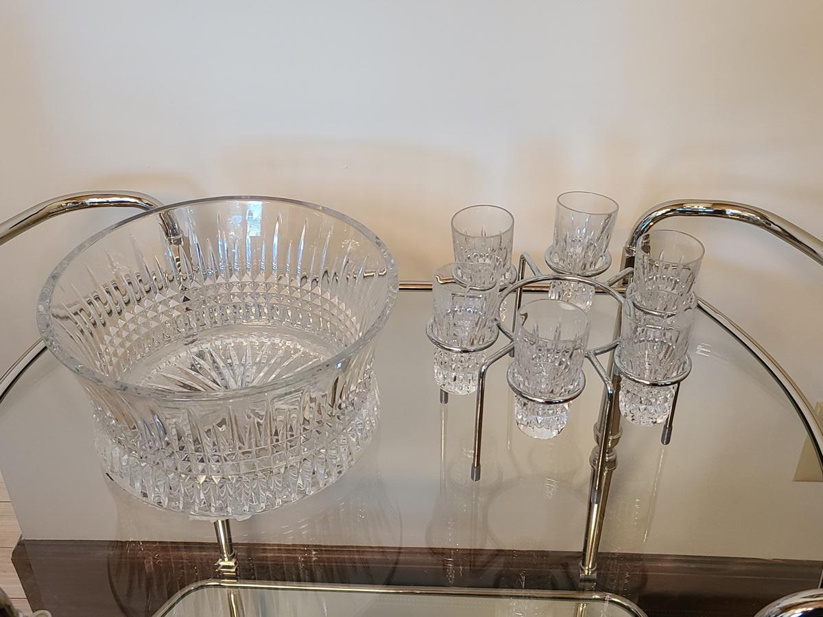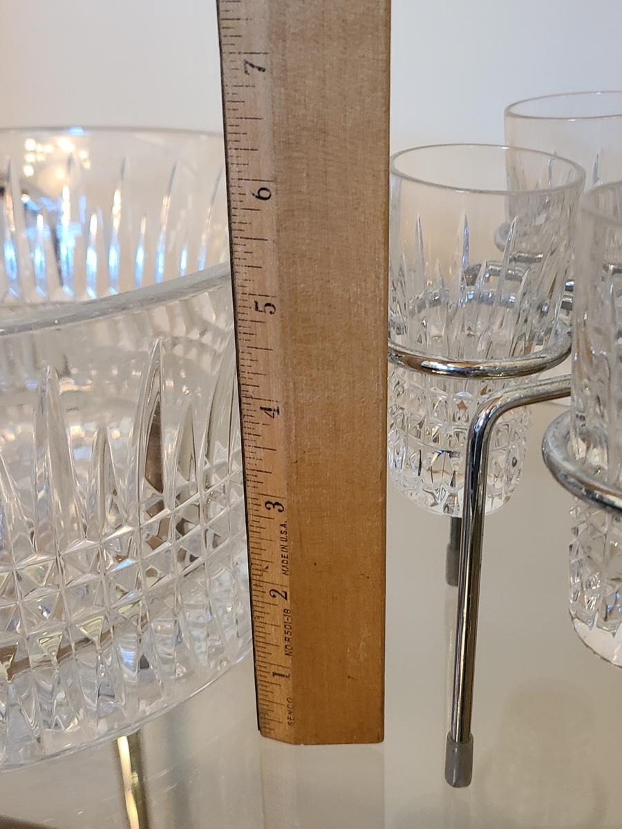 This is a highly sought after piece to add to your collection. This set includes the chill bowl, chrome designed shot glass stand (shows a little wear) and 6 shot glasses. Acid etched Waterford mark on base. Functional and Beautiful! Please see all pictures as they are the best representation of the items. The pictures show condition, measurements if taken, and what is included in the lot. Due to the large amount that we photograph and the time frame, we are not always able to take measurements. All items unless noted, are pre-owned and have been used. If you purchased furniture, you must bring help. We do not allow one person to carry large furniture out on their own. Bring help, tools and a truck for the safety of our clients homes, and your personal safety. Company policy. Thank you.