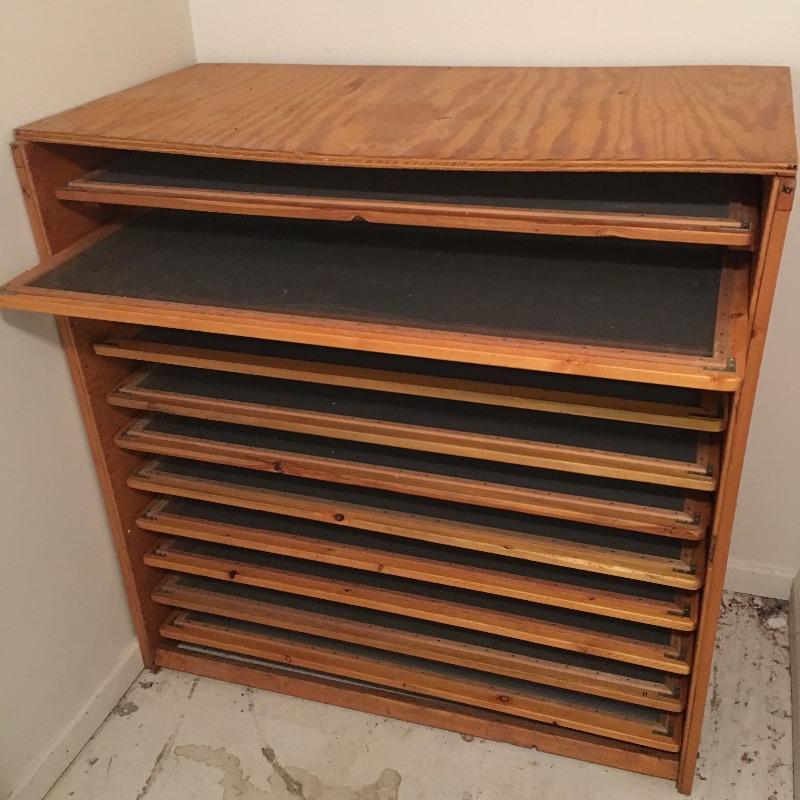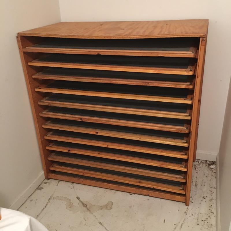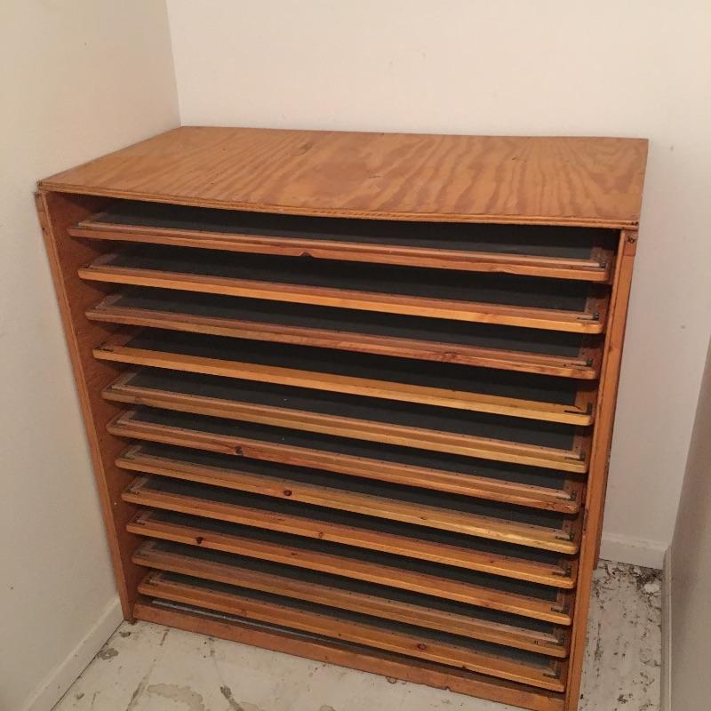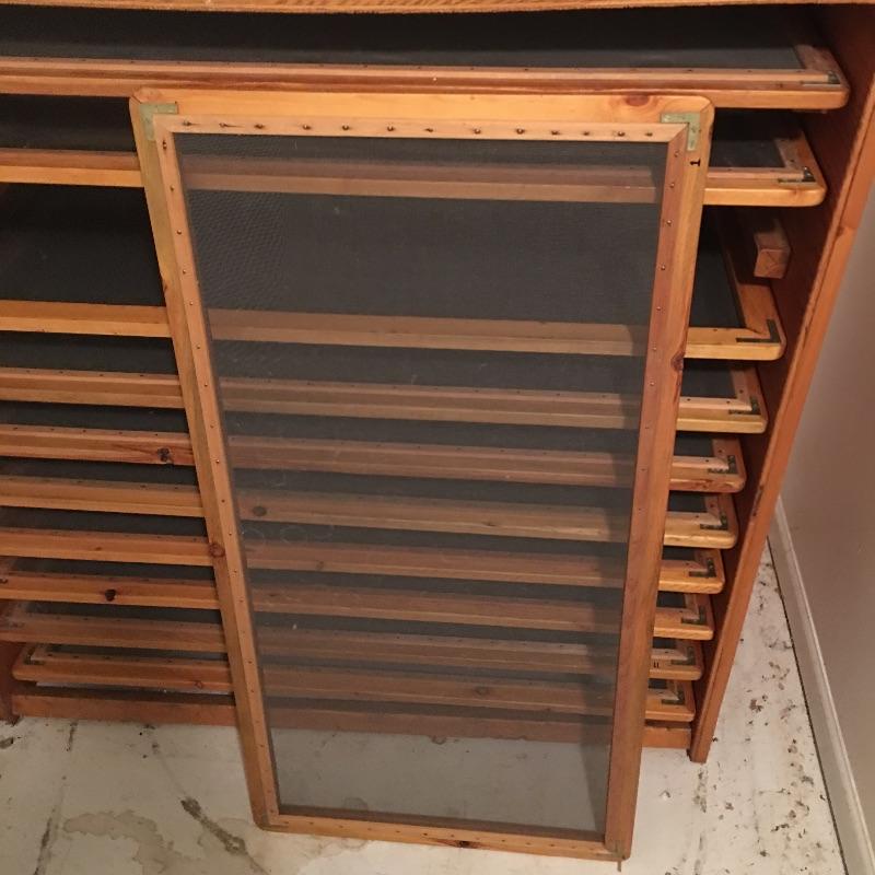 Wooden drying rack with eleven wood and screen drying racks. Great for wood, flowers or anything else you need to dry. Rack measures 24” x 48” x 48”.