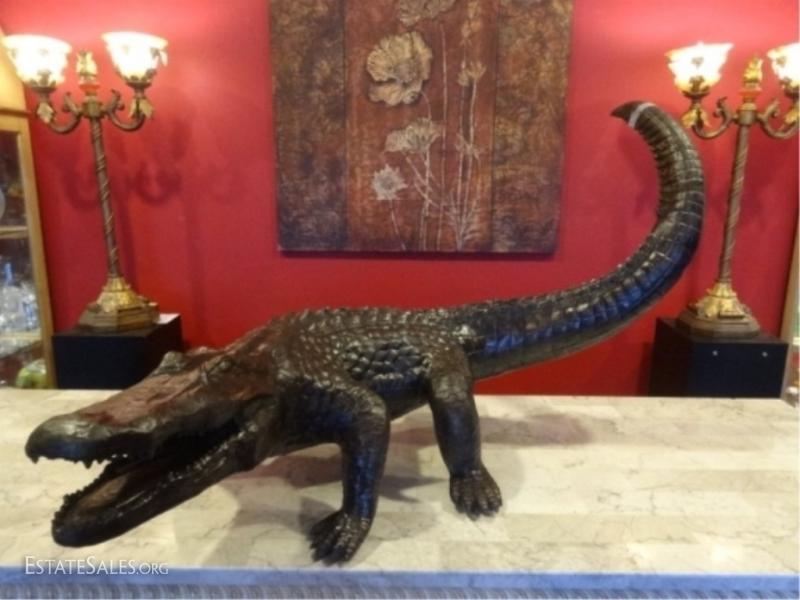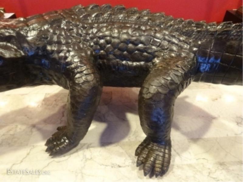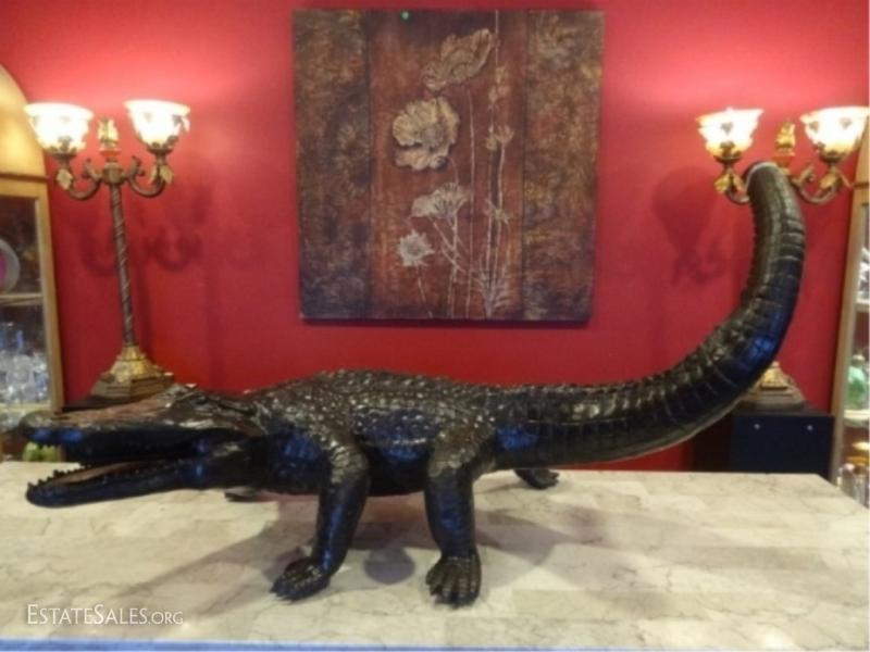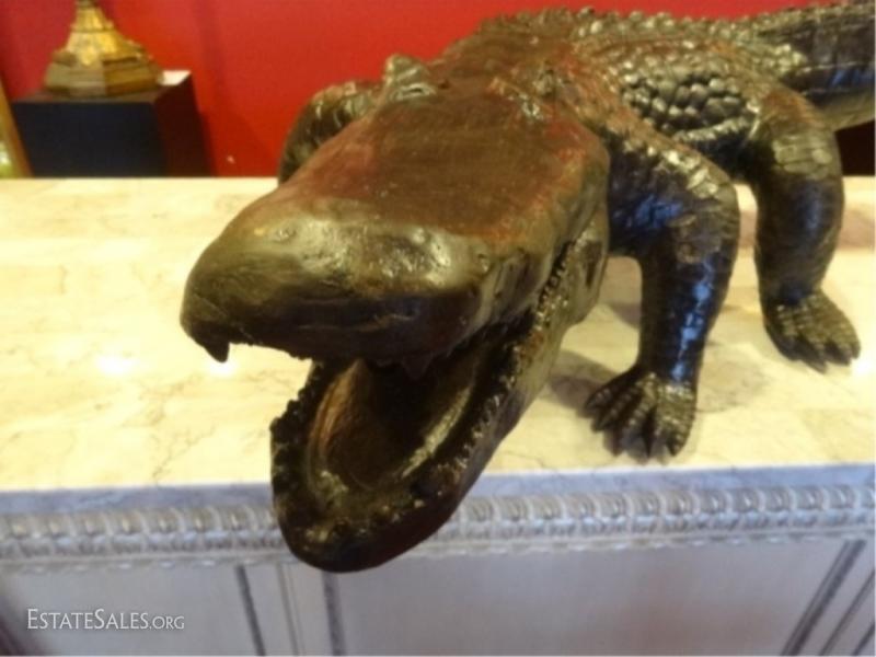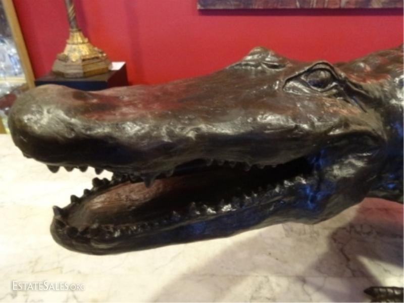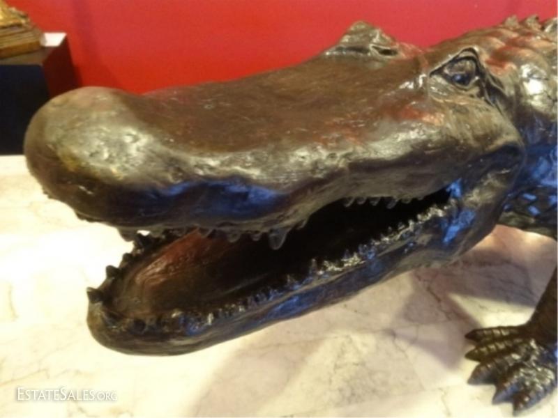 LOT 127A: LARGE BRONZE ALLIGATOR SCULPTURE, PLUMBED FOR OPTIONAL USE AS FOUNTAIN WITH WATER FLOWING FROM MOUTH, NEW NEVER USED, 42"W