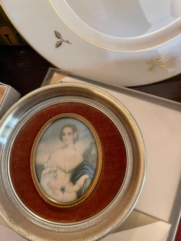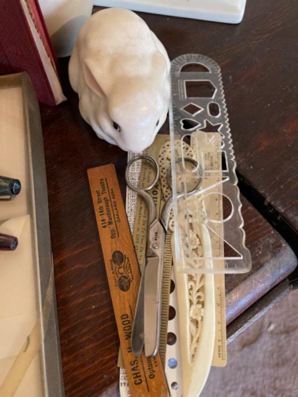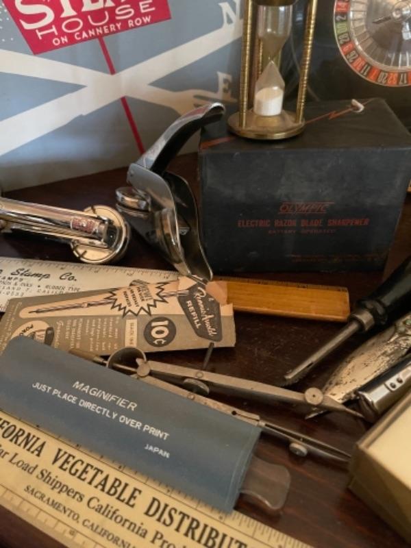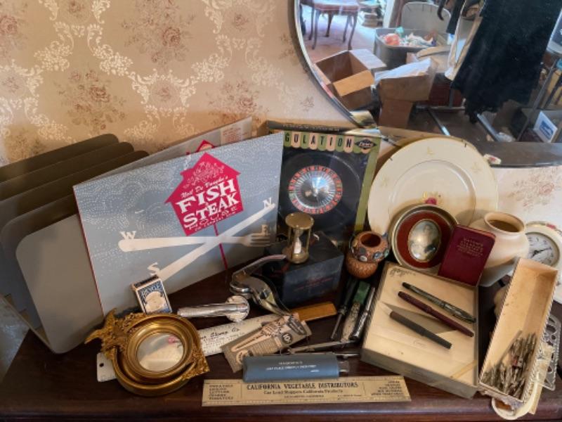 Lot 127B1. Lot of miscellaneous smalls“”fountain pens, nibs, vintage menu, paper divider, magnifying glass, vase, pins, clock, razor sharpener, unused roulette game in box, notary stamps, frames, etc.--$65