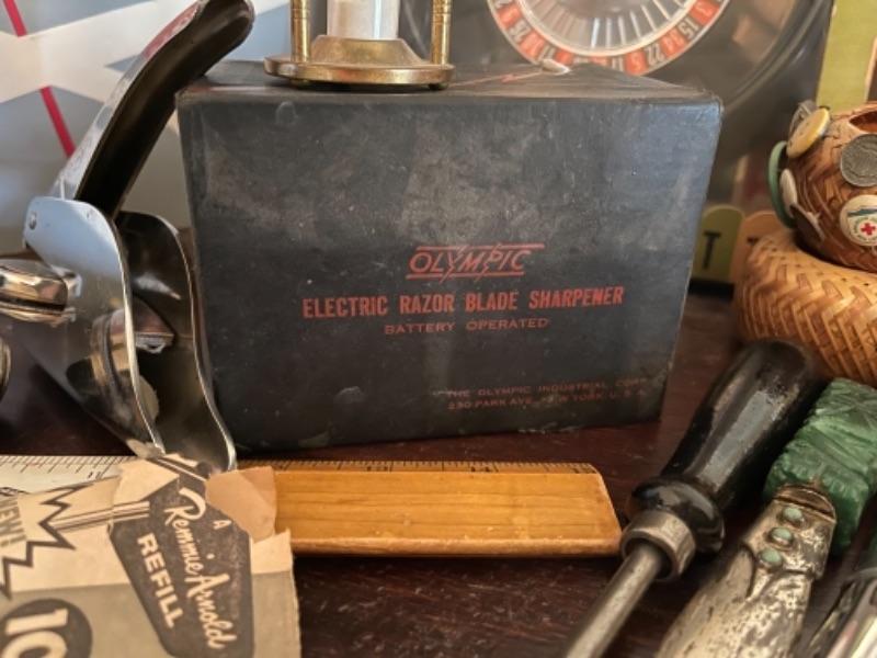 Lot 127B1. Lot of miscellaneous smalls“”fountain pens, nibs, vintage menu, pins, clock, razor sharpener, unused roulette game in box, notary stamps, etc.--$65