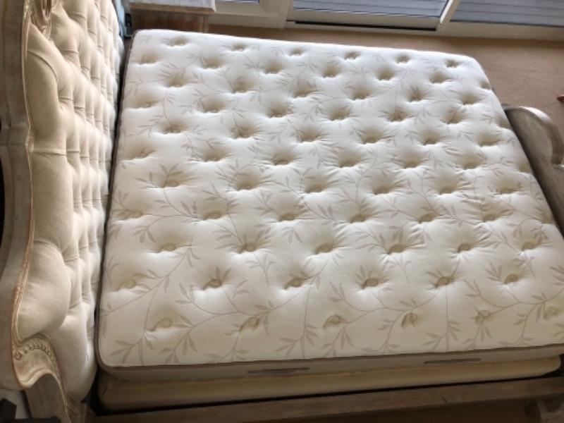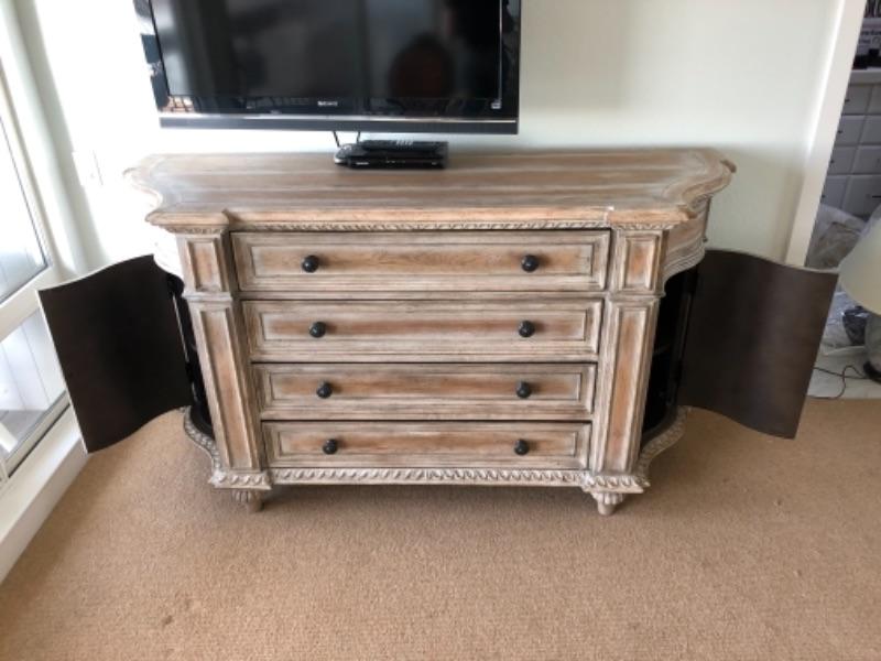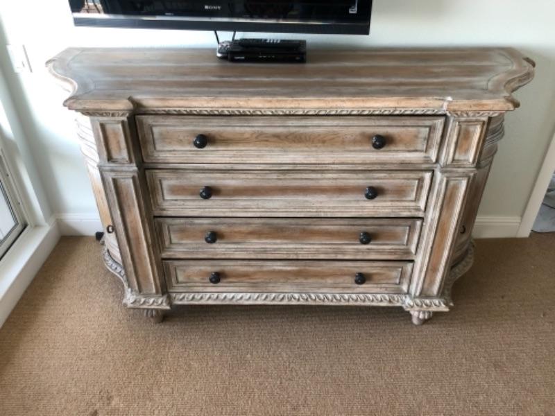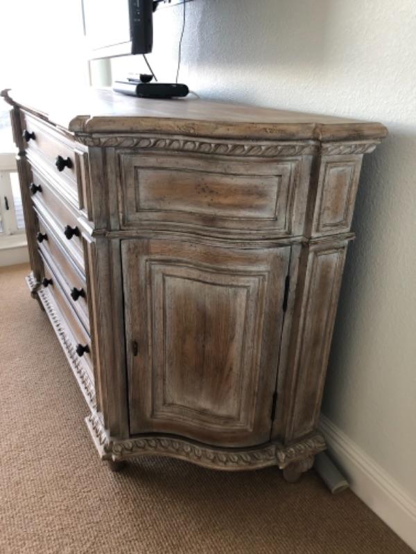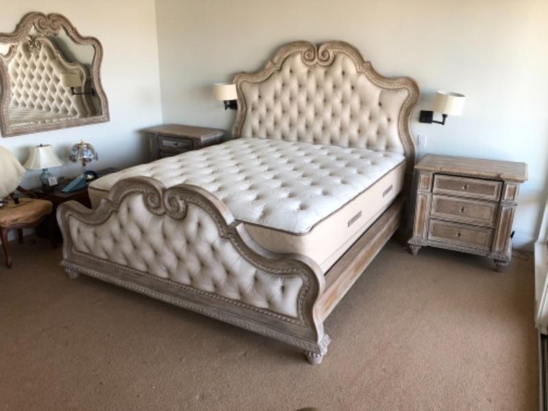 Lot 127U. Bedroom suite“”king bed w/Serta Posture Pedic (new); 2 bedside tables (19” x 32” x 33”) wood framed mirror (41” x 46”); 4-drawer dresser with 2 side cabinets (68” x 22.5” x 39”)--$800