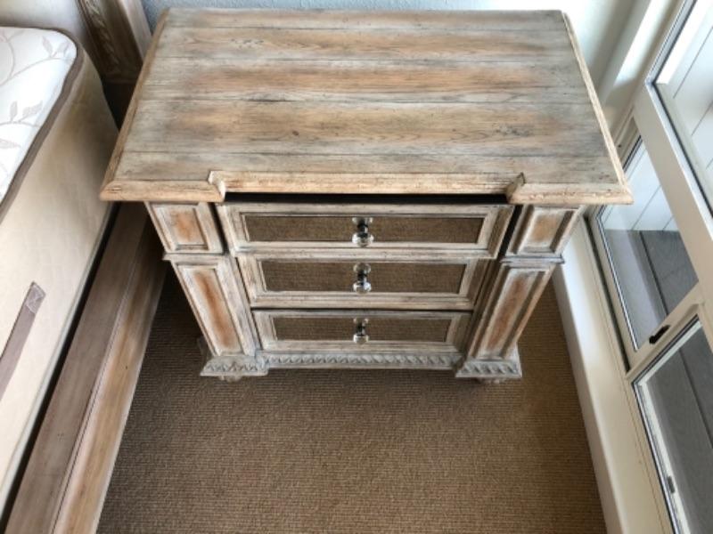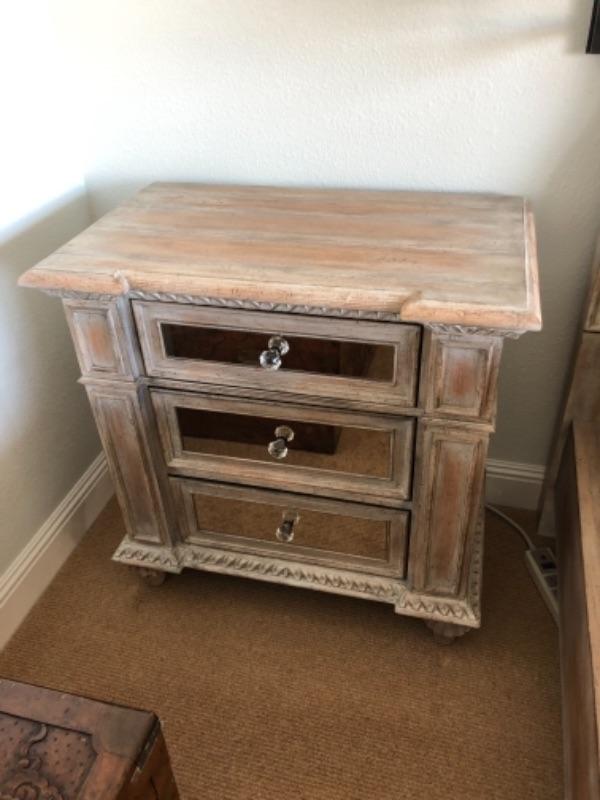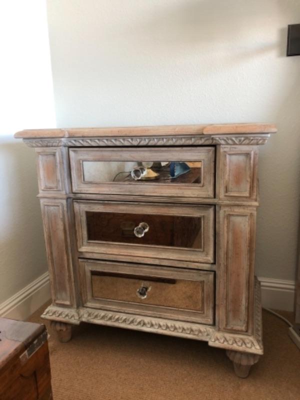 Lot 127U. Bedroom suite“”king bed w/Serta Posture Pedic (new); 2 bedside tables (19” x 32” x 33”) wood framed mirror (41” x 46”); 4-drawer dresser with 2 side cabinets (68” x 22.5” x 3