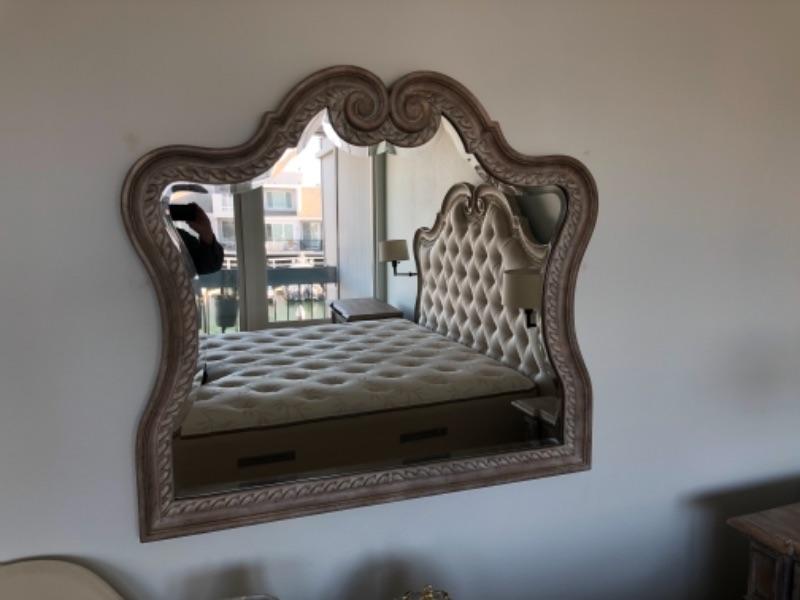 Lot 127U. Bedroom suite“”king bed w/Serta Posture Pedic (new); 2 bedside tables (19” x 32” x 33”) wood framed mirror (41” x 46”); 4-drawer dresser with 2 side cabinets  (68” x 22.5” x 3