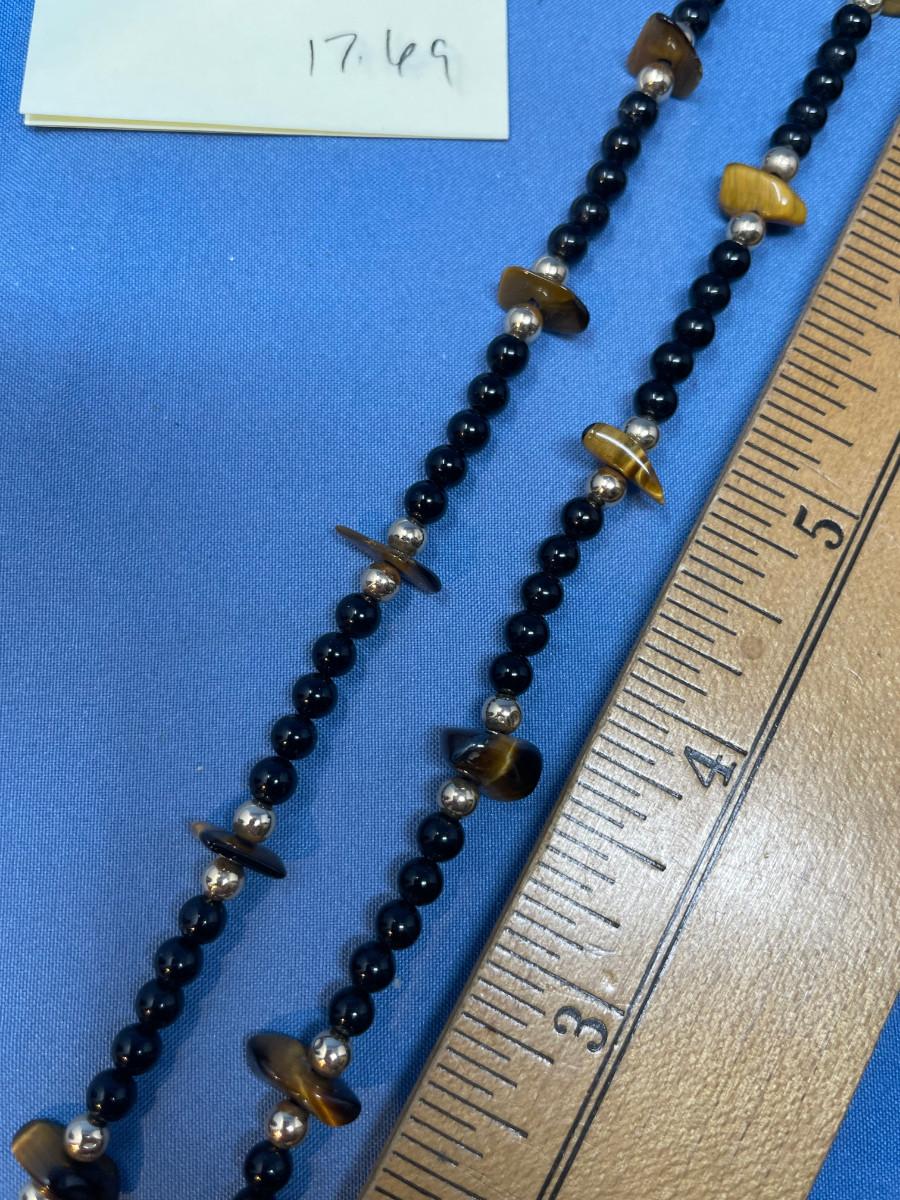 17.6 grams total weight. 14K gold beads & clasp. Tiger eye nuggets w/ onyx beads. Very classy.