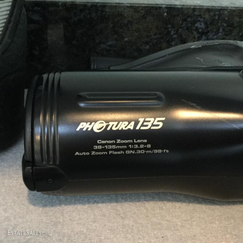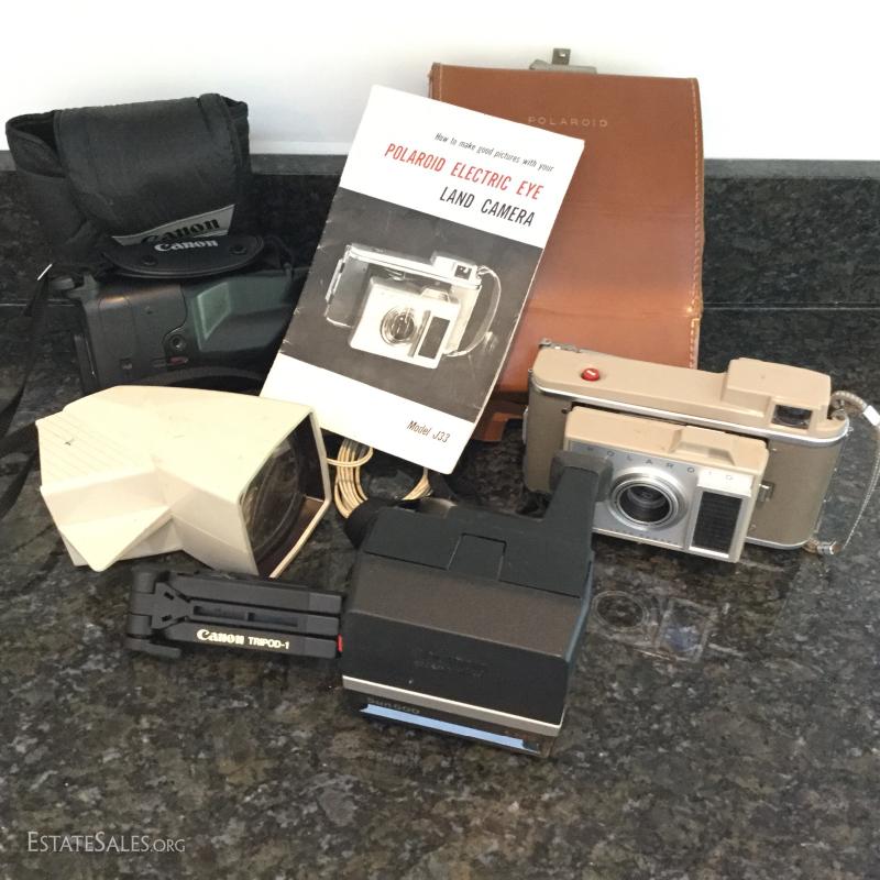 Two vintage Polaroid Cameras. Polaroid Electric Eye Land camera has case and brochure. One Canon Photura 135 with case. Postcards and Slide Viewer included. See photos. Shipping available or local pick up in Flat Rock, NC.