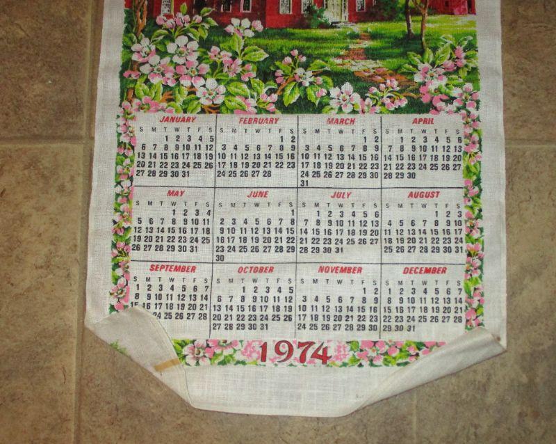 This vintage cloth calendar is in excellent condition - just need a little steaming at the bottom to lay flat (the blue clip at the top is not included, it was just to help keep it from rolling back up). No signs of tears or discoloration. It is approximately 28" long x 16" wide.