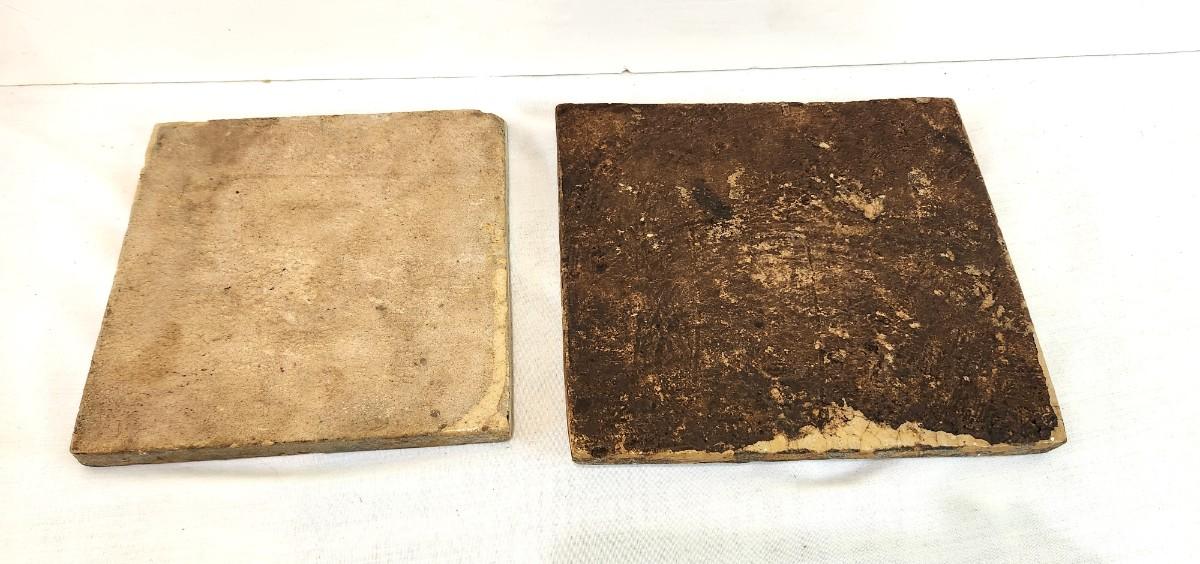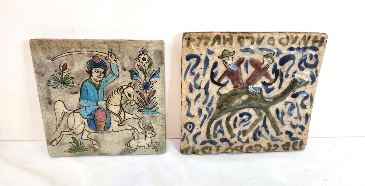 2 colorful Antique tiles - larger is 8.25" x 8", smaller is 7.25" x 7.25". Antique condition - crazing.