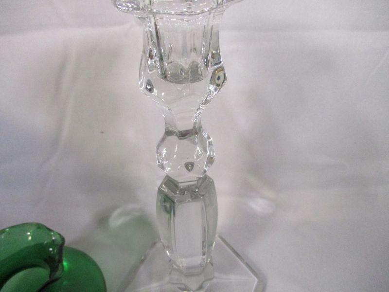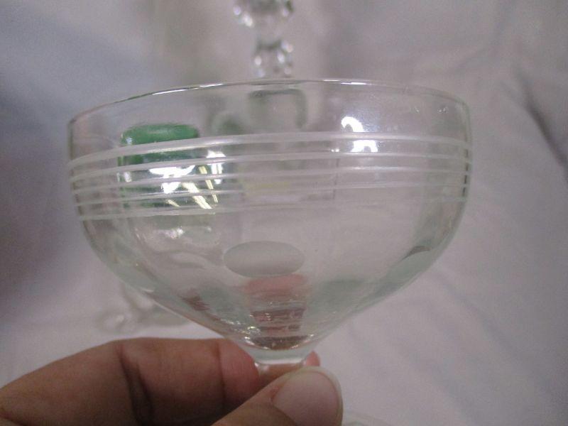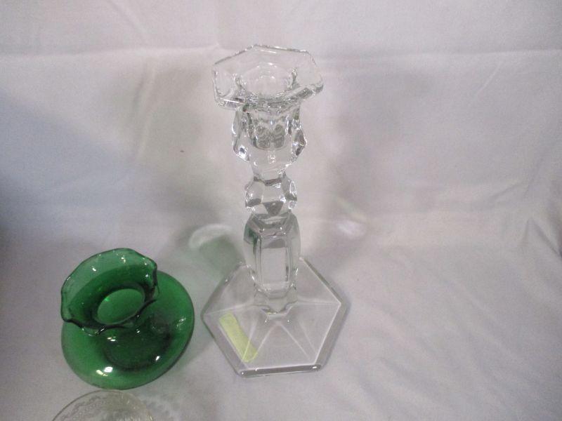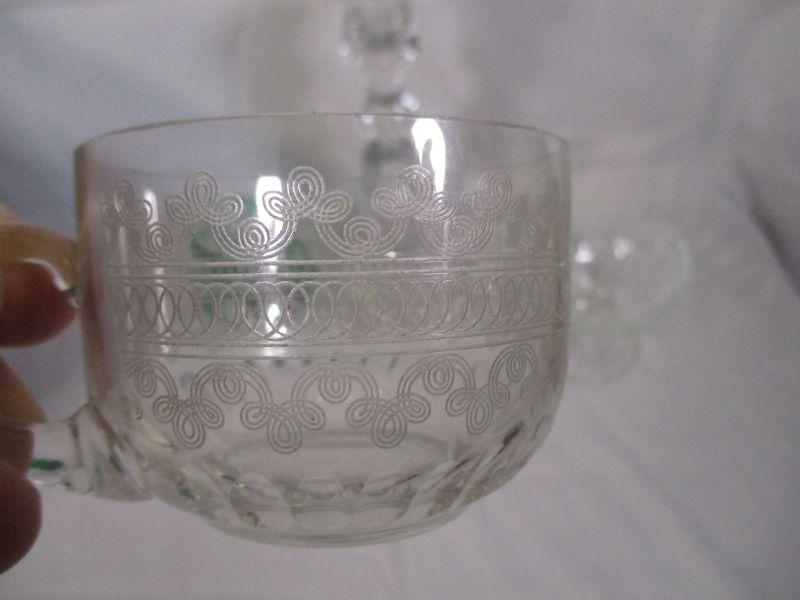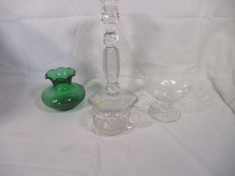 There is a glass candlestick holder (about 9" tall, a beautiful (there's that adjective again) etched glass cup, a champagne glass, and a green glass vase. All are in excellent condition.