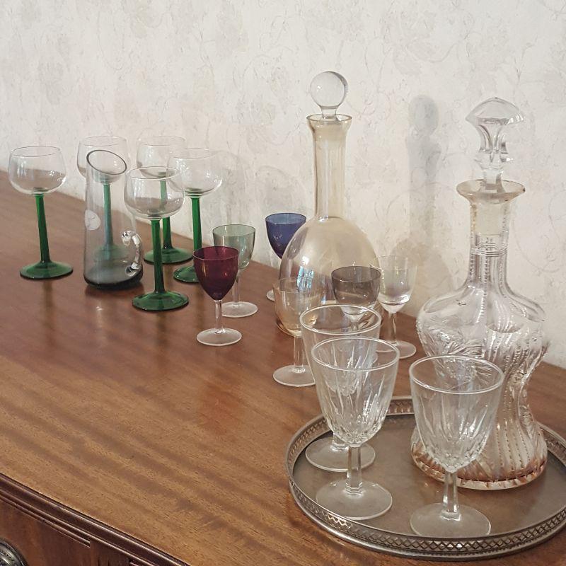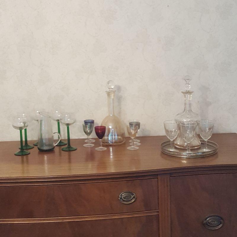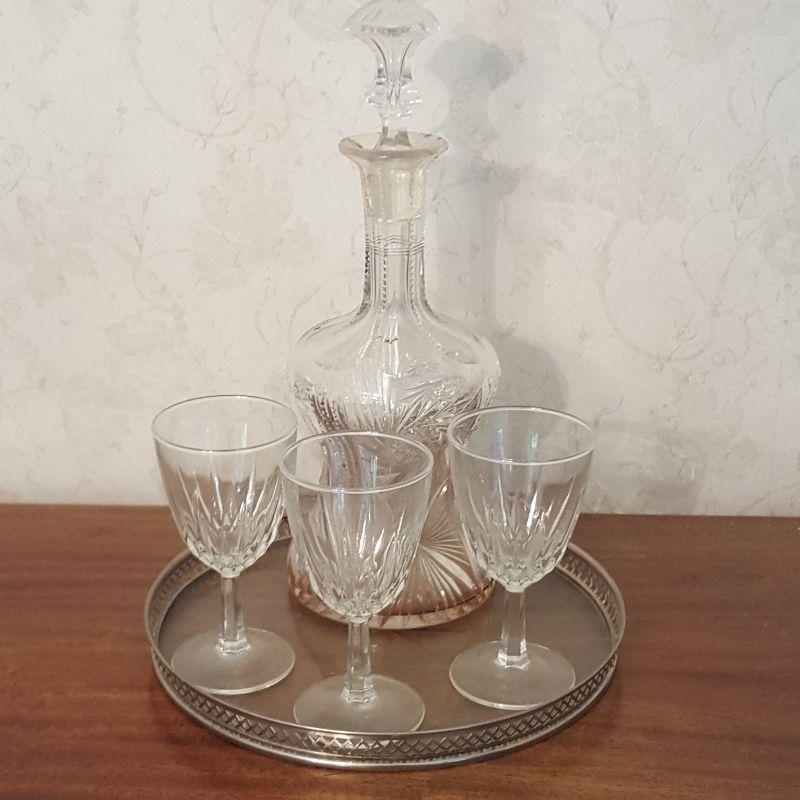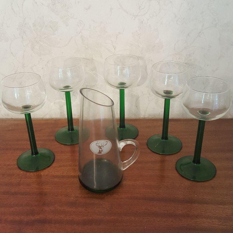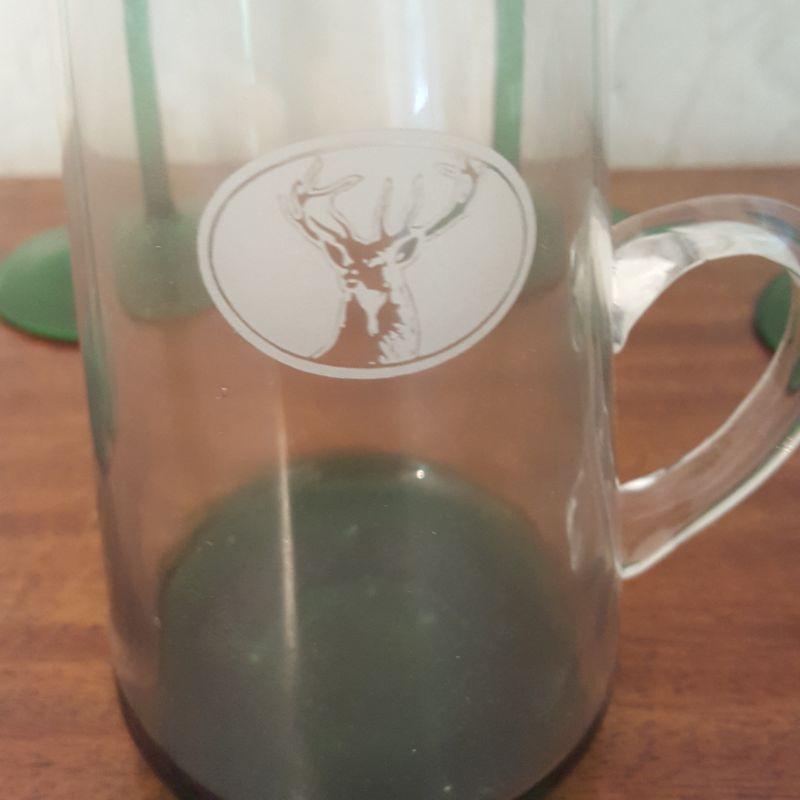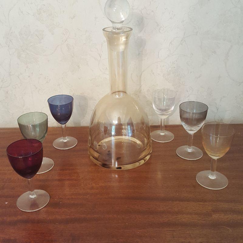 This lot contains 3 sets of wine decanters and glasses. The green trimmed set features a frosted buck on the pitcher, which measures 4x7 inches. This set appears to be in great shape. The white glass set comes with a glass bottom metal trimmed tray for easy carrying, a wine decanter (5x12.5 in.) and 3 glasses. The last set contains a decanter and 6 glasses. It may be hard to see in the pictures, but each glass is a different color and have a metallic, iridescent finish on the outside. This decanter needs a cleaning, as it appears to have mold spots inside.