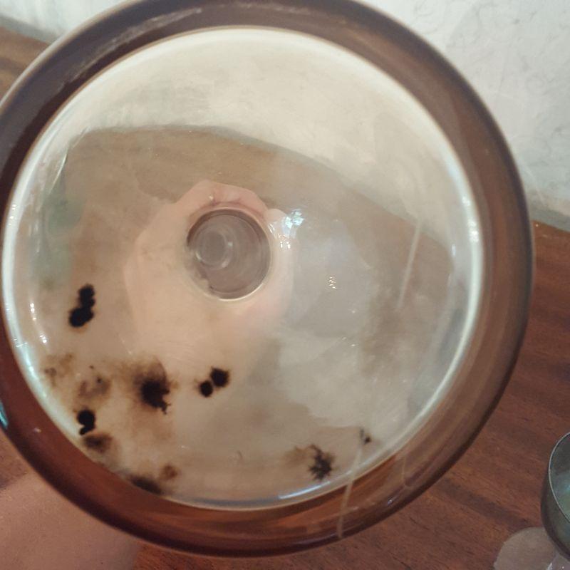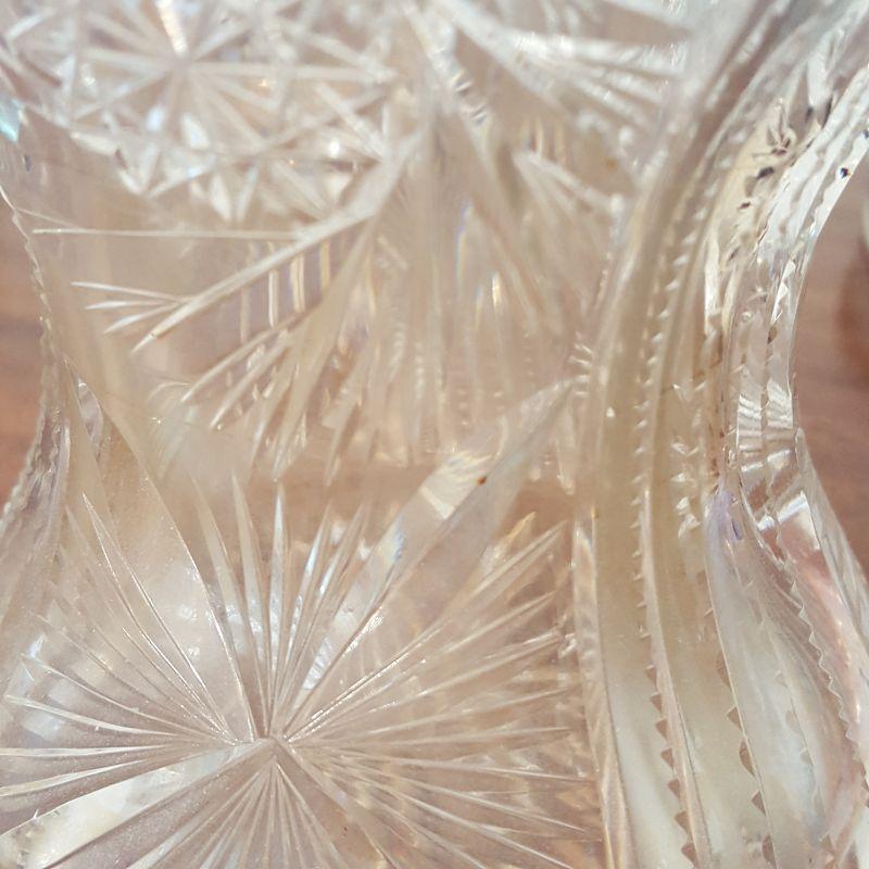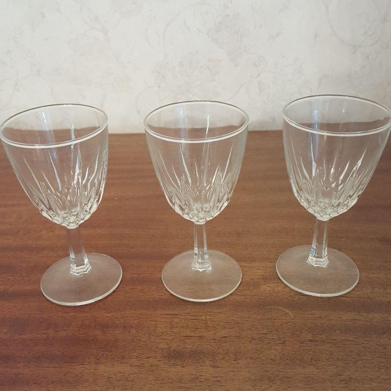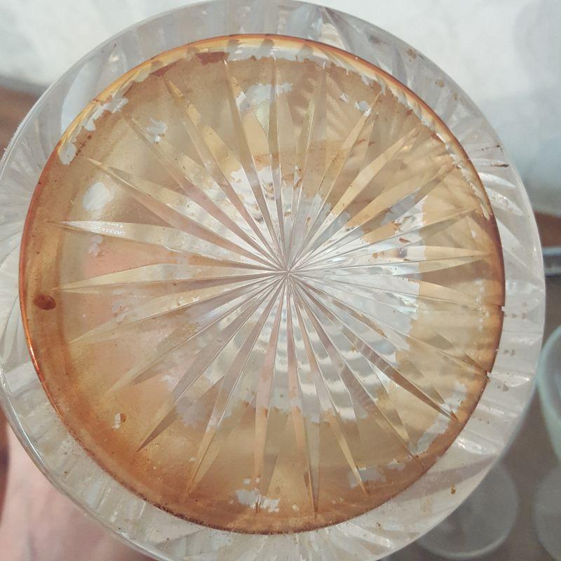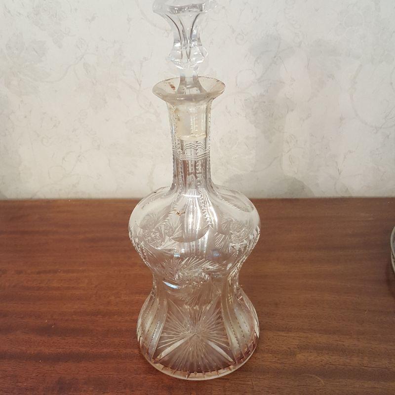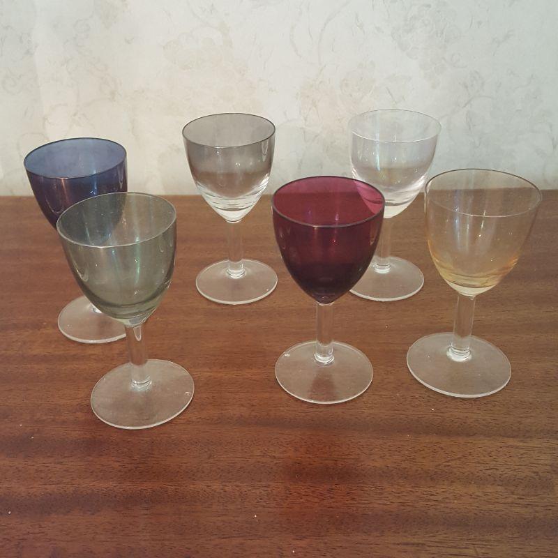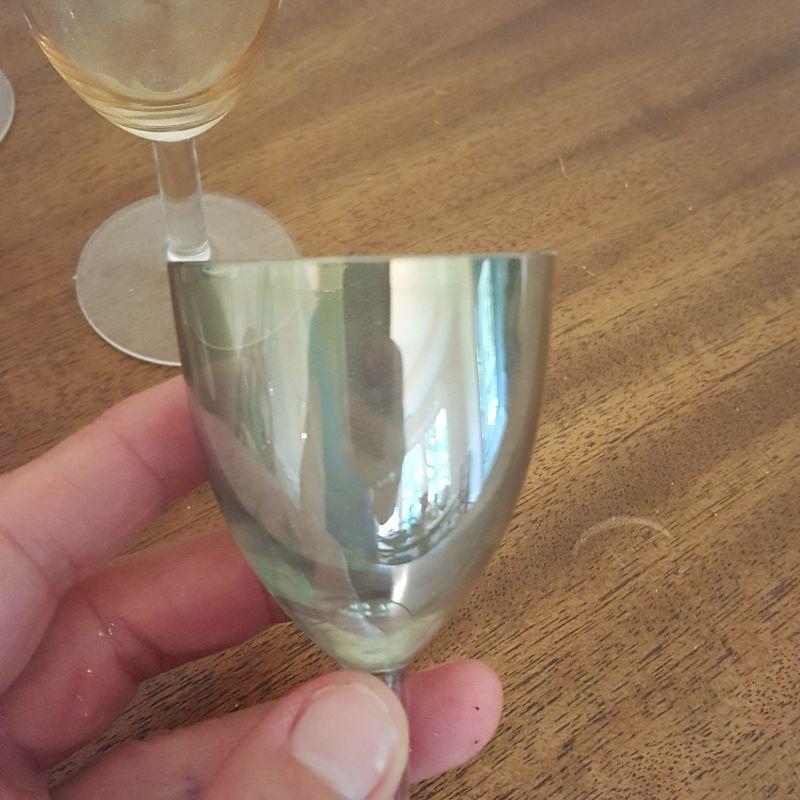 This lot contains 3 sets of wine decanters and glasses. The green trimmed set features a frosted buck on the pitcher, which measures 4x7 inches. This set appears to be in great shape. The white glass set comes with a glass bottom metal trimmed tray for easy carrying, a wine decanter (5x12.5 in.) and 3 glasses. The last set contains a decanter and 6 glasses. It may be hard to see in the pictures, but each glass is a different color and have a metallic, iridescent finish on the outside. This decanter needs a cleaning, as it appears to have mold spots inside.