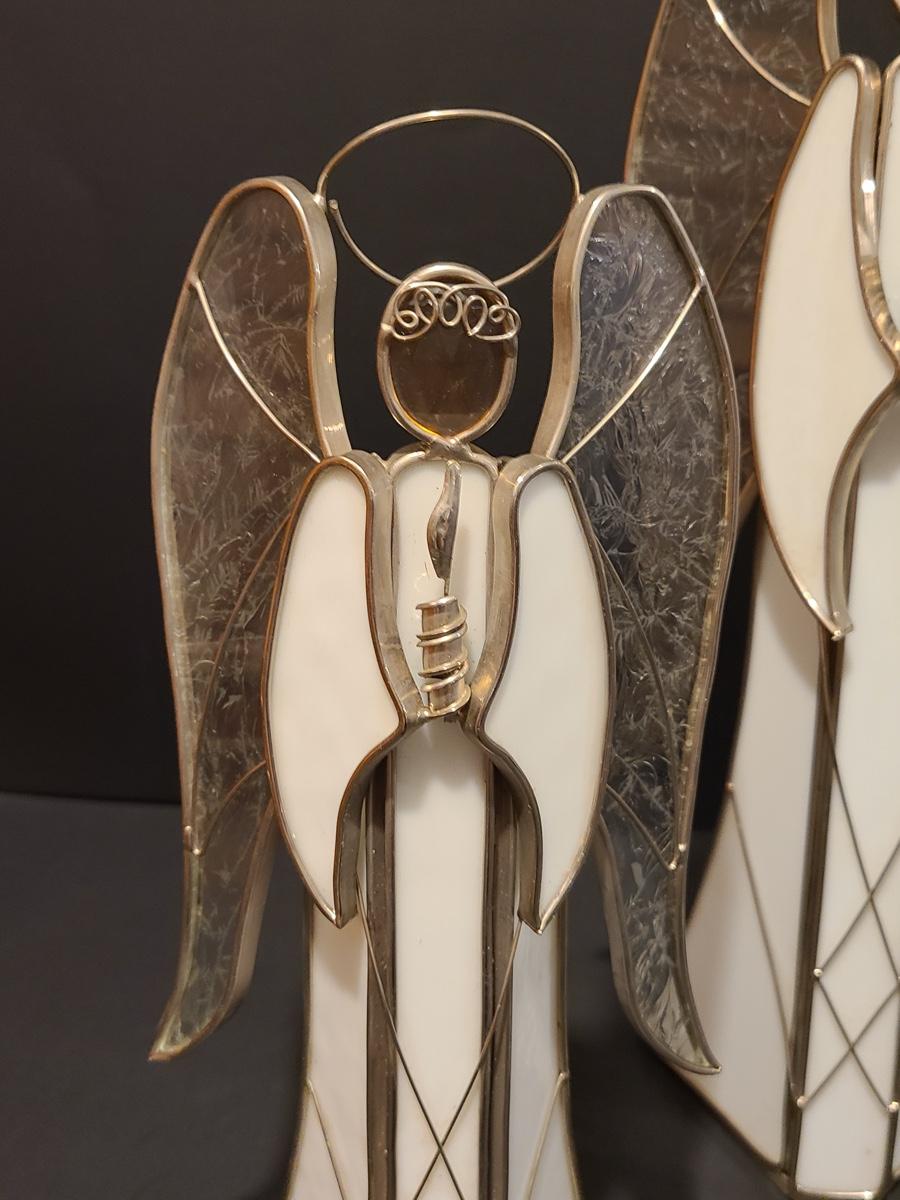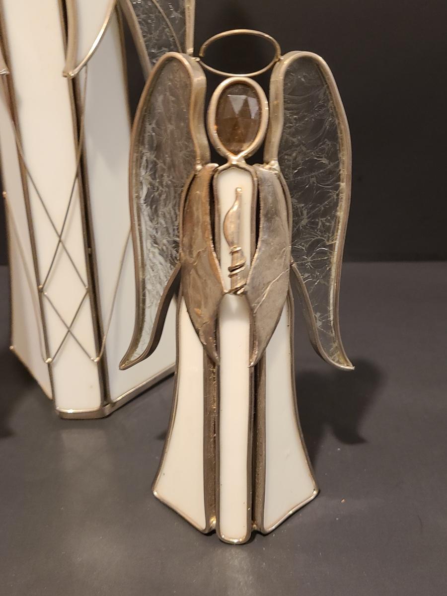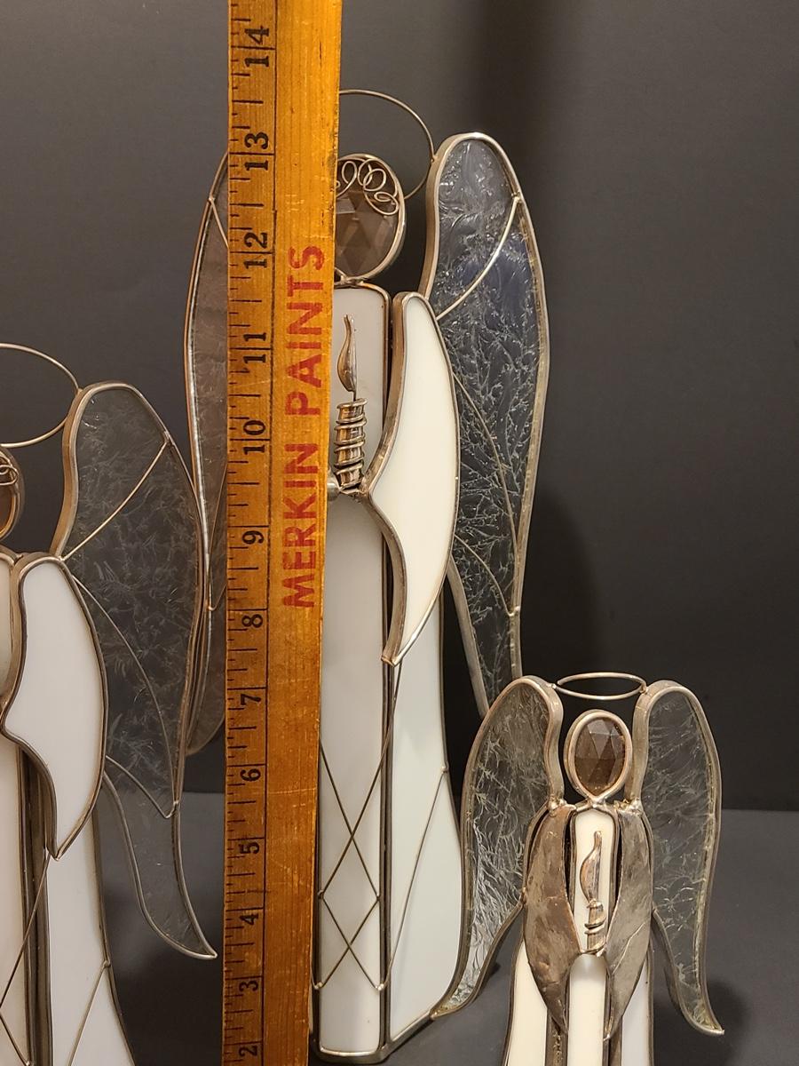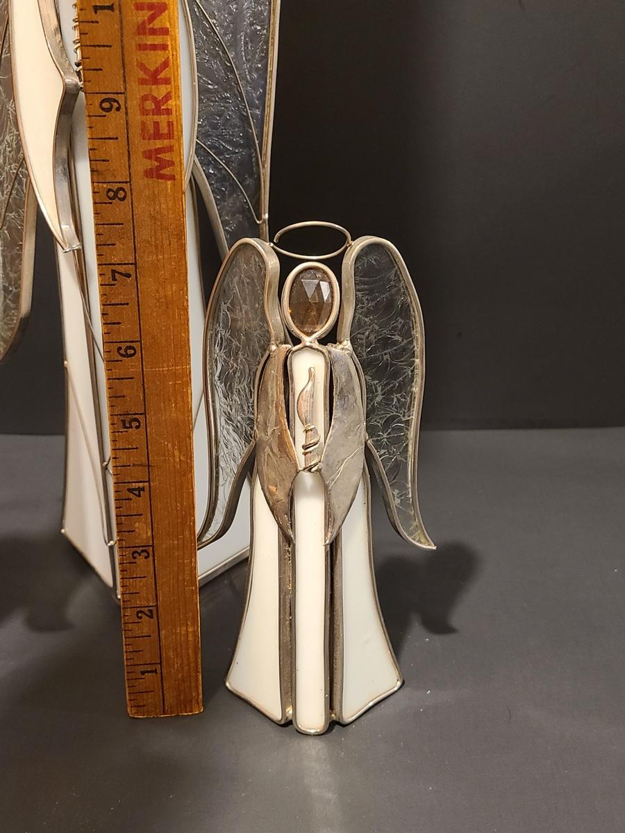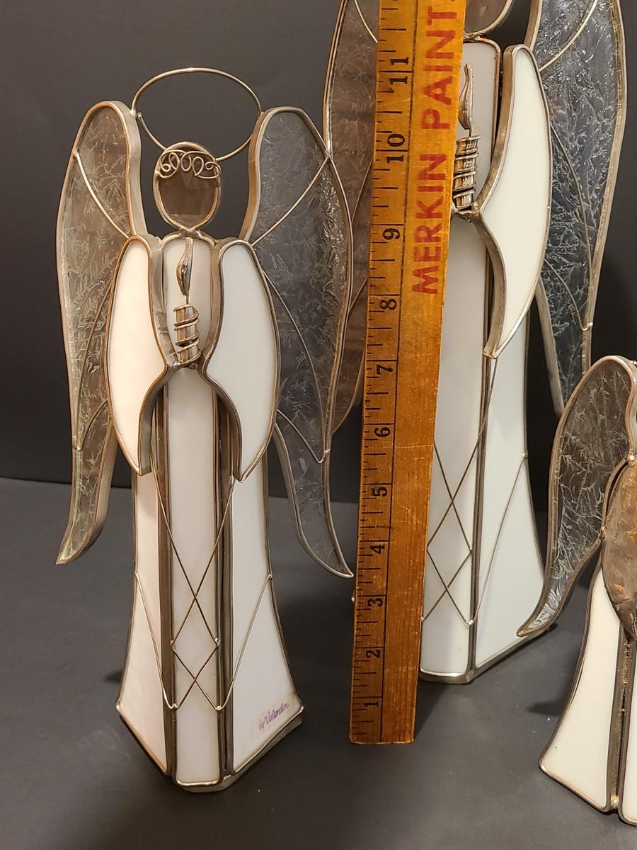 Lovely set of stained glass angels that can set in front of votive candles. There is one with small crack, but it is in the back of the piece and can't be seen because the arm overlays it. Please see all pictures. The pictures show condition, measurements if taken, and what is included in the lot. Due to the large amount that we photograph and the time frame, we are not always able to take measurements. All items unless noted, are pre-owned and have been used. If you purchased furniture, you must bring help. We do not allow one person to carry large furniture out on their own. Bring help, tools and a truck for the safety of our client’s homes, and your personal safety. Company policy. Thank you