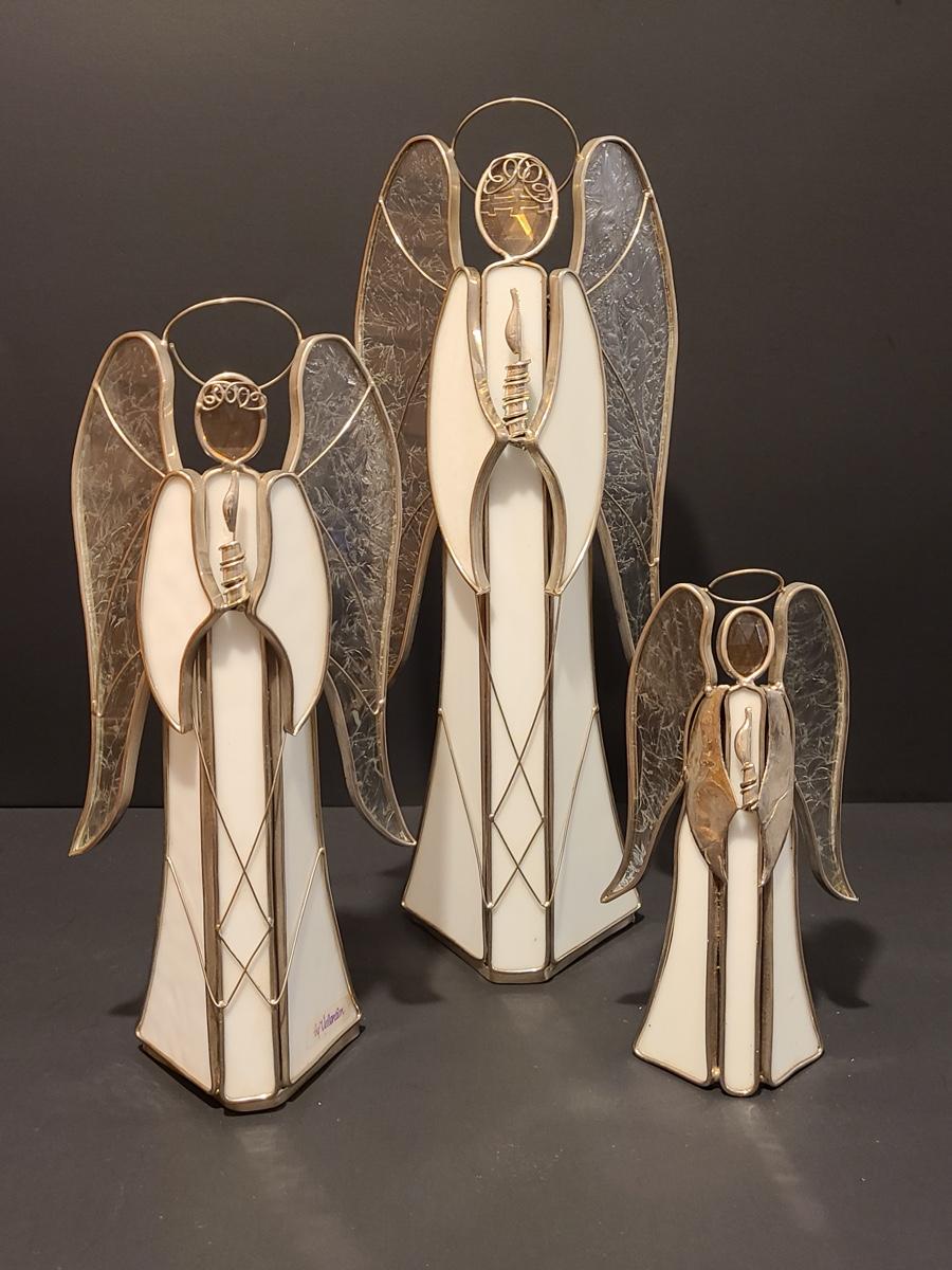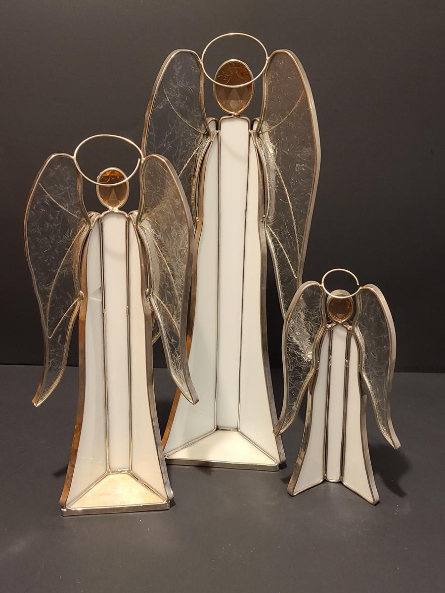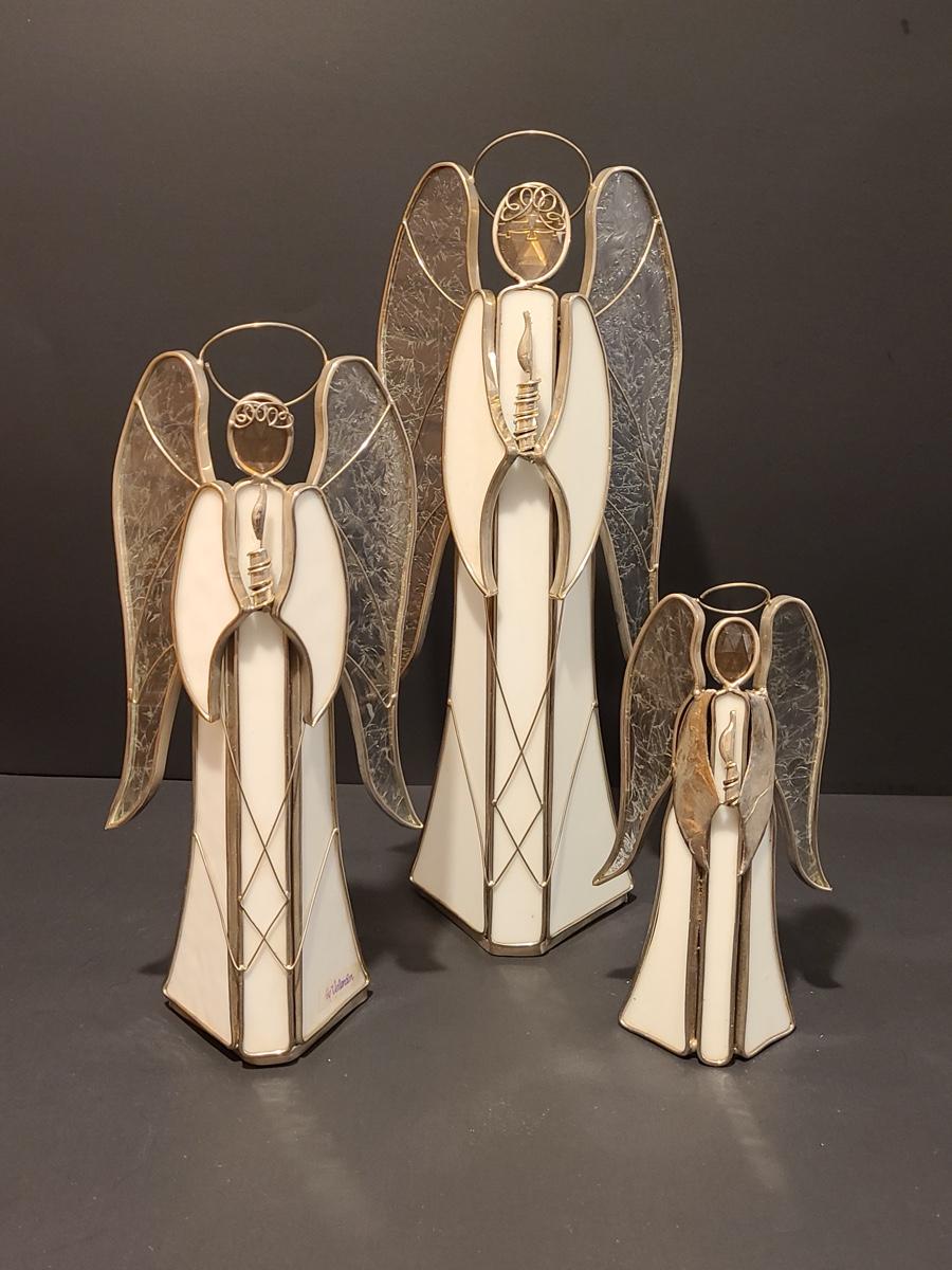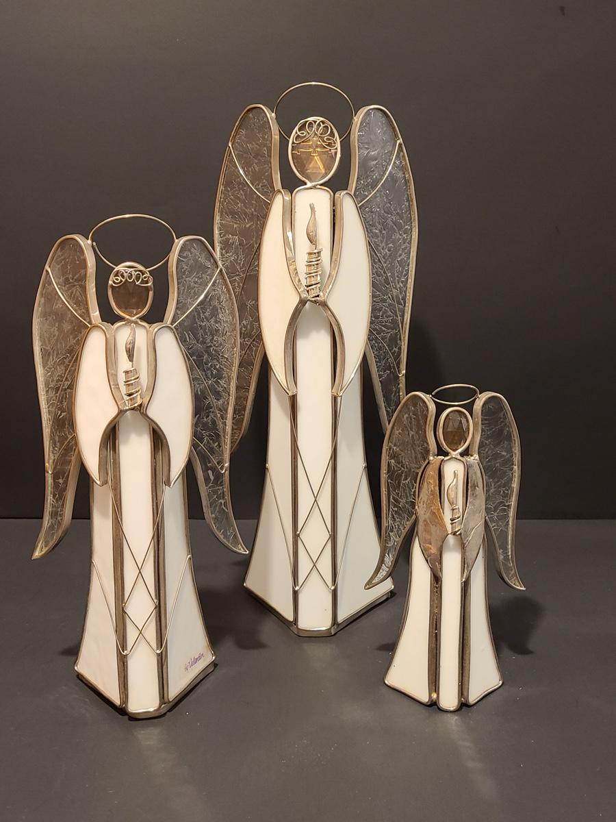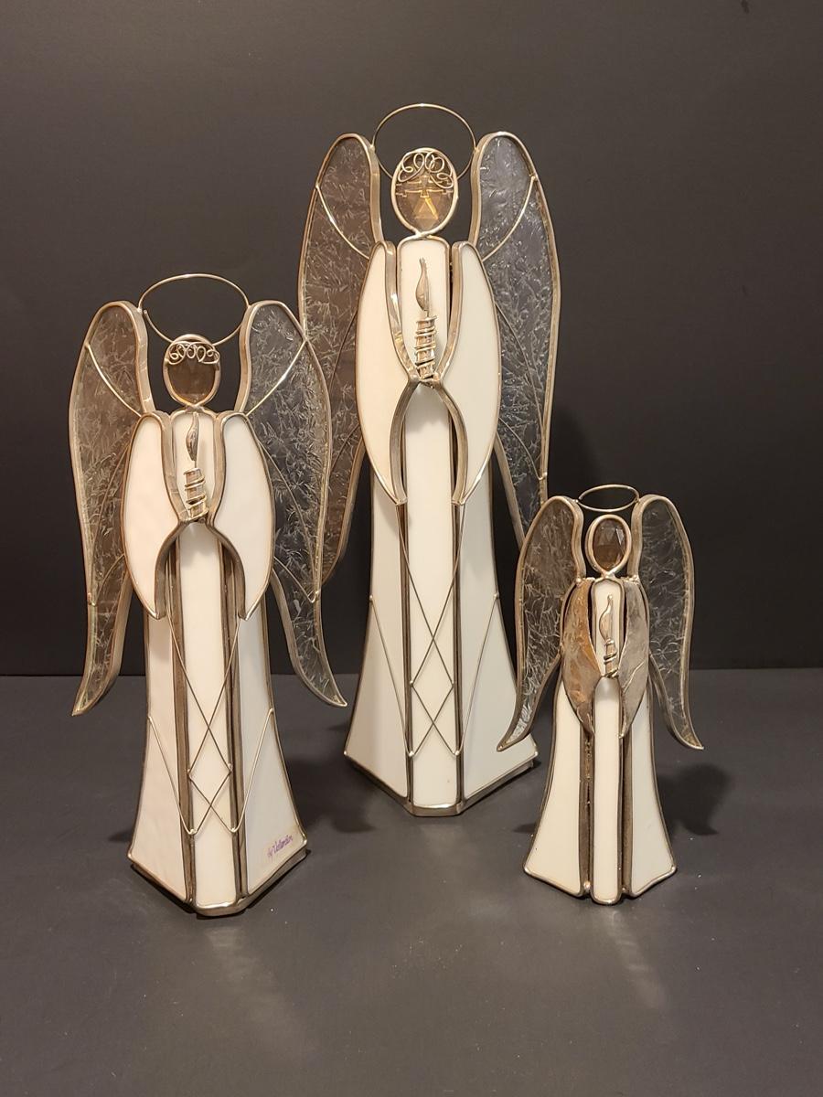 Lovely set of stained glass angels that can set in front of votive candles. There is one with small crack, but it is in the back of the piece and can't be seen because the arm overlays it. Please see all pictures. The pictures show condition, measurements if taken, and what is included in the lot. Due to the large amount that we photograph and the time frame, we are not always able to take measurements. All items unless noted, are pre-owned and have been used. If you purchased furniture, you must bring help. We do not allow one person to carry large furniture out on their own. Bring help, tools and a truck for the safety of our client’s homes, and your personal safety. Company policy. Thank you