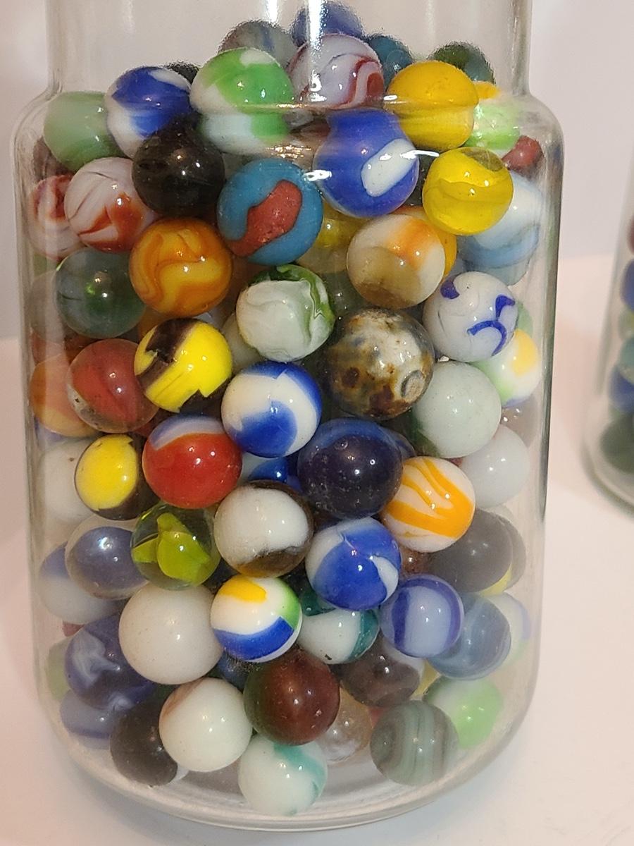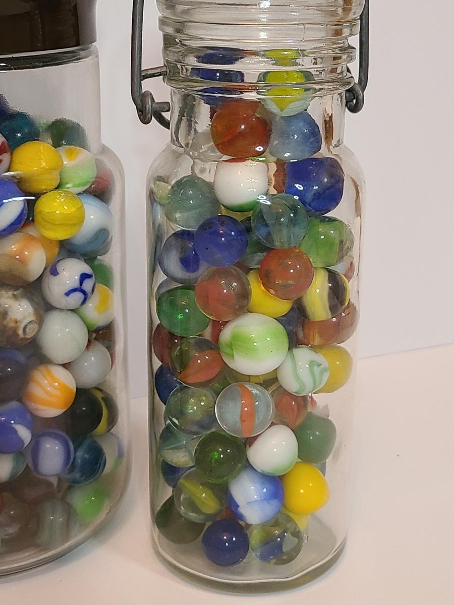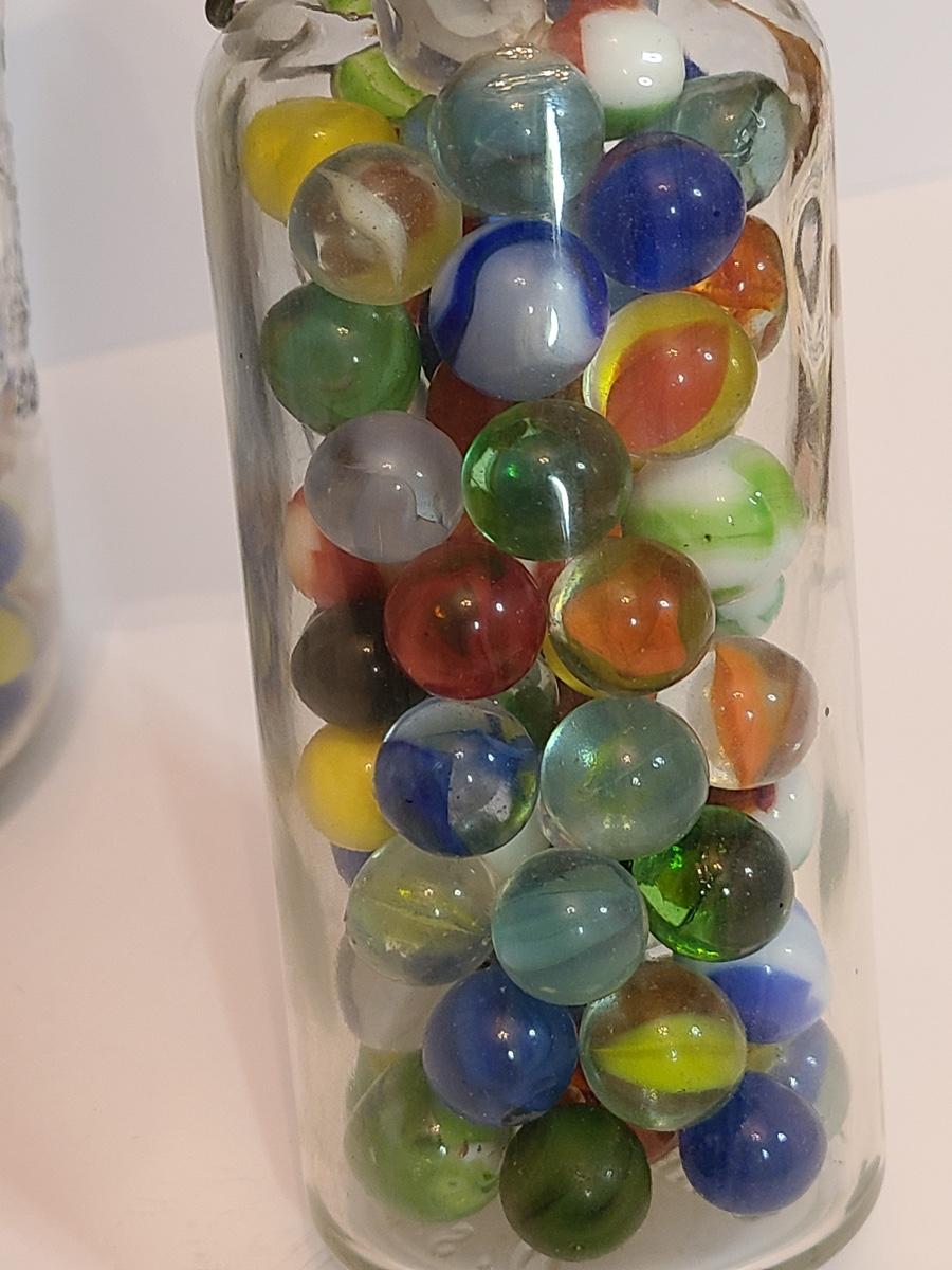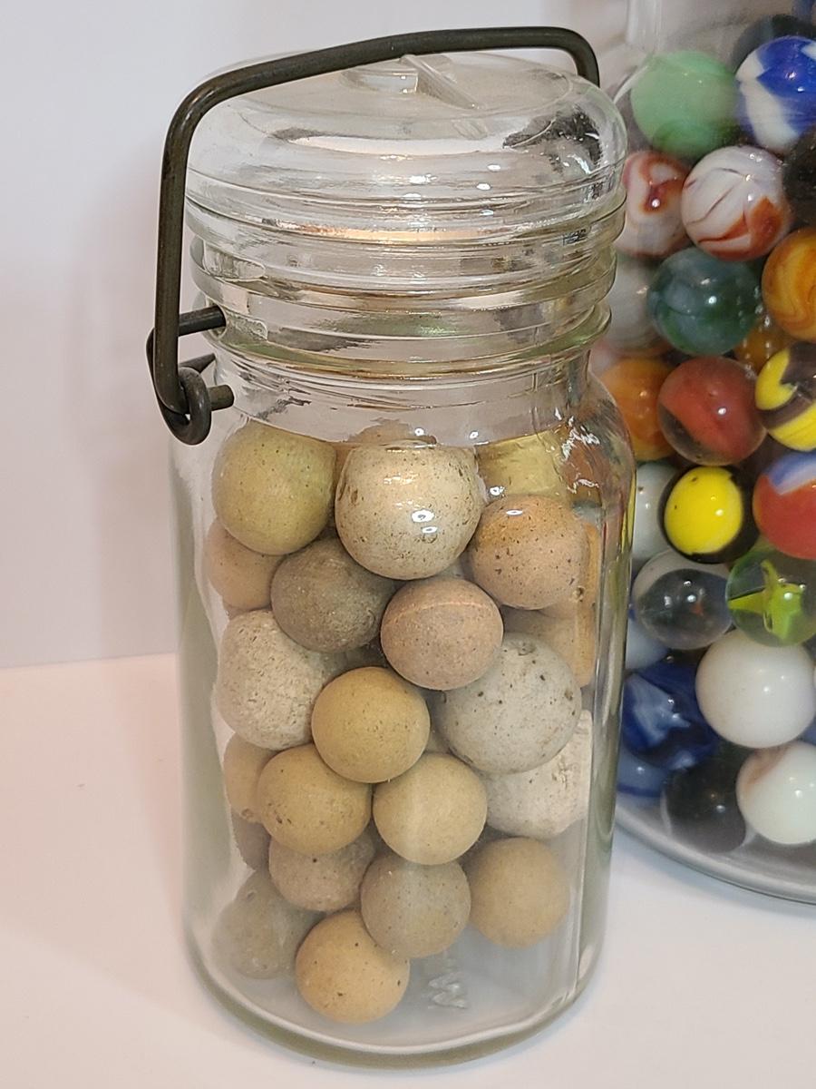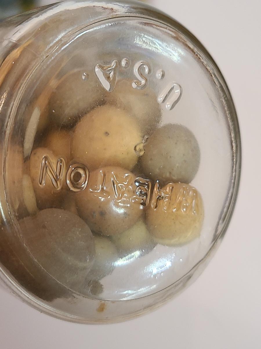 Lot 128: Vintage Clay and Glass Marbles in Wheaton Glass Jars