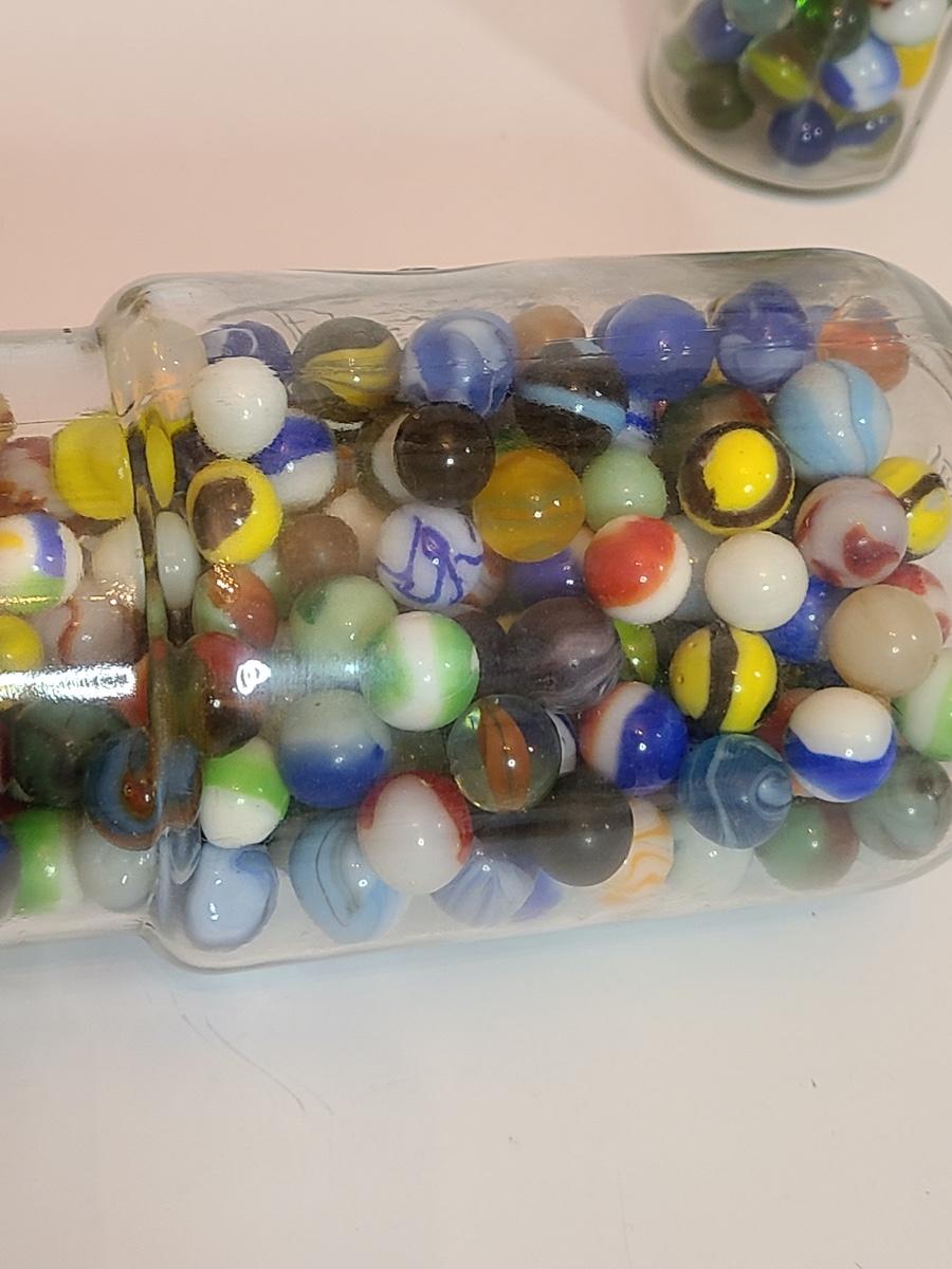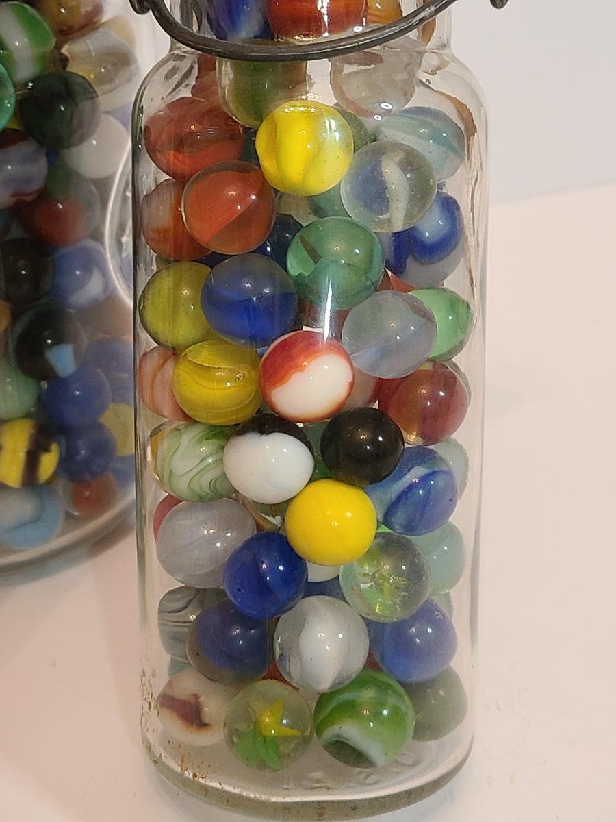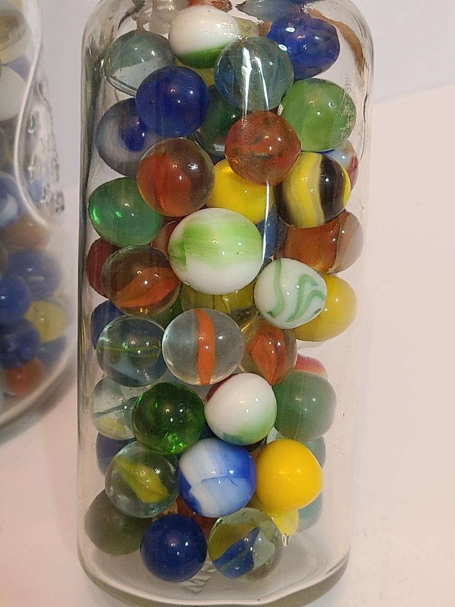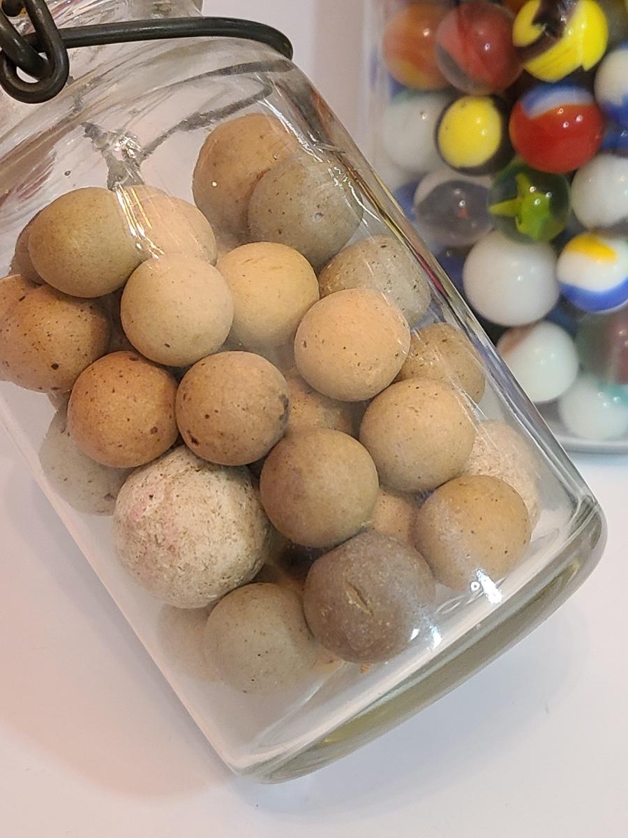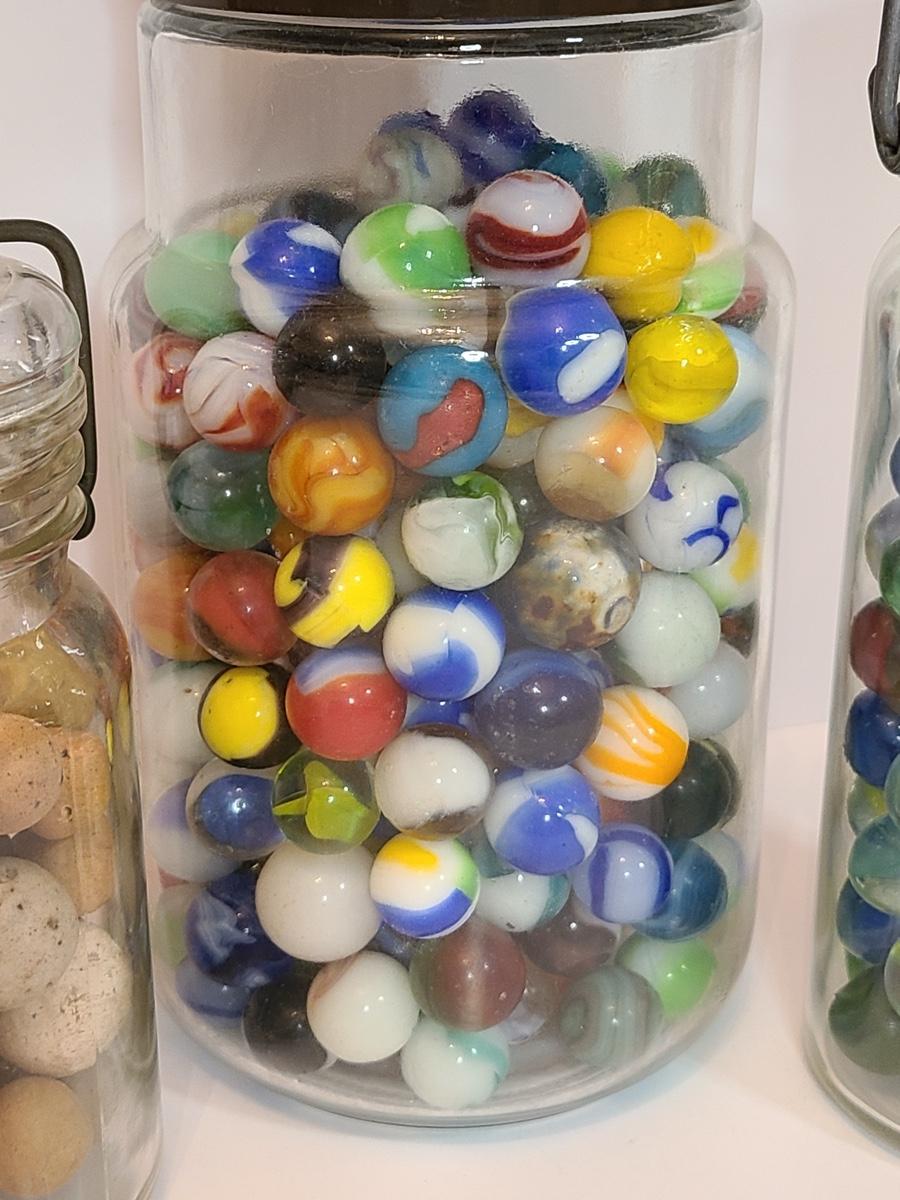Lot 128: Vintage Clay and Glass Marbles in Wheaton Glass Jars