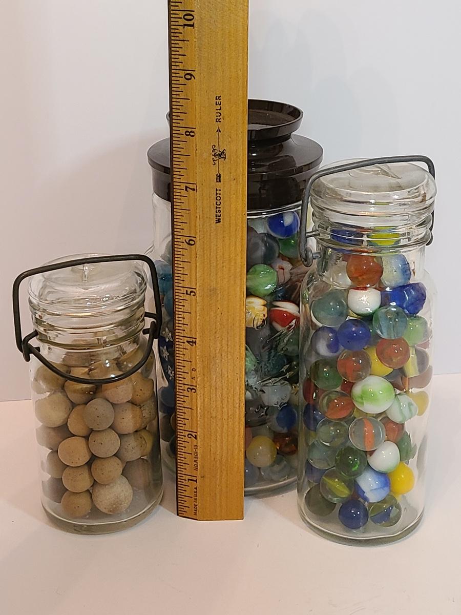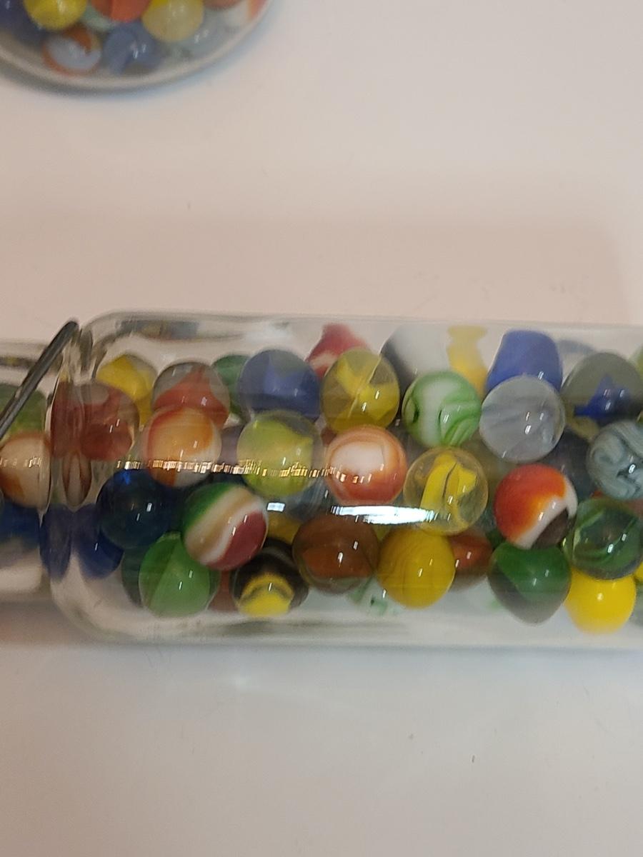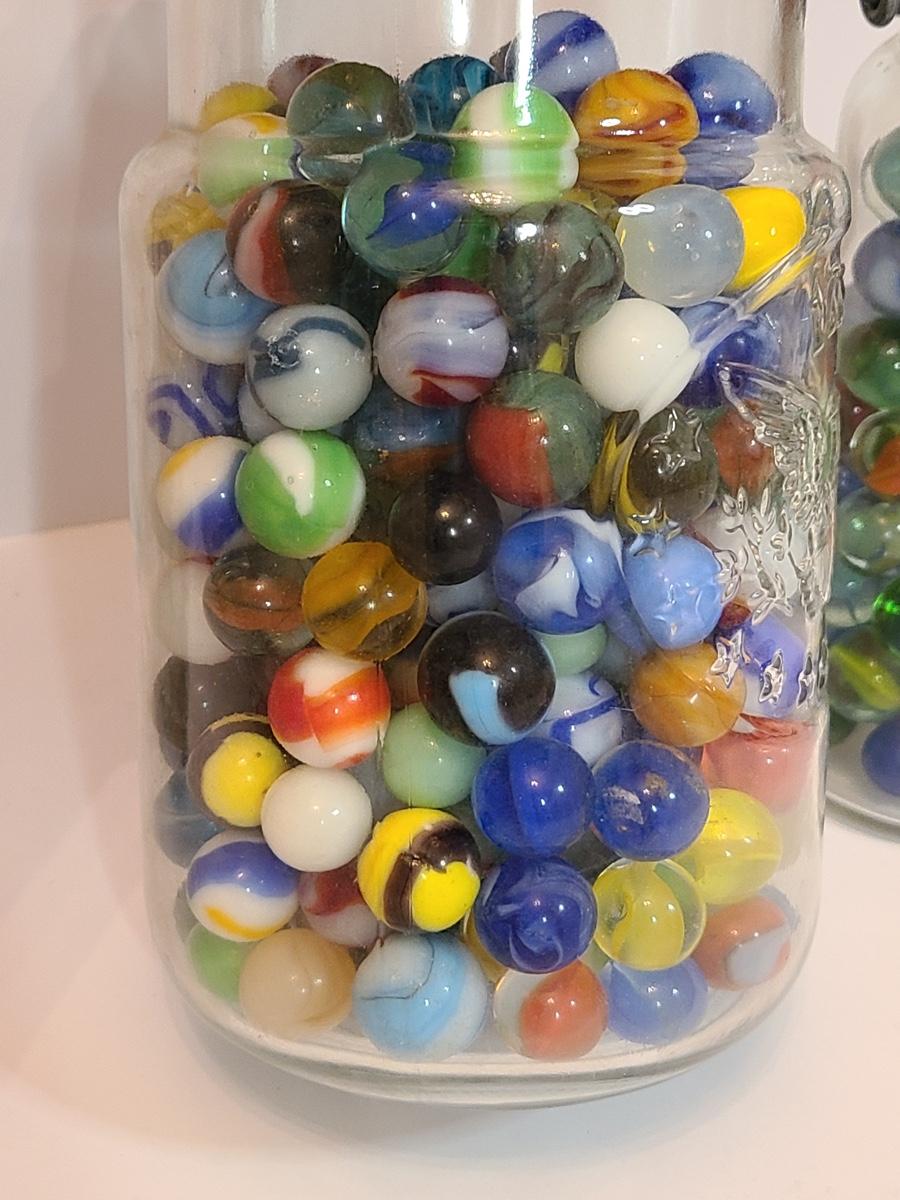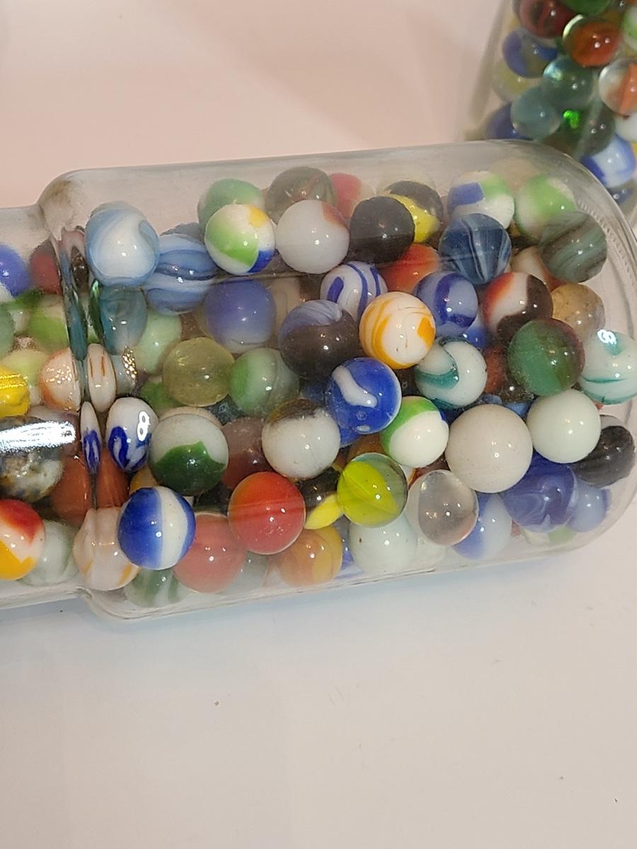 Lot 128: Vintage Clay and Glass Marbles in Wheaton Glass Jars