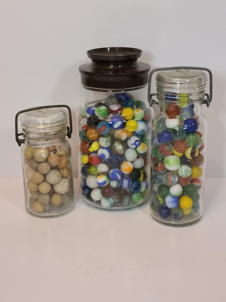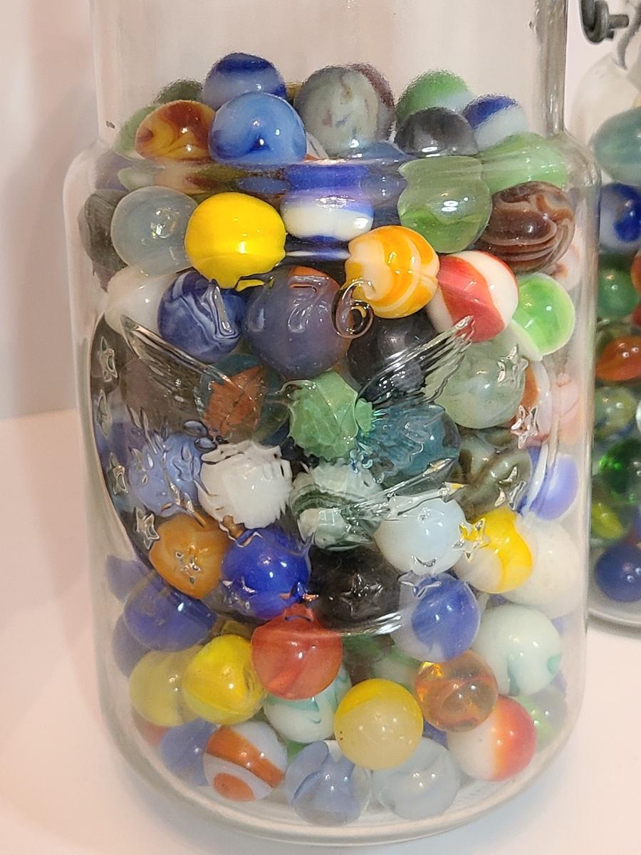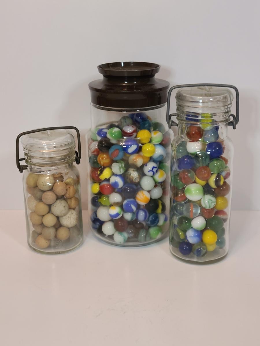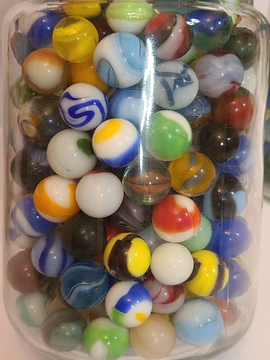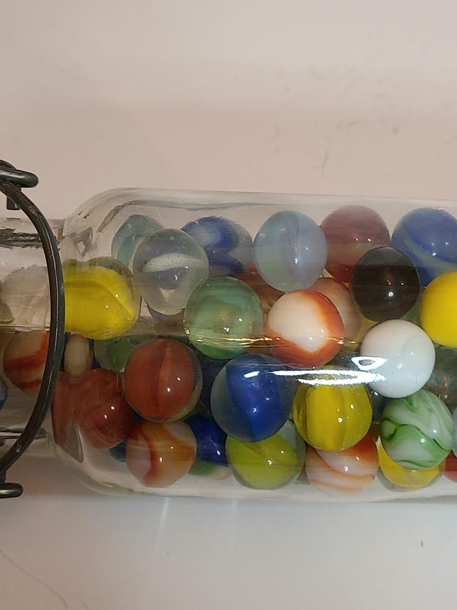 Lot 128: Vintage Clay and Glass Marbles in Wheaton Glass Jars