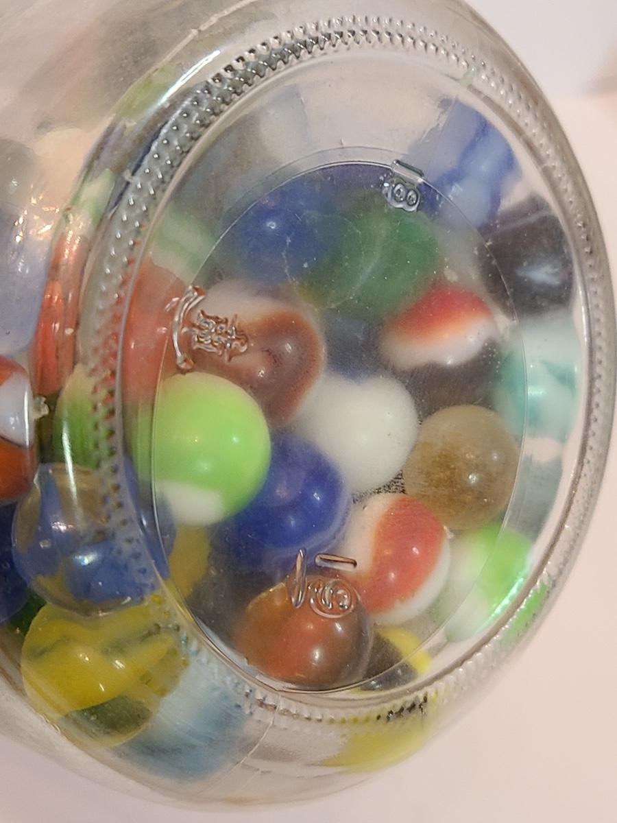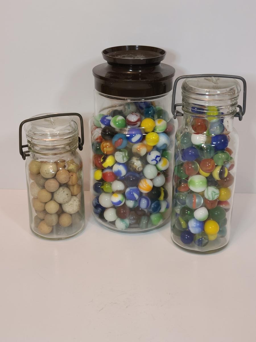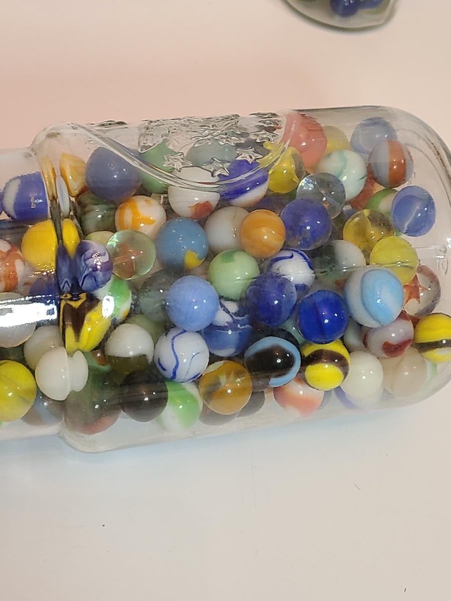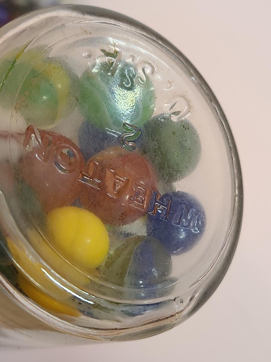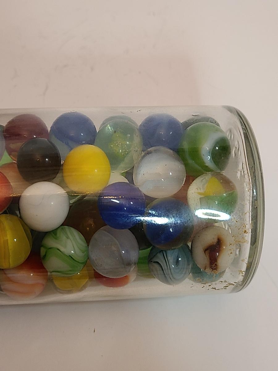 Lot 128: Vintage Clay and Glass Marbles in Wheaton Glass Jars