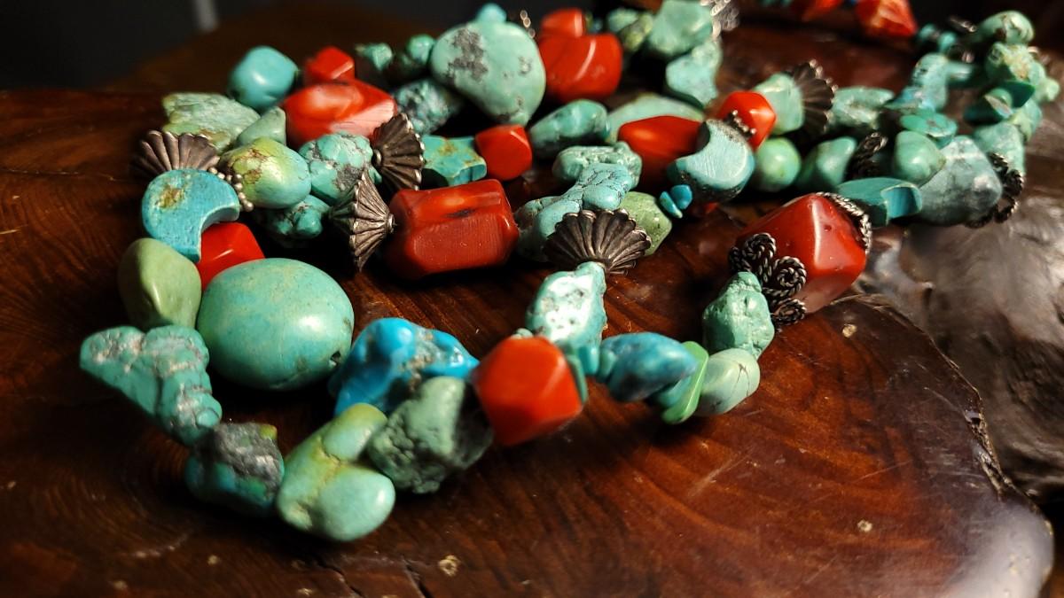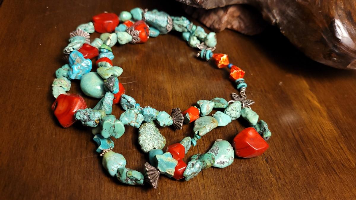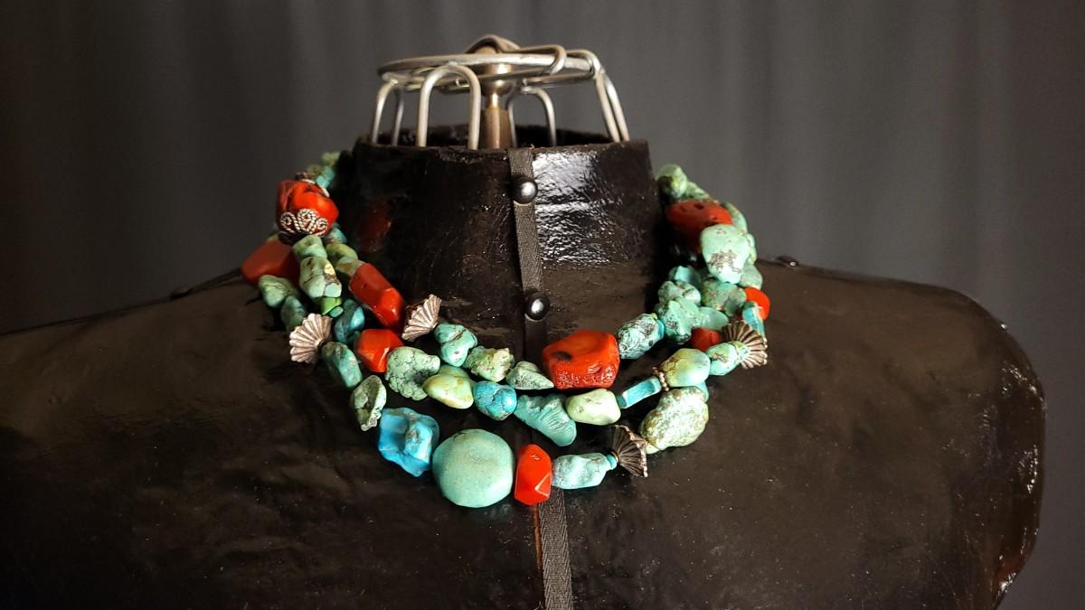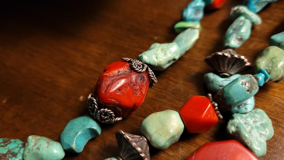 Lot 128: Vintage Raw Turqoiuse and Red Coral Triple Strand Necklace
