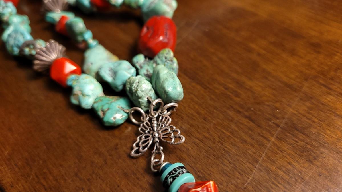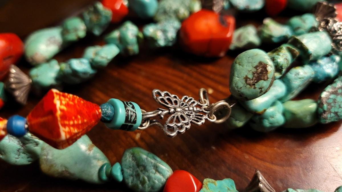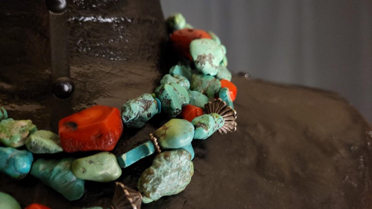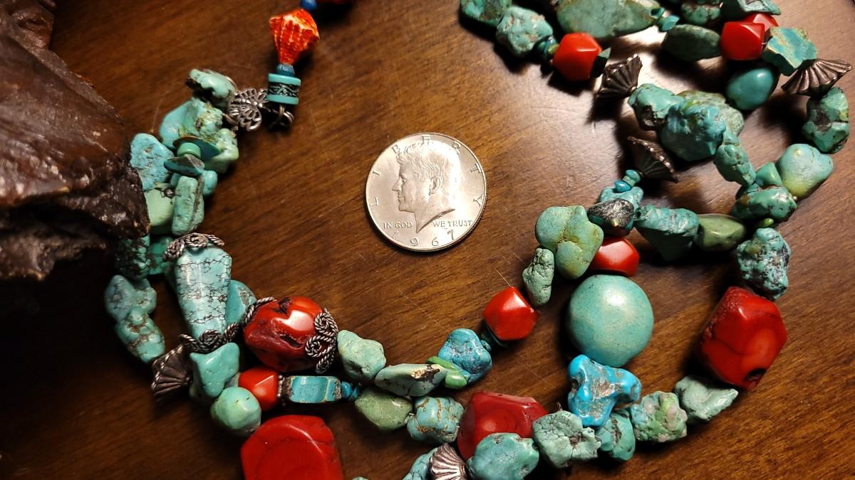 This lot features a classic Turquoise and Red Coral Raw Stone Triple Strand Fine Art Necklace. In addition to the turqoiuse and coral stones, there are other silver tone accent pieces that add touches of reflection to an already stunning piece of jewelry. Measures about 16.5" with the 2.5" built in extension. Each strand measures about 13" in length. Butterfly Clasp design feature. The half dollar shown in one of the pictures is for scale (not included in the auction).