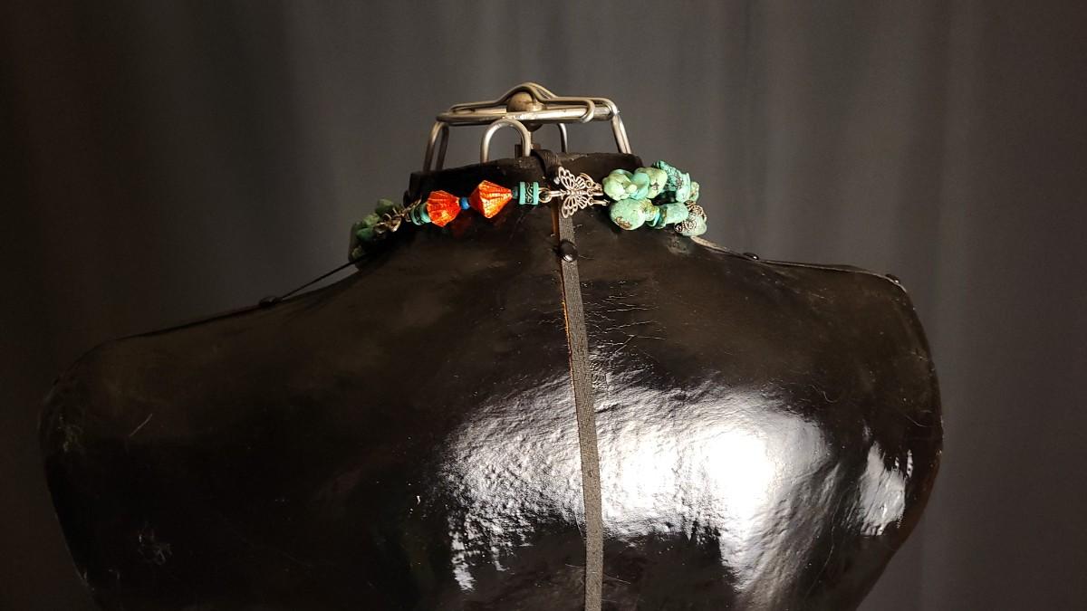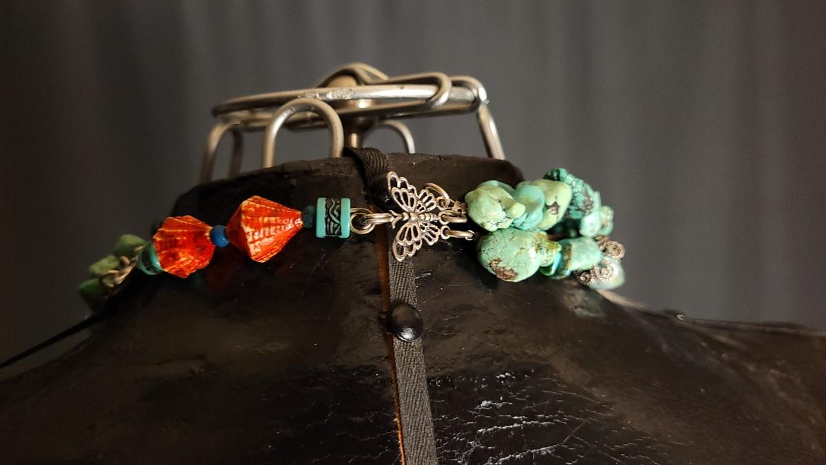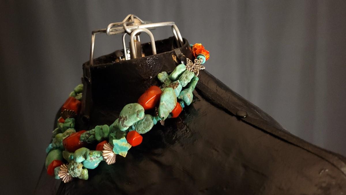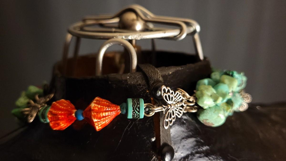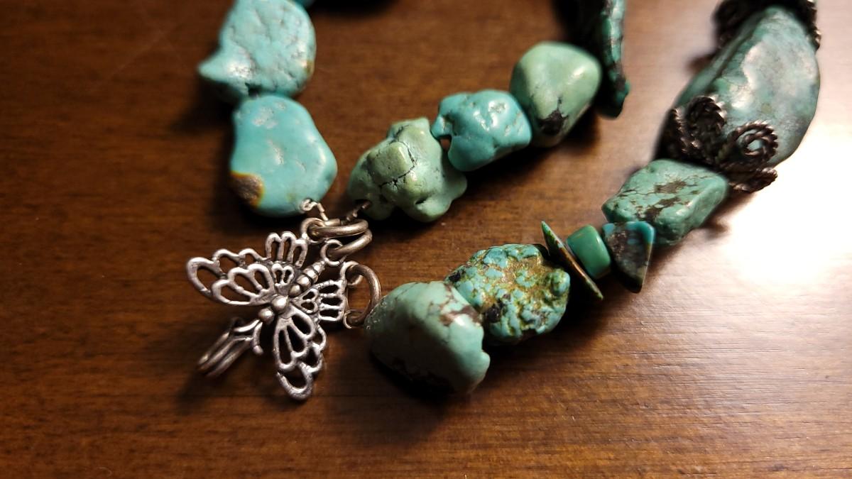 This lot features a classic Turquoise and Red Coral Raw Stone Triple Strand Fine Art Necklace. In addition to the turqoiuse and coral stones, there are other silver tone accent pieces that add touches of reflection to an already stunning piece of jewelry. Measures about 16.5" with the 2.5" built in extension. Each strand measures about 13" in length. Butterfly Clasp design feature. The half dollar shown in one of the pictures is for scale (not included in the auction).