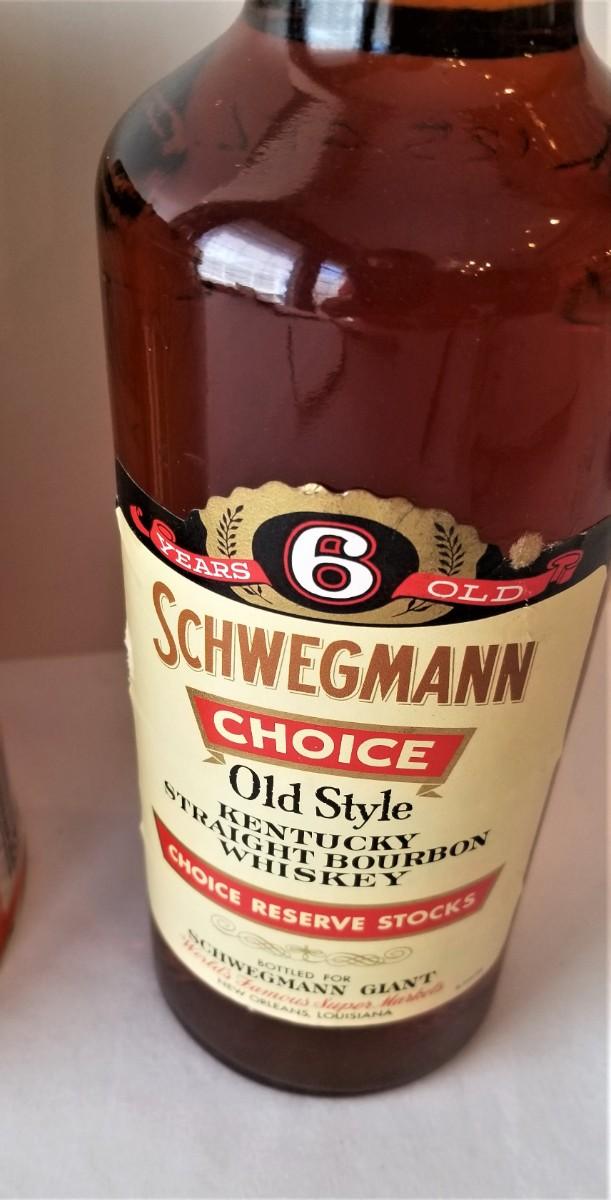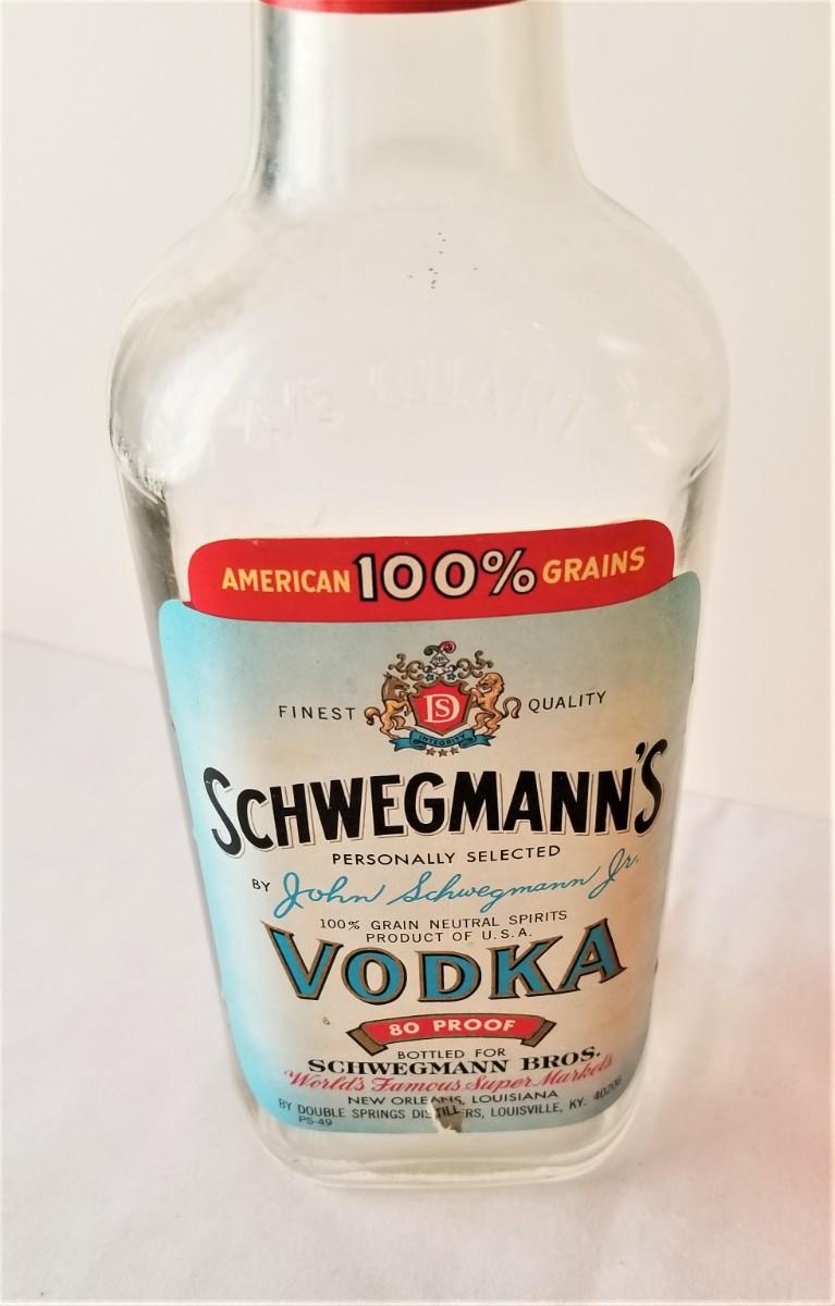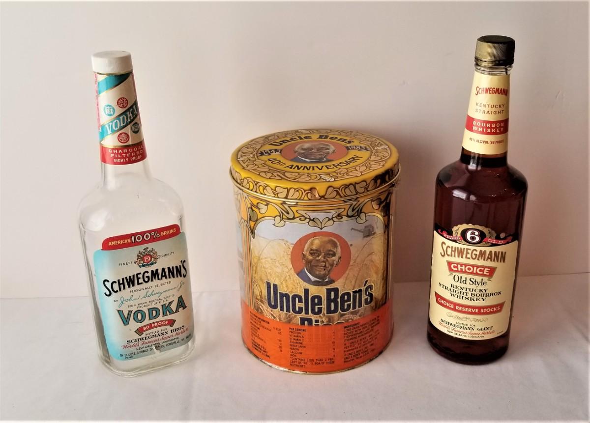 Uncle Ben's Rice 40th anniversary (1983) canister with the iconic logo (now gone) and two liquor bottles from long defunct Schwegmann's grocery (Vodka and Old Time Bourbon Whiskey). What you see is what you get.