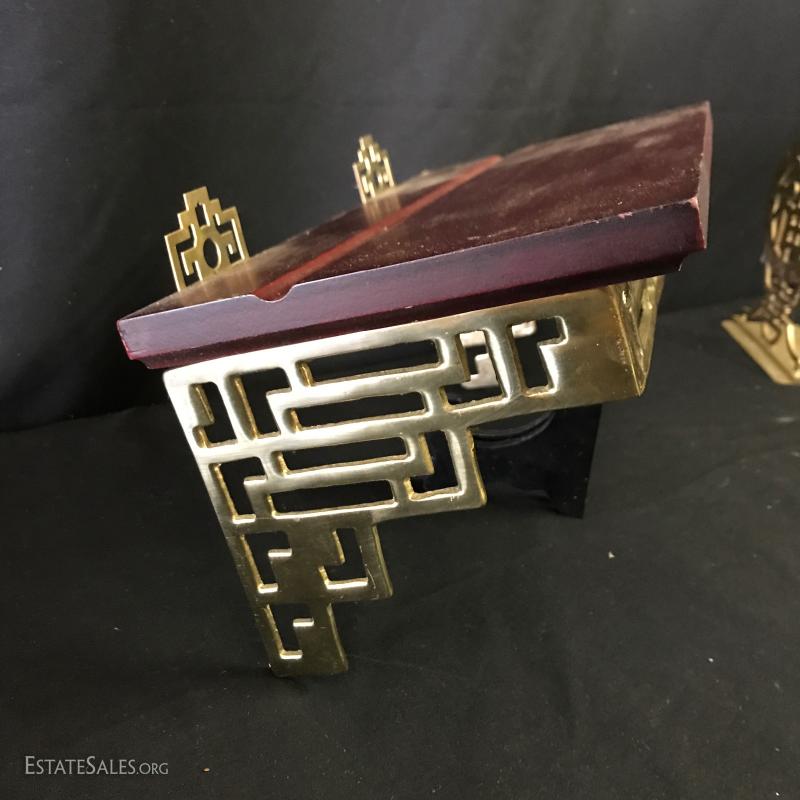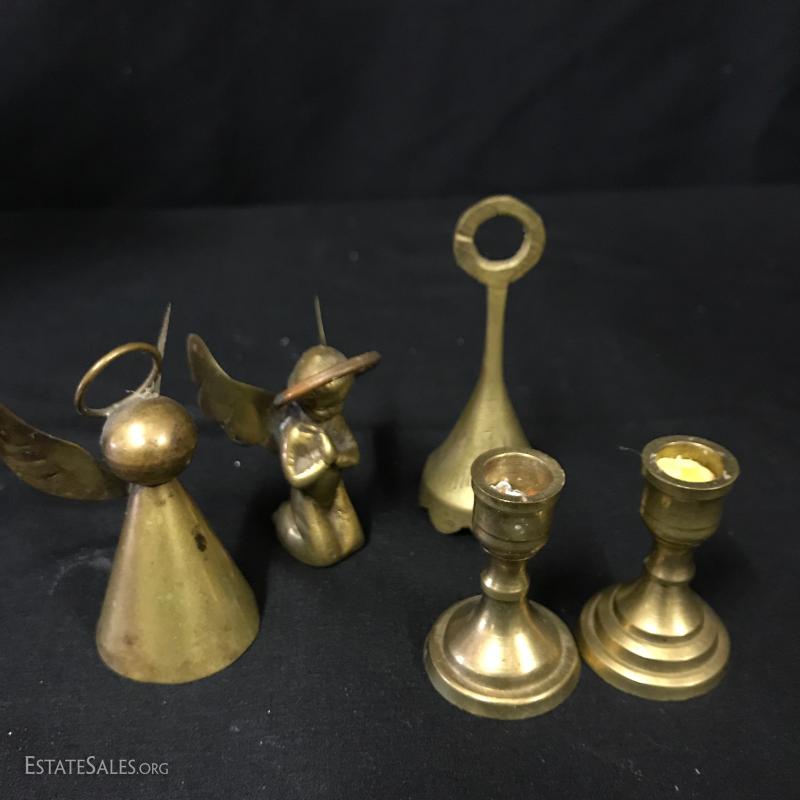 Beautiful brass and wood shelf (12.5"l x 6.5"w x 5.5"tall) to display your treasures. Brass round trivet with bird design. Artsy candle holder. Bookend. Tiny angels and candle holders. Large rectangular pot, 16.5 l x 6"w x 5"tall. Shipping available or local pick up in Waynesville, NC.