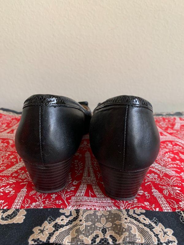 Black patent leather uppers w/bow detail & stacked wedge heels. Size 9