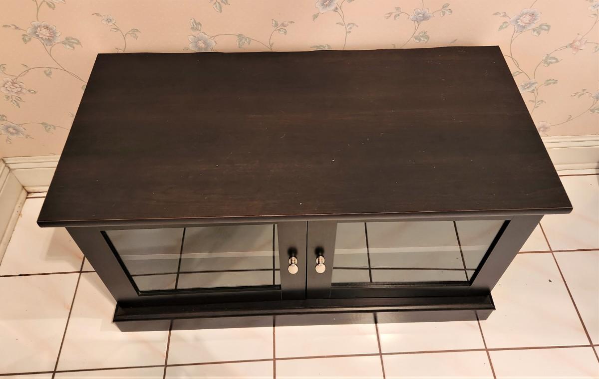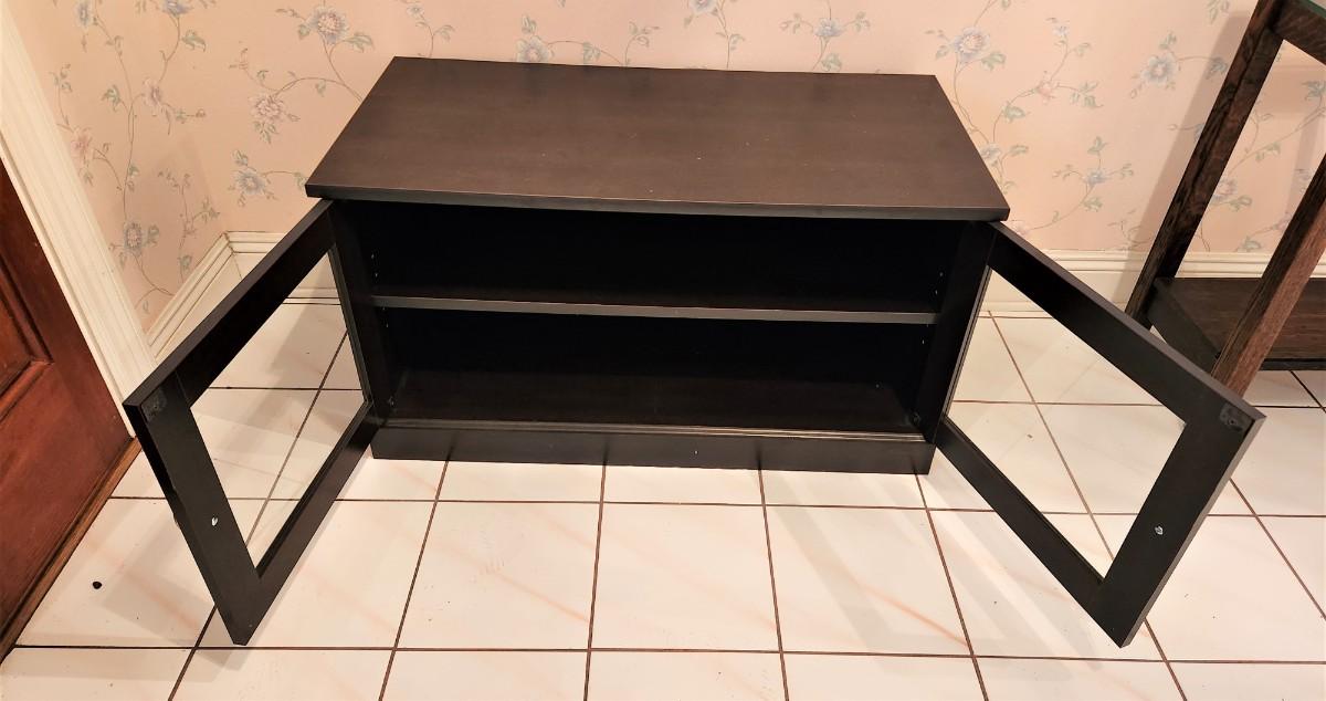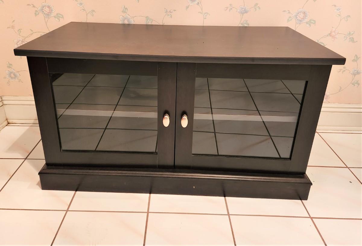 Contemporary cabinet/media stand. Glass front. 2 shelves. 17.5" deep, 3 feet across, 19" tall. Good condition.