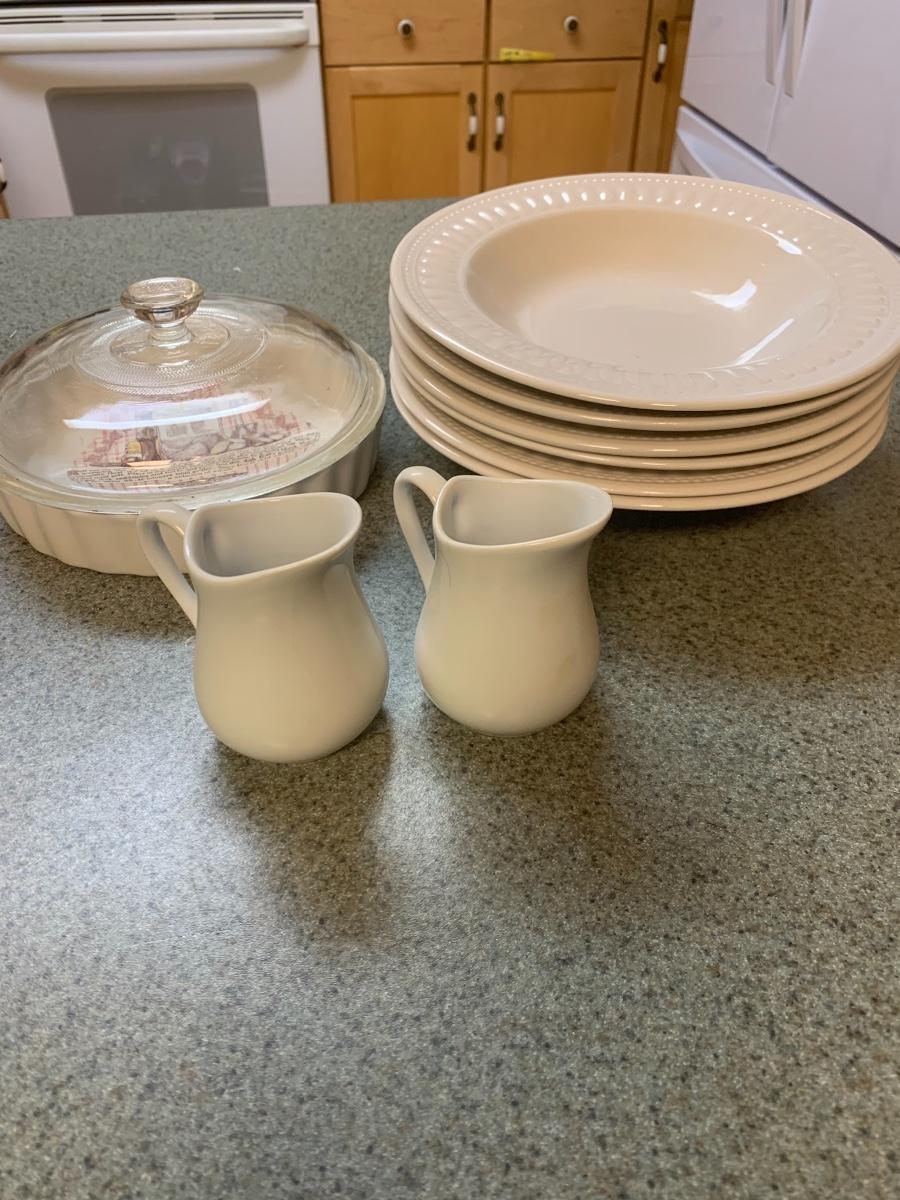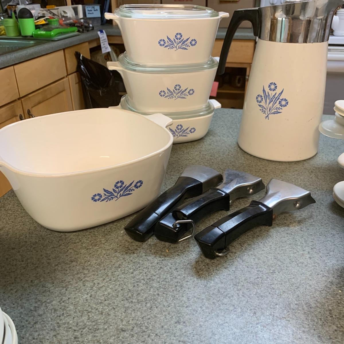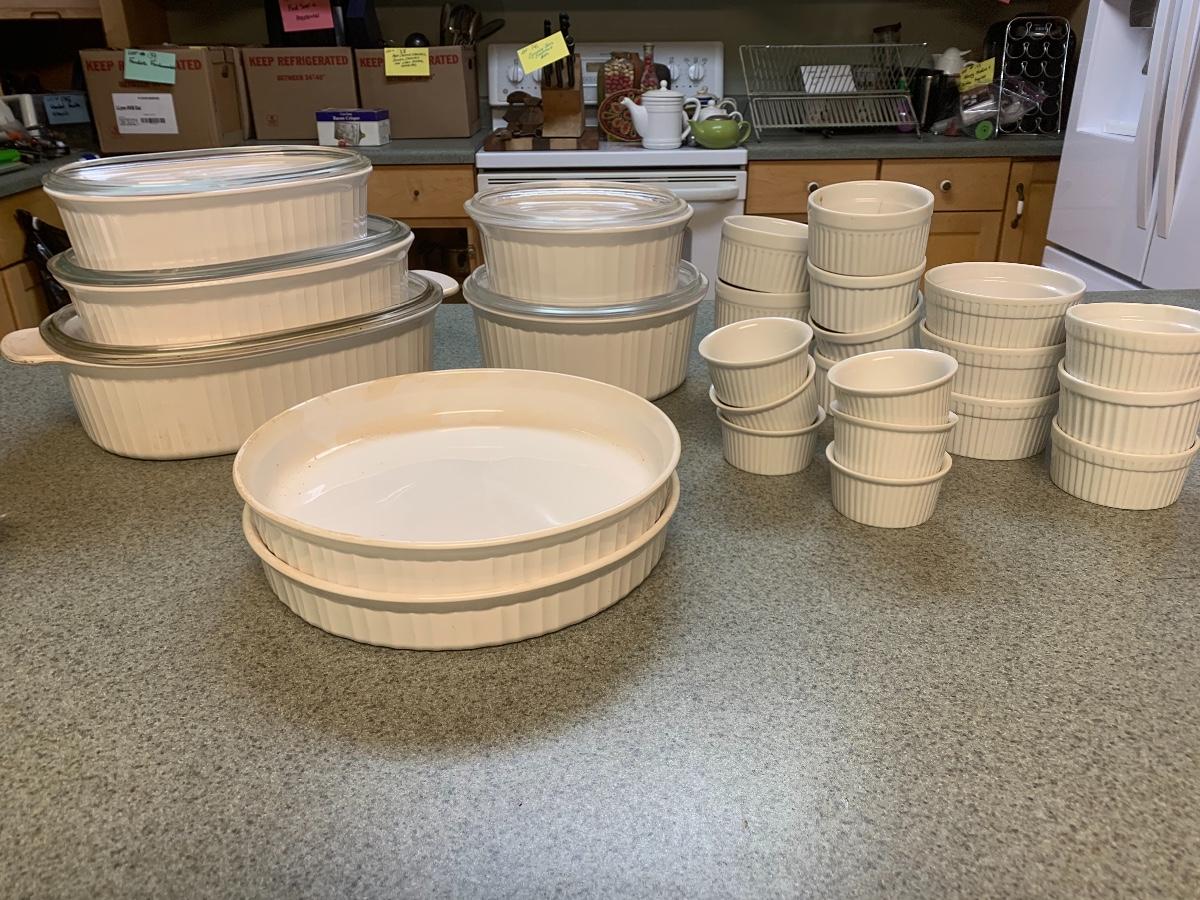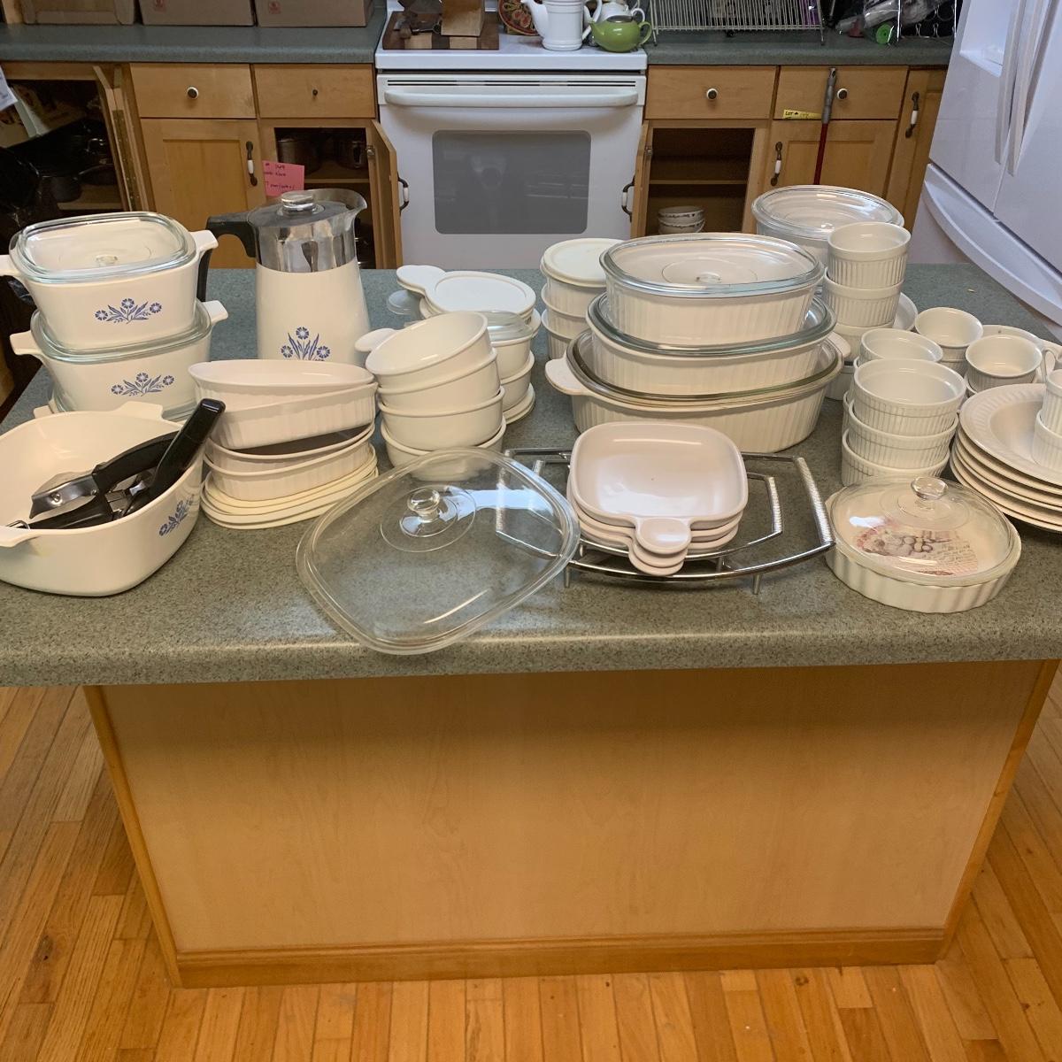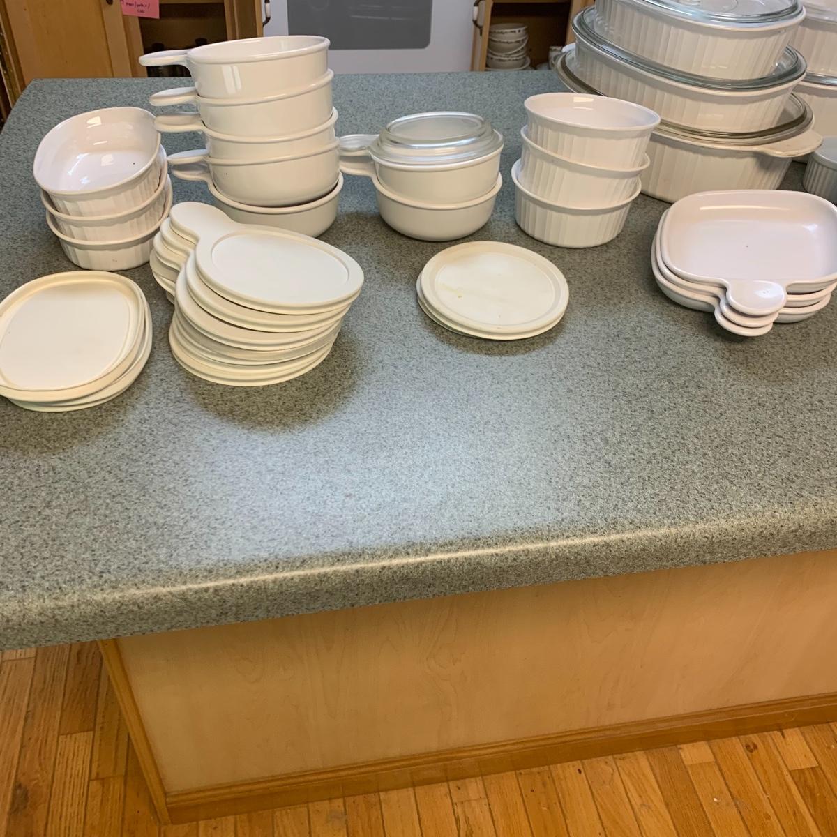 This large lot of mostly white Corning pieces does have five Blue flower pieces. There are multiple ramekins of different sizes, casserole dishes soup bowls with some lids and small platters. A few extra non Corning pieces are two small creamers, and six shallow soup bowls and a sweet tartlet with a recipe for ham and mushroom flan on it. Hope you have some cabinet space for this large lot of goodness. Local pick up only.