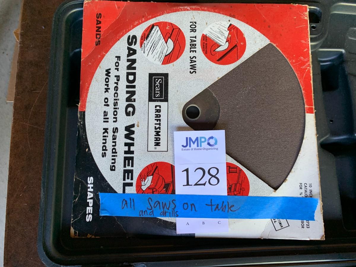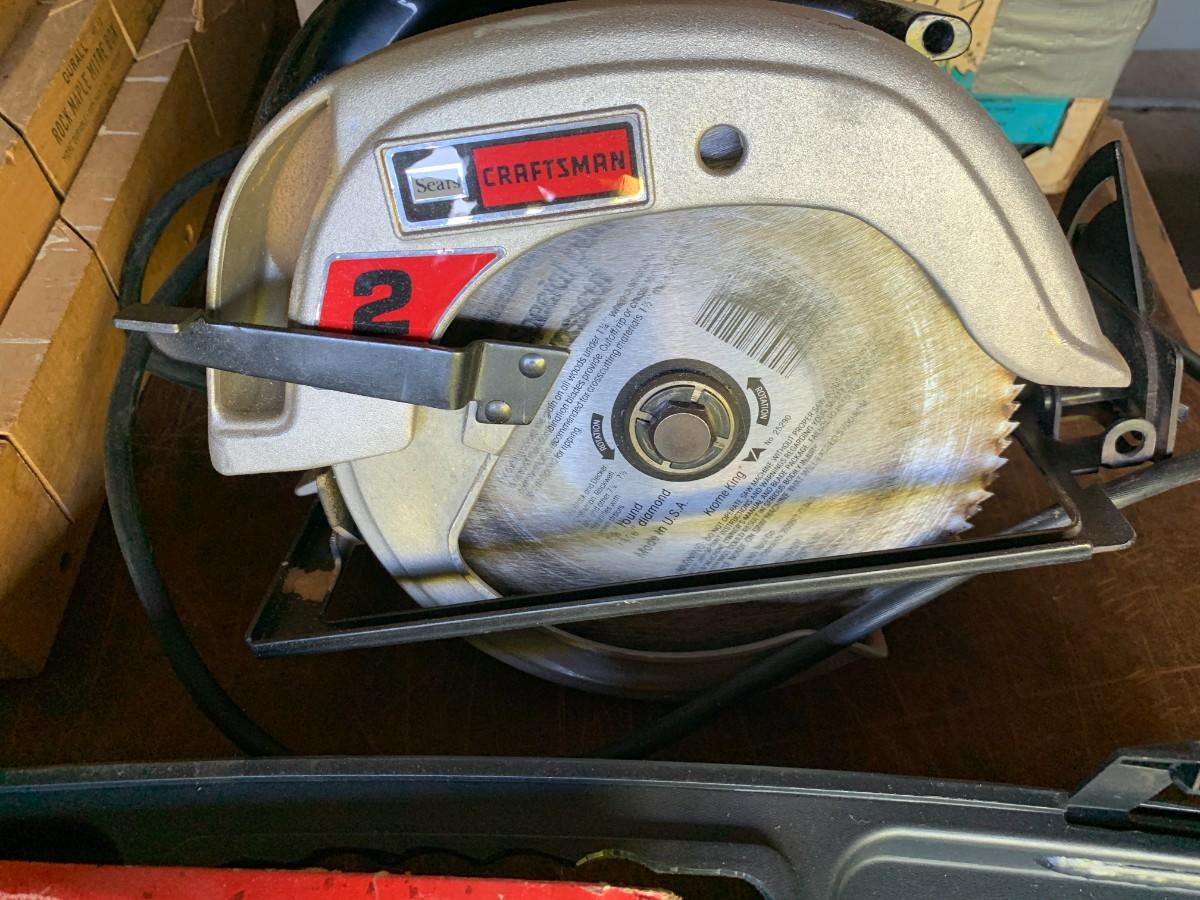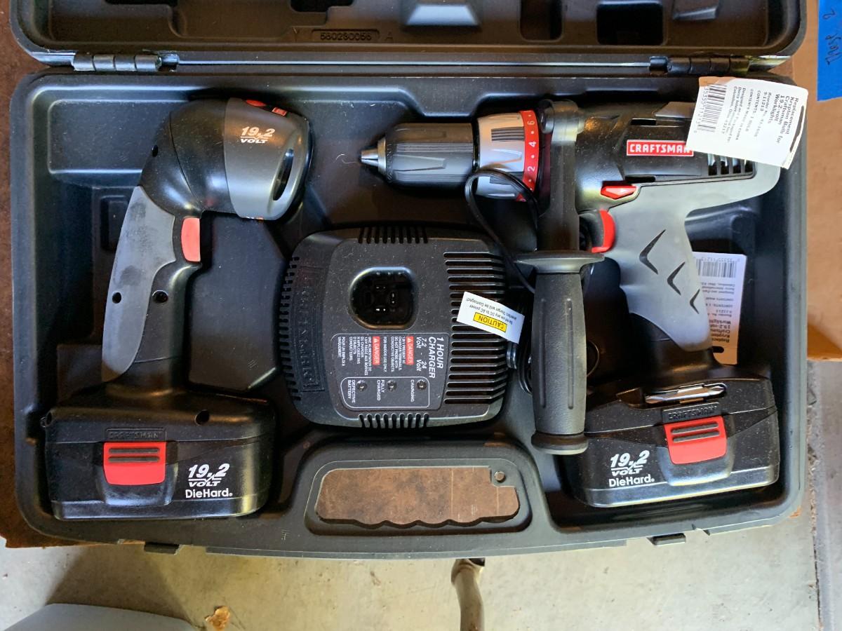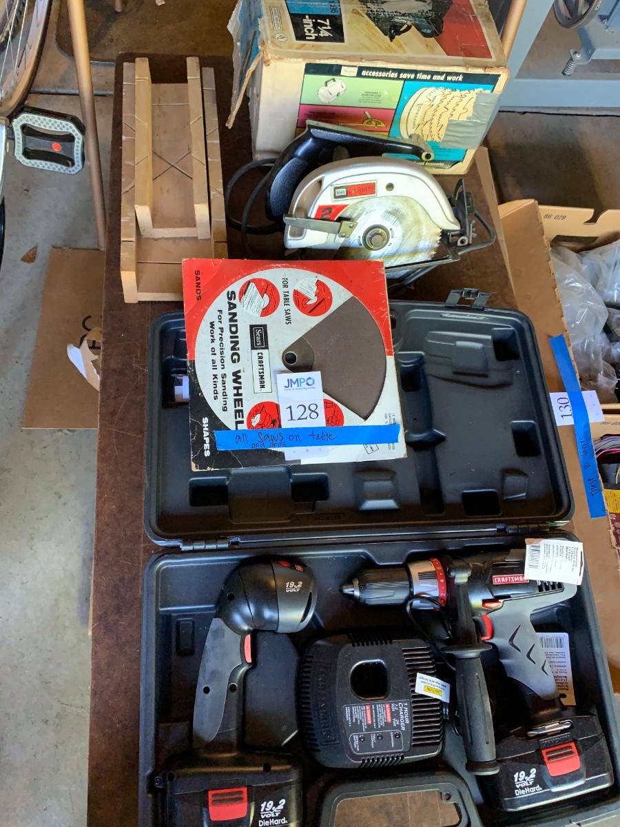 Craftsman 19.2V DieHard rechargeable battery (2) with charger, drill and worklight. Craftsman powered hand saw with original box, miter block. Table saw sanding wheel. Not tested.