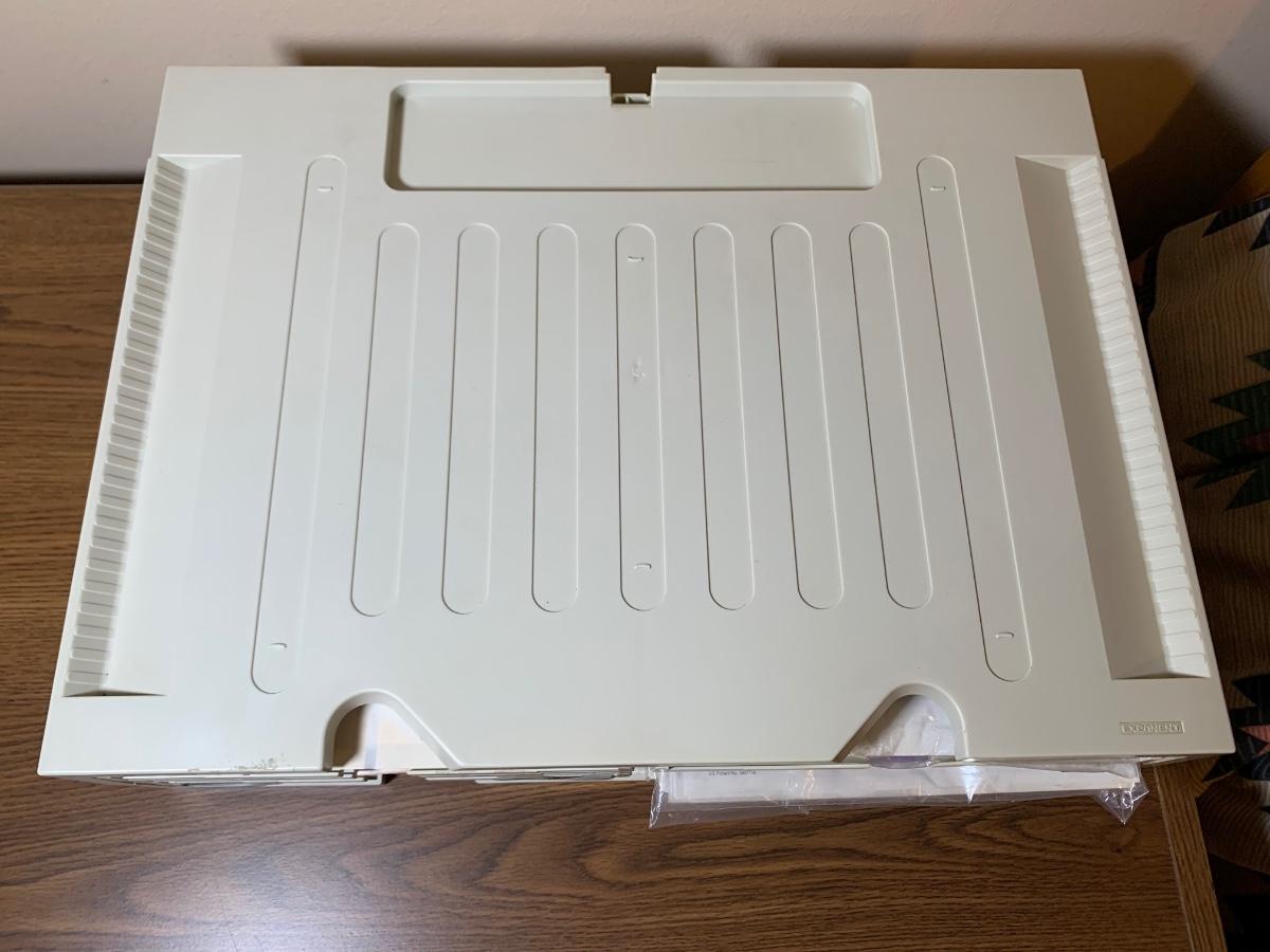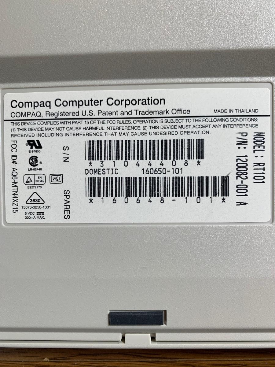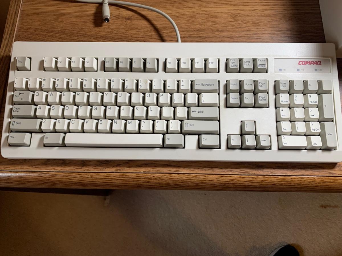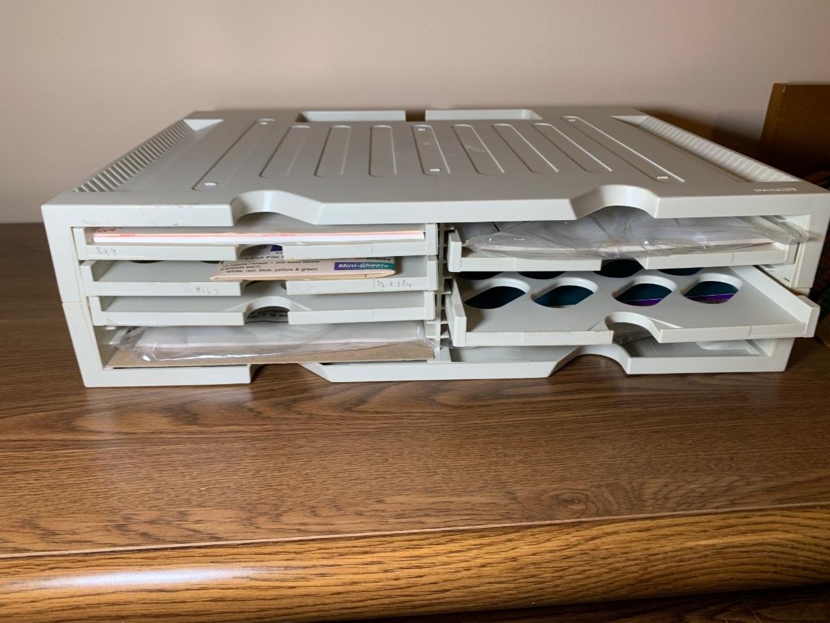 Plastic desktop organizer has 7 trays 20" x 14 1/2" x 5". Compaq Computer keyboard Model RT101