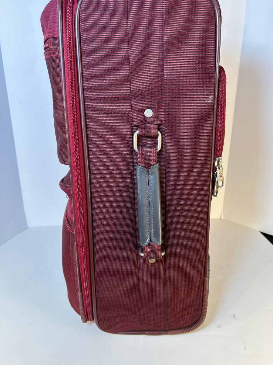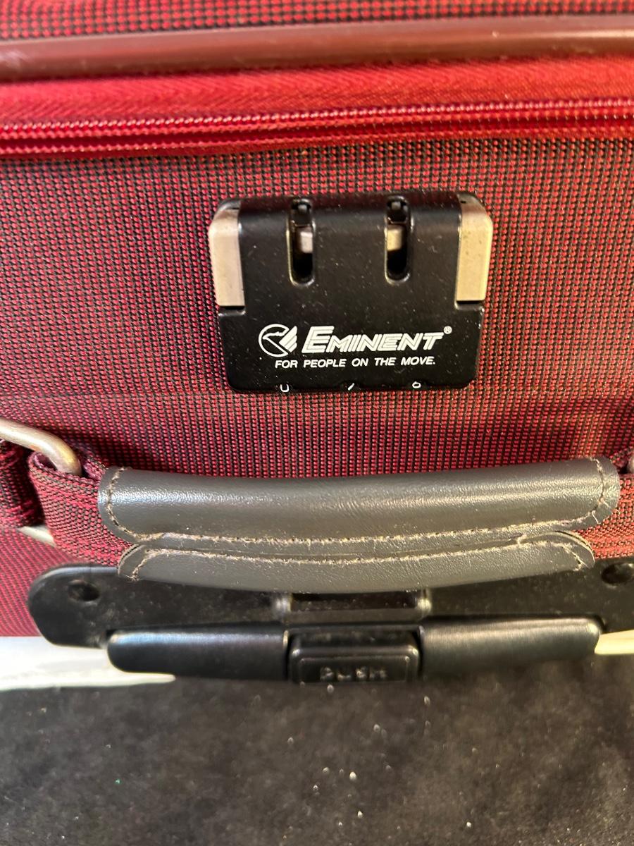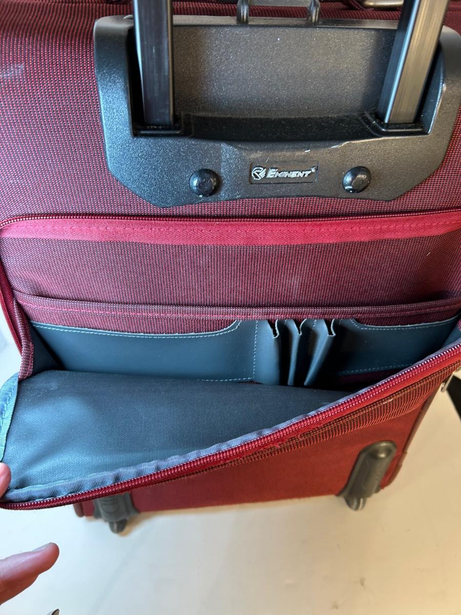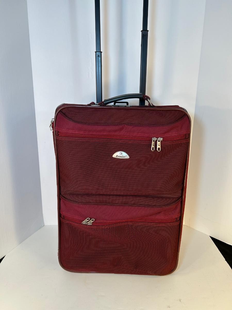 20" x 14" x 9" Eminent expandable burgundy rolling suitcase.