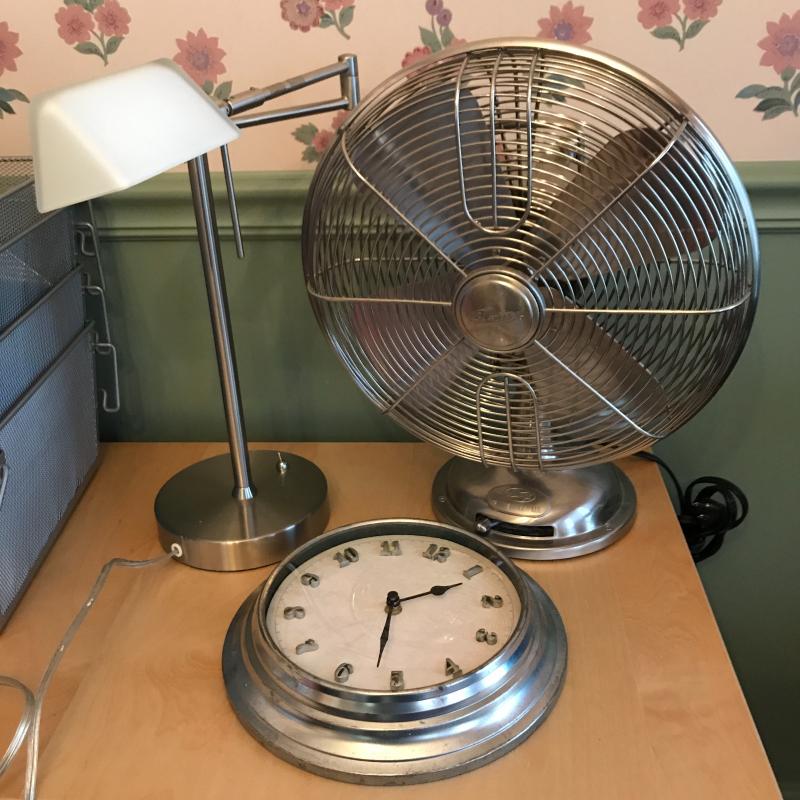 Century oscillating table fan with adjustable speeds. Battery operated wall clock. Tabletop light with adjustable arm. No shipping. Local pick up only in Flat Rock, NC.