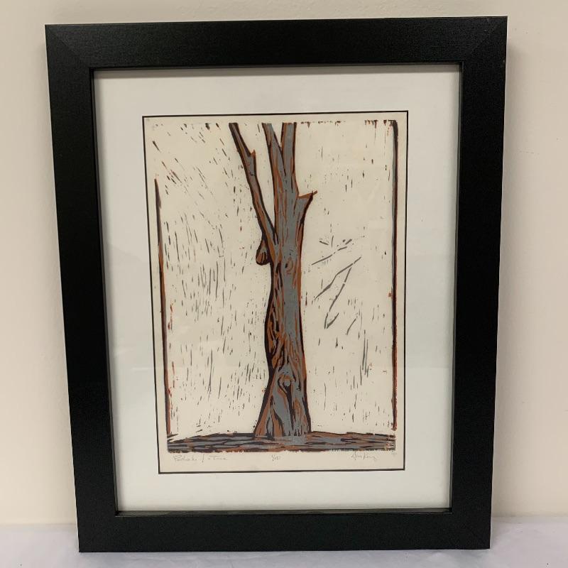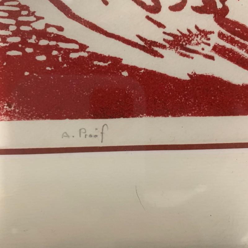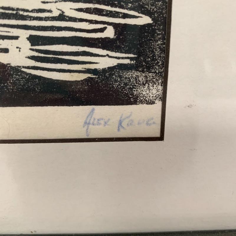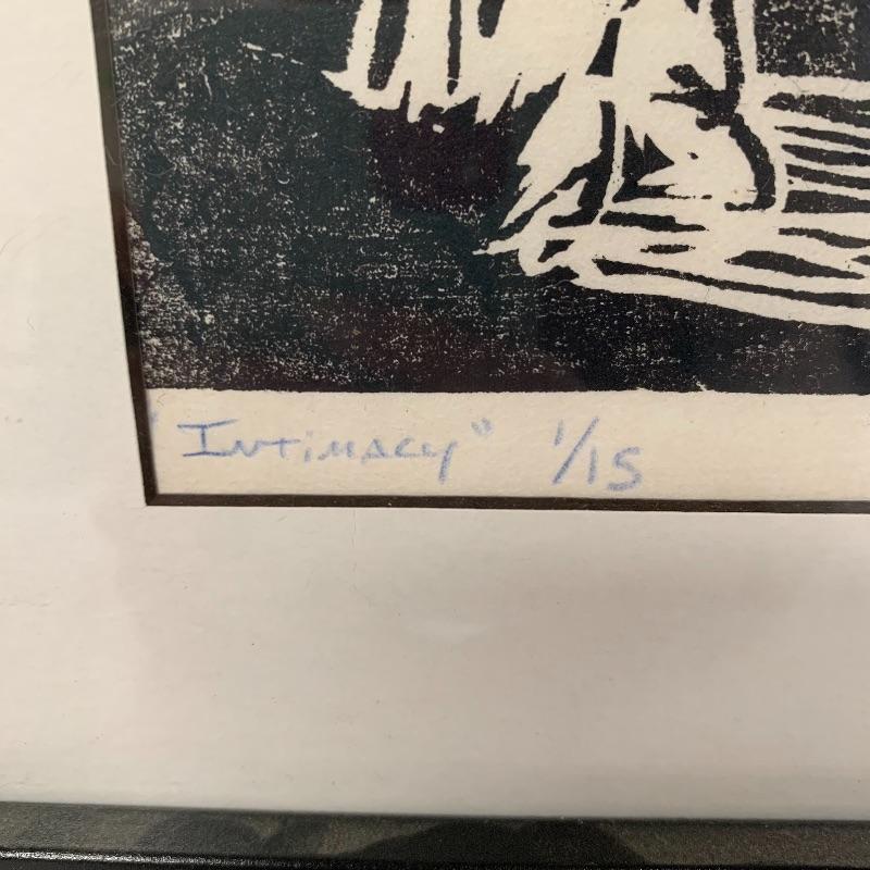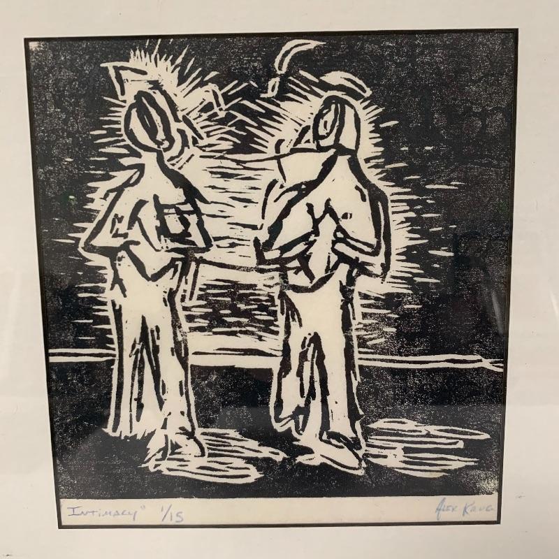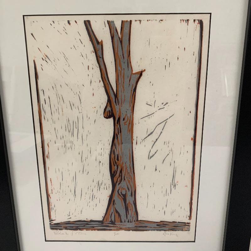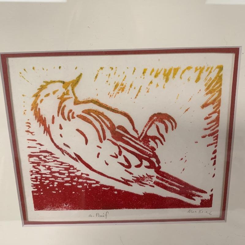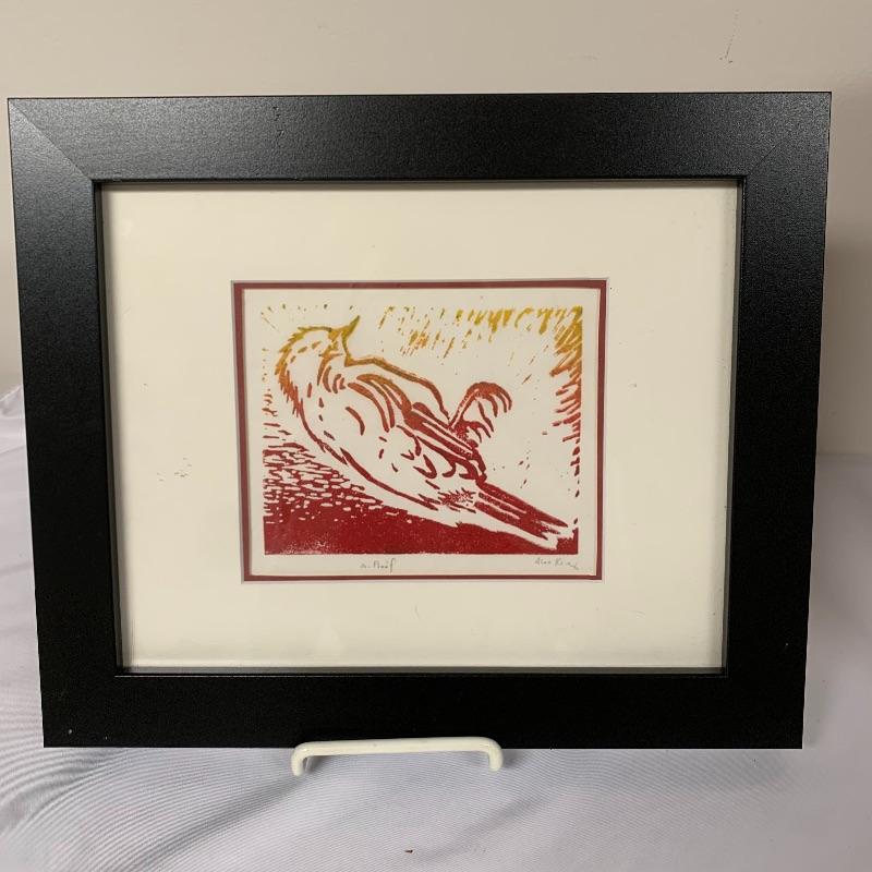 This lot includes four framed block prints behind glass. The artist, Alex Krug, signed all of them and all but the bird are numbered. The smallest measures 12in x 10in is the red and orange bird print. The print named “Violinist” is numbered 5/7, the print named “Intimacy” is numbered 1/15, the largest print is called “Portrait of a Tree” is numbered 1/10. It measures about 16in x 13in.