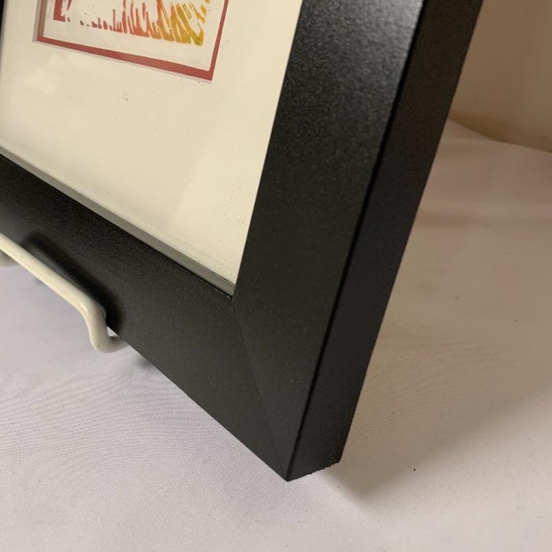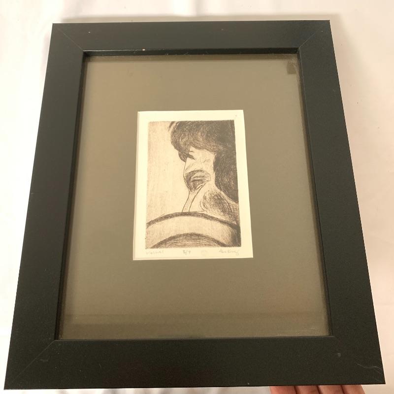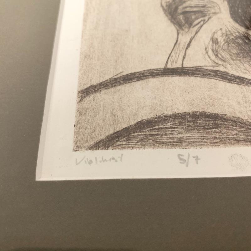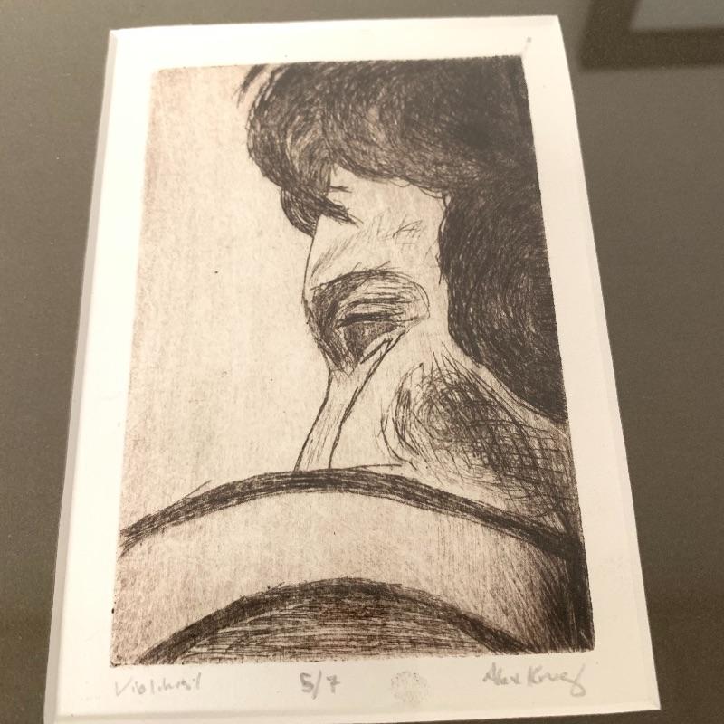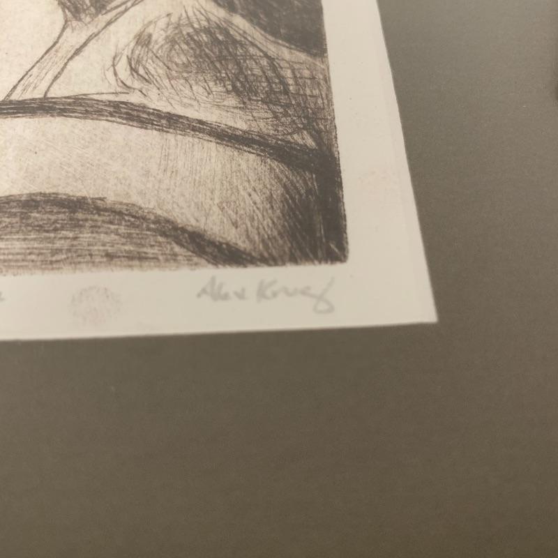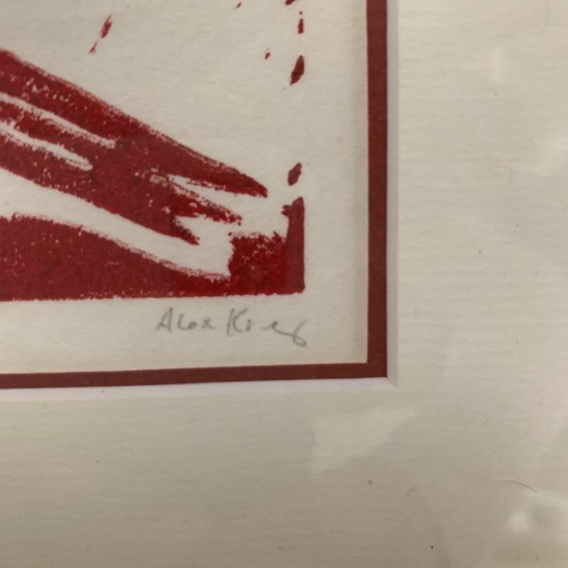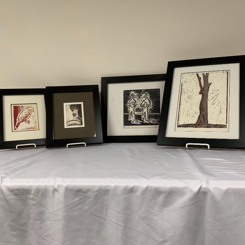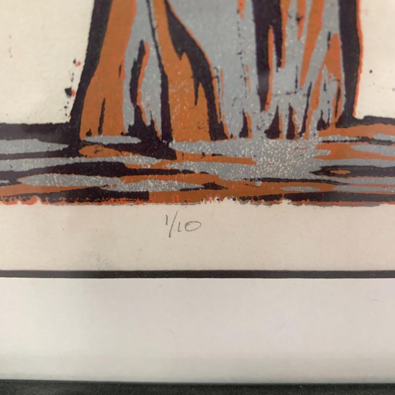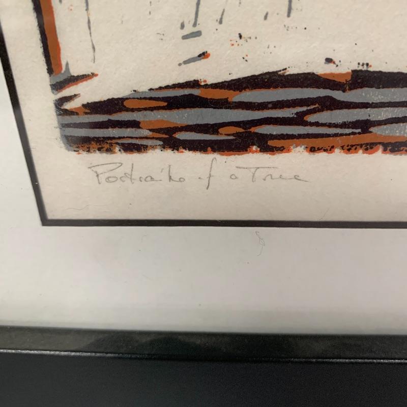 This lot includes four framed block prints behind glass. The artist, Alex Krug, signed all of them and all but the bird are numbered. The smallest measures 12in x 10in is the red and orange bird print. The print named “Violinist” is numbered 5/7, the print named “Intimacy” is numbered 1/15, the largest print is called “Portrait of a Tree” is numbered 1/10. It measures about 16in x 13in.