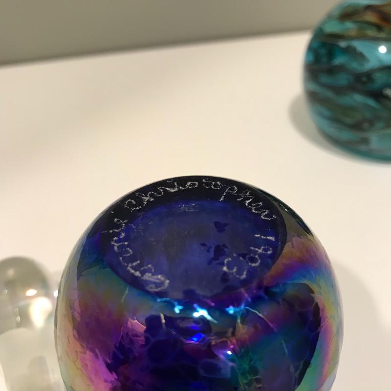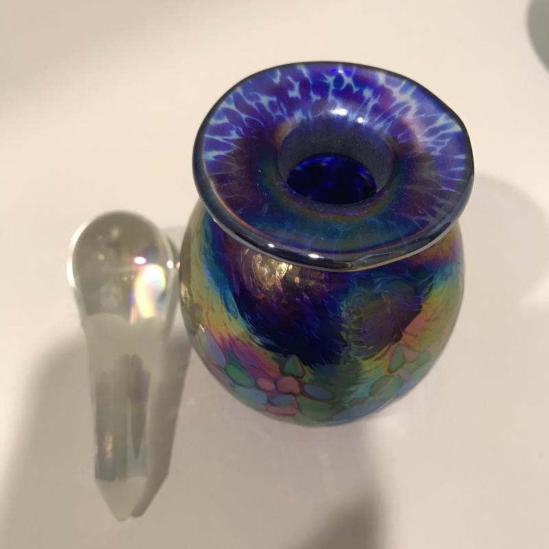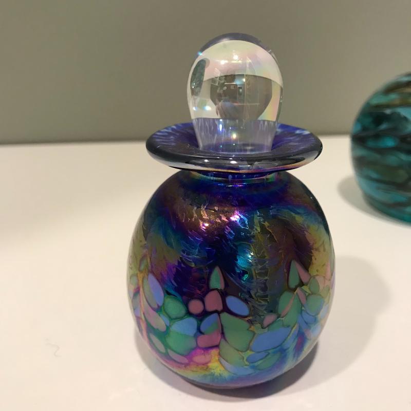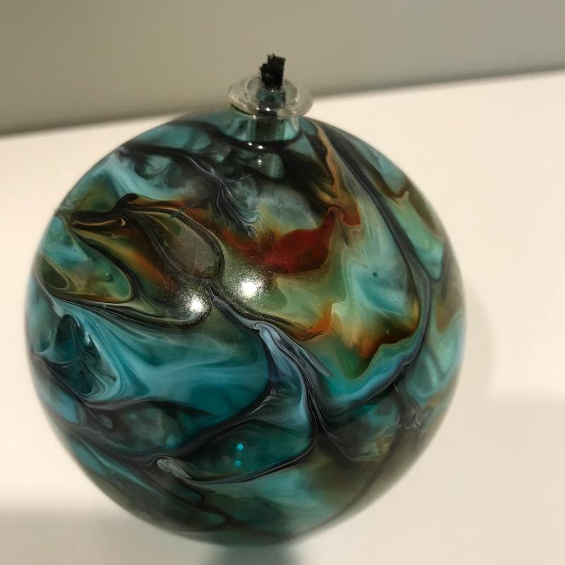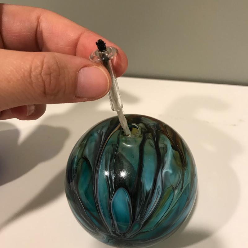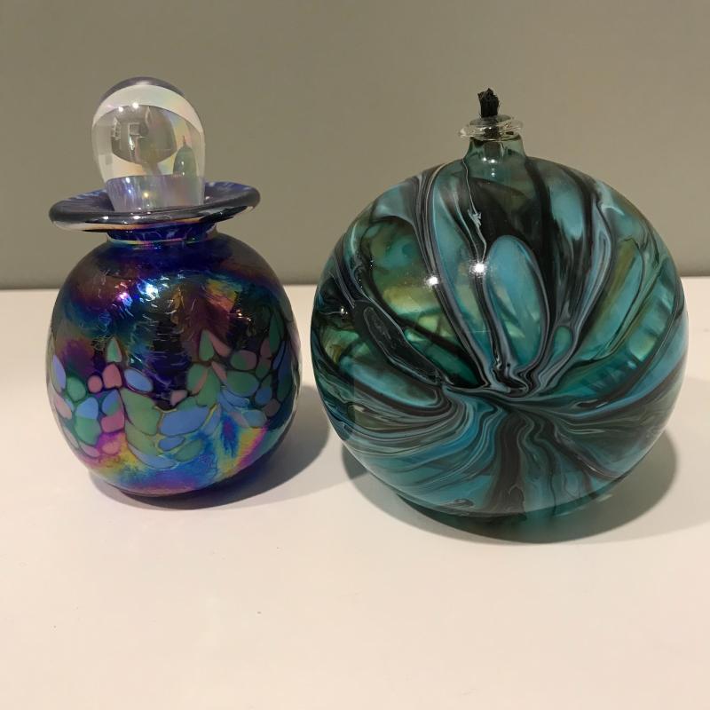 Two pieces, one an oil light globe (approx. 3.25”d x 3.5”h) that appears to be blown with a liquid inside, assumed to be oil. Globe is accompanied by a perfume bottle. Both gorgeous and small. Local pick up only.