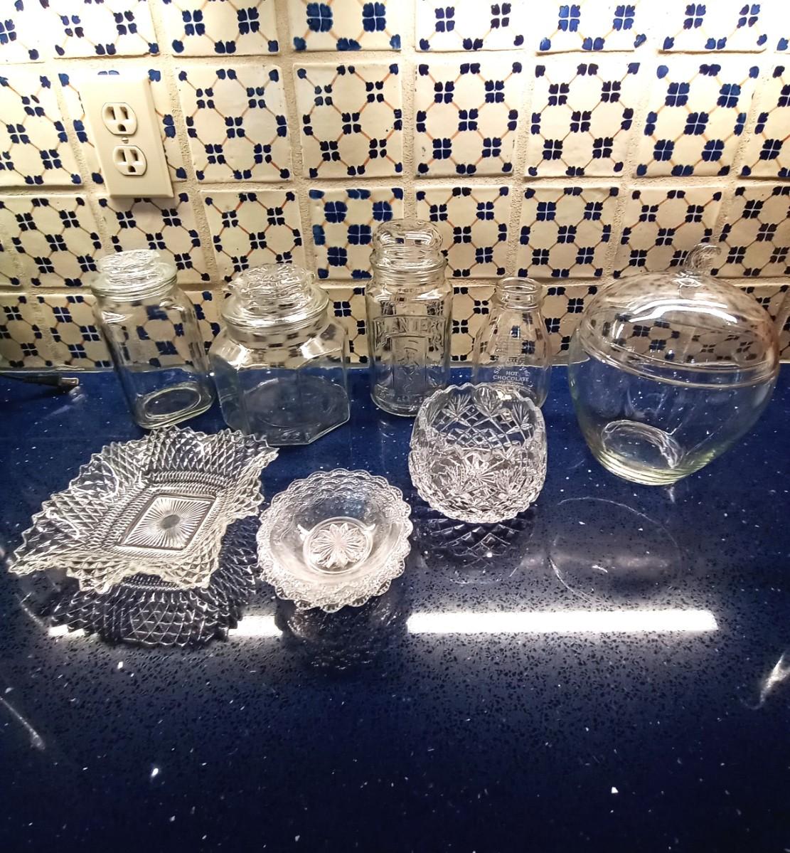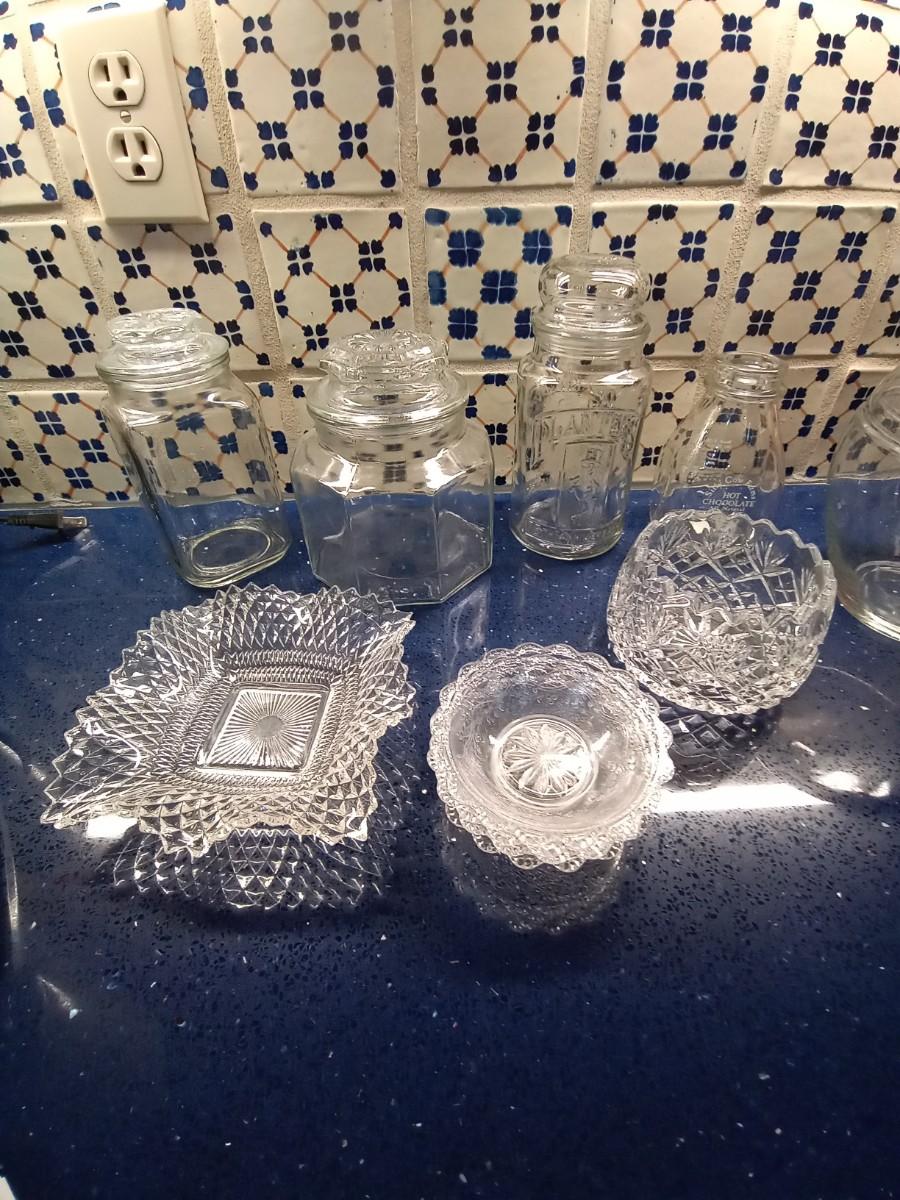 APPLE AND PLANTERS PEANUT CANISTERS, CUT GLASS CANDY DISHES AND MORE