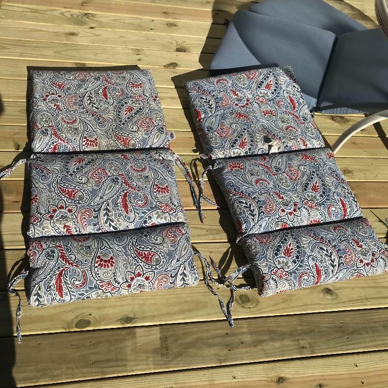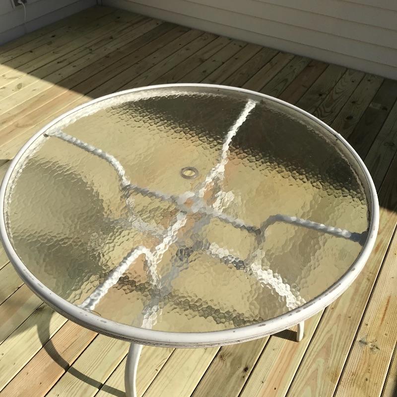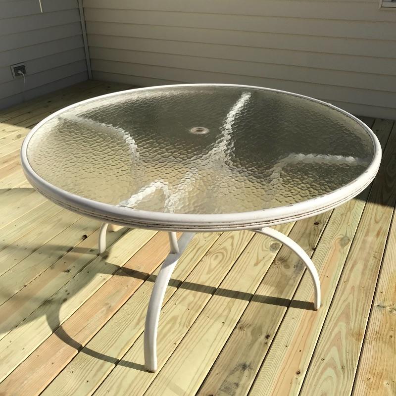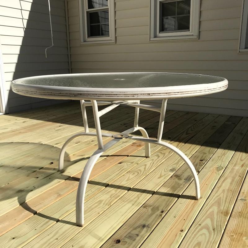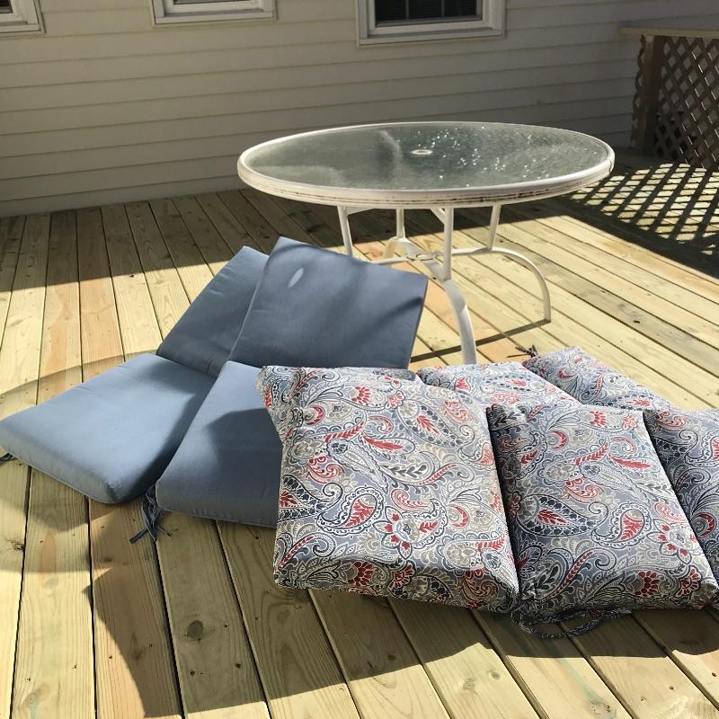White patio dinette table with glass top and room for an umbrella. The edge of the table appears to be covered in rubber and needs a deep clean, the legs are probably white painted metal with a tiny bit of rust. Table is paired with four outdoor chair lounging cushions by Hampton Bay. The lovely paisley goes really well with the solid demon colored cushions. Table measures approximately 47”d x 27”, the cushions are all approximately 21” x 4” x 42”. Now you just need a few chairs to complete your new set! Local pick up only, please bring help to load.