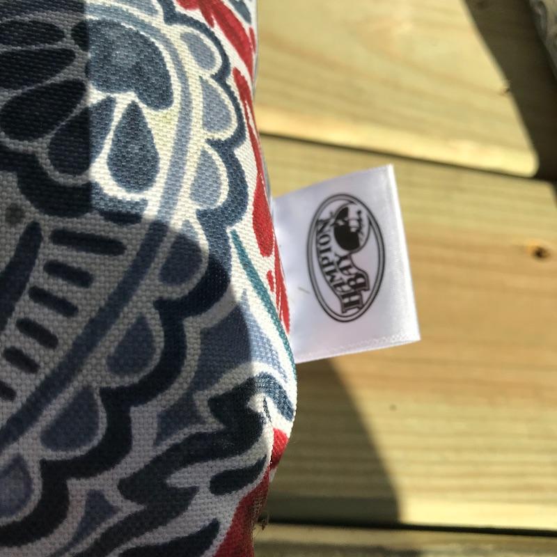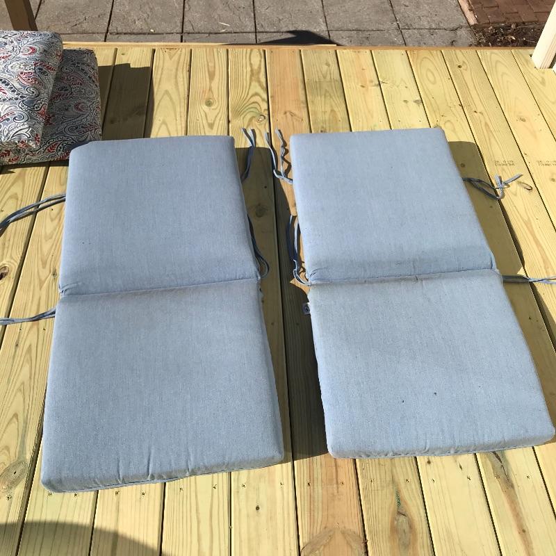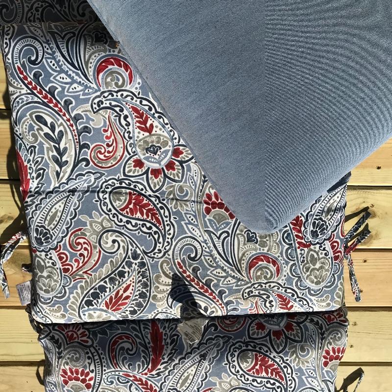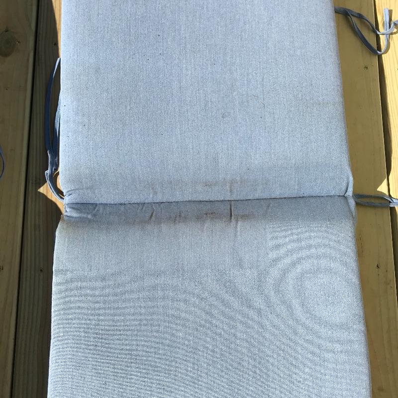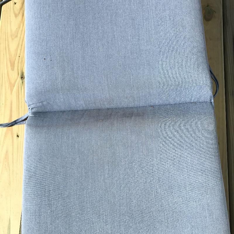 White patio dinette table with glass top and room for an umbrella. The edge of the table appears to be covered in rubber and needs a deep clean, the legs are probably white painted metal with a tiny bit of rust. Table is paired with four outdoor chair lounging cushions by Hampton Bay. The lovely paisley goes really well with the solid demon colored cushions. Table measures approximately 47”d x 27”, the cushions are all approximately 21” x 4” x 42”. Now you just need a few chairs to complete your new set! Local pick up only, please bring help to load.