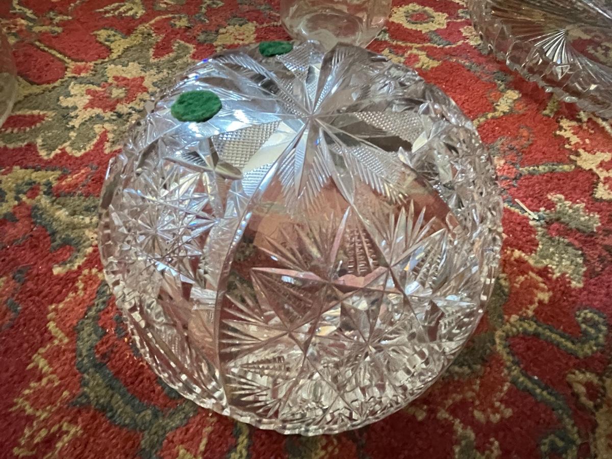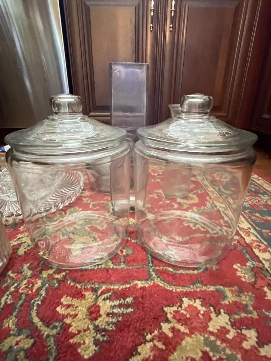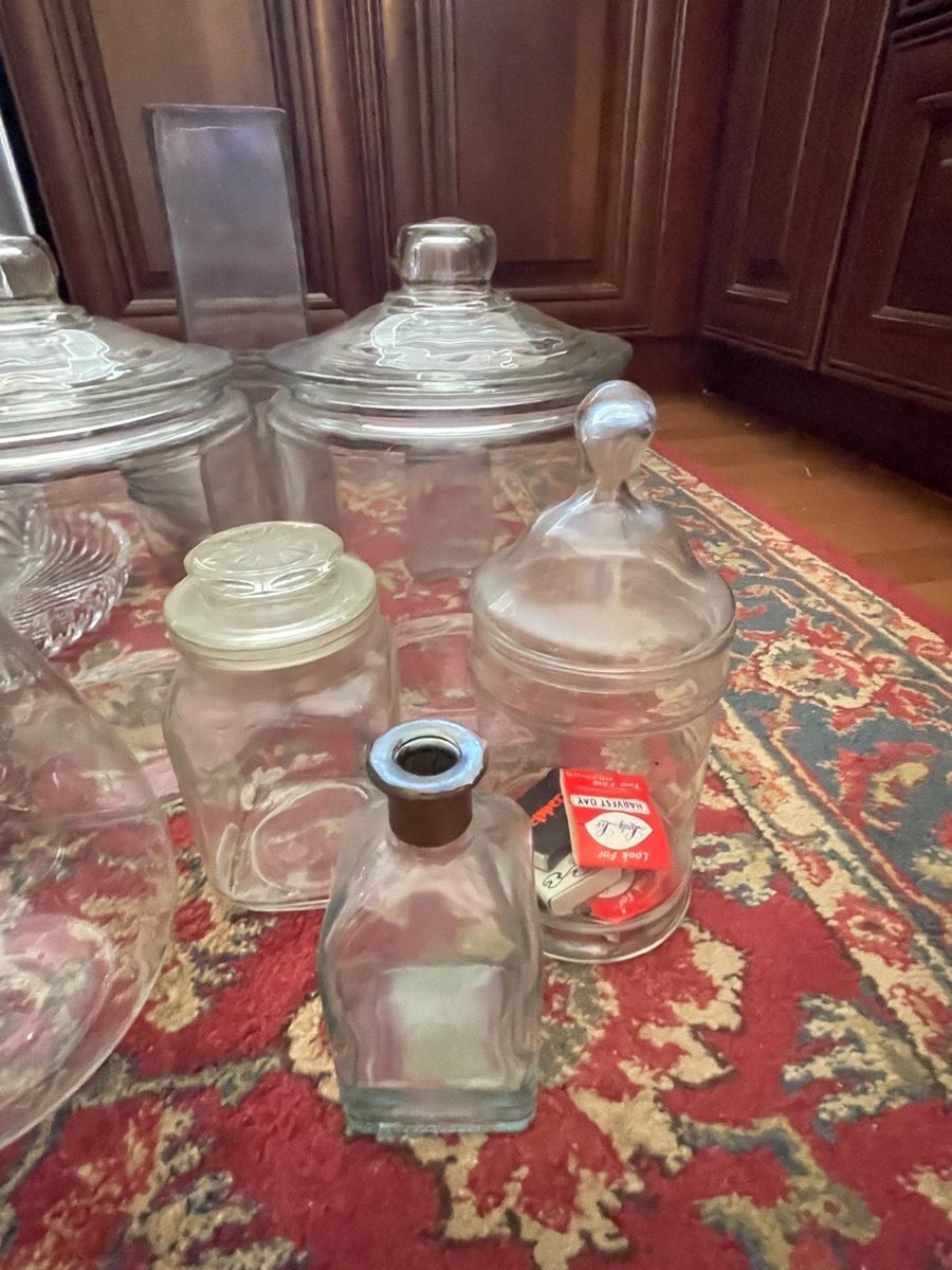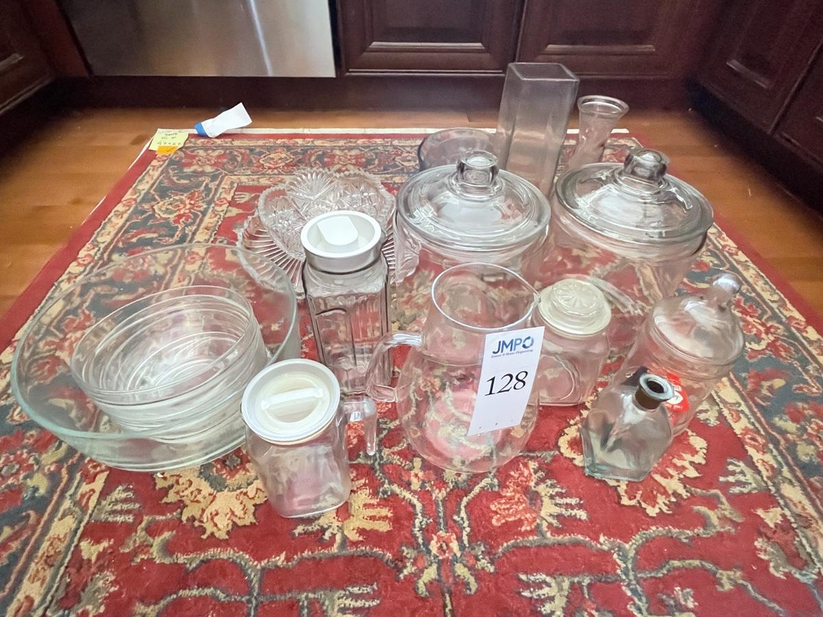 Bowls, 1 cut glass bowl, serving tray, jars, 2 9" lidded canisters. 2 vases