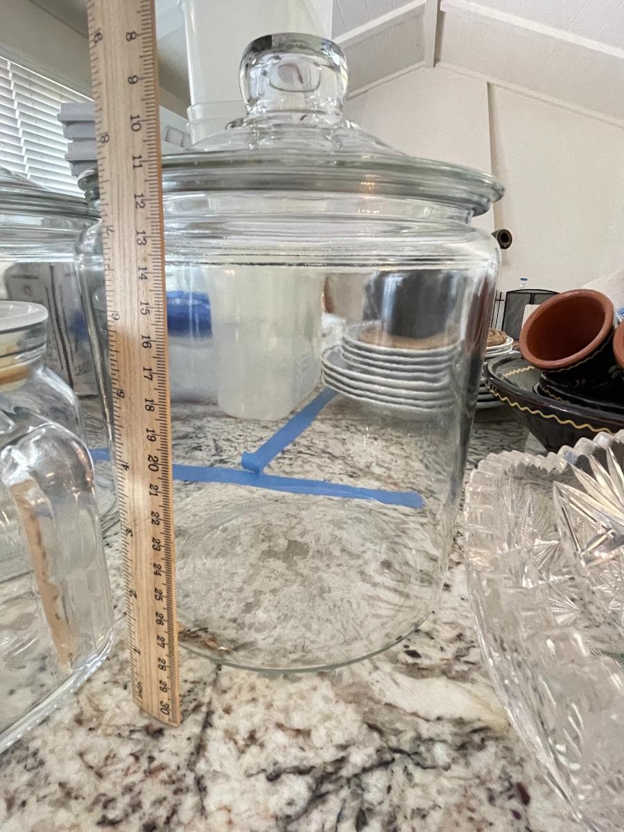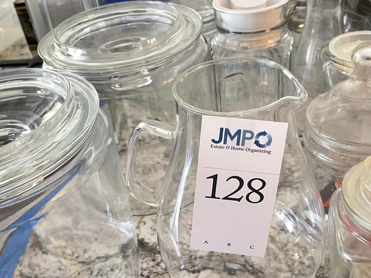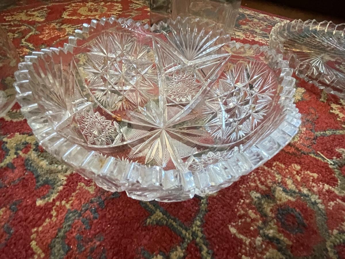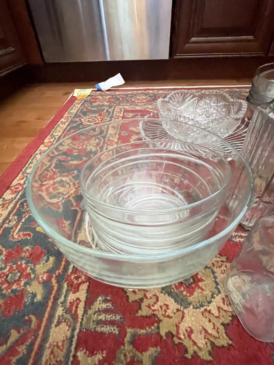 Bowls, 1 cut glass bowl, serving tray, jars, 2 9" lidded canisters. 2 vases