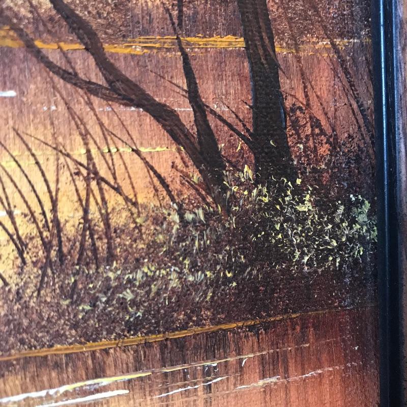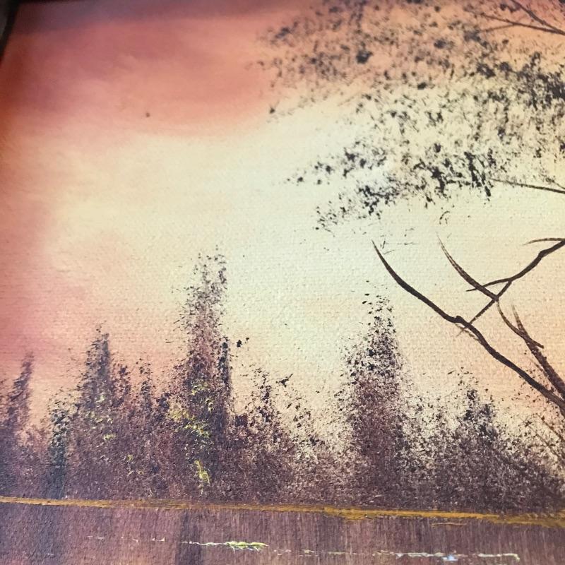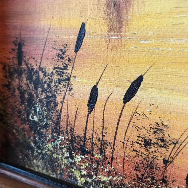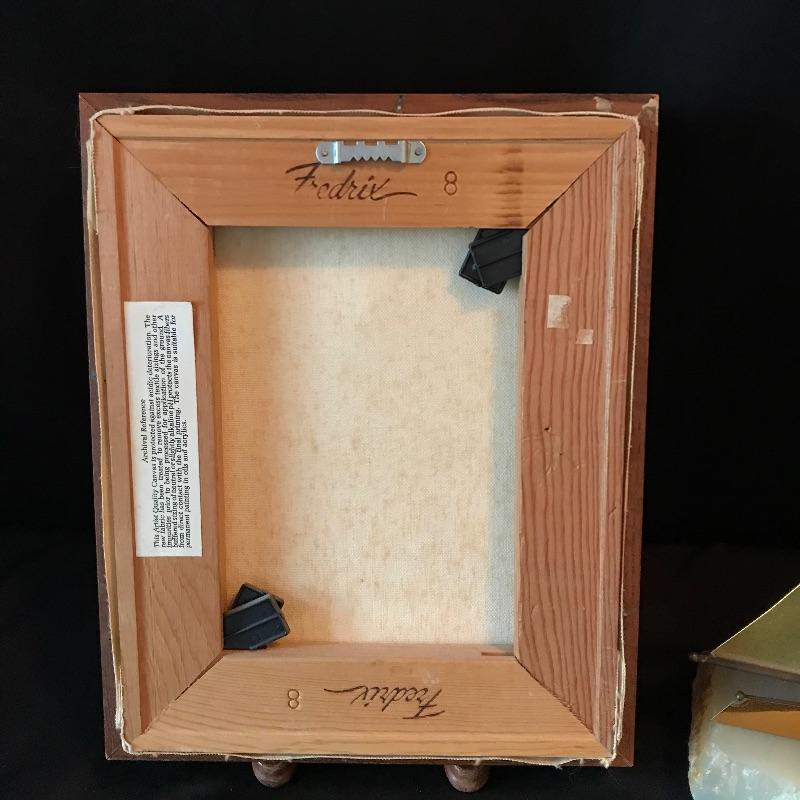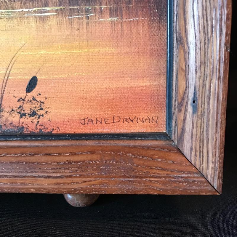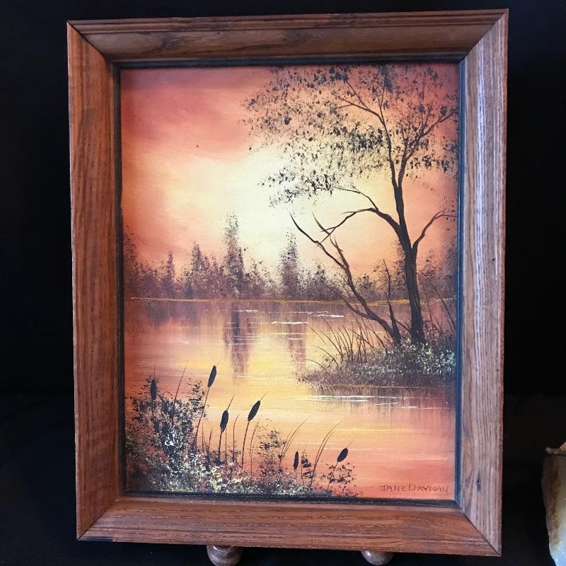 Two golden colored art pieces to warm up any space. Beautiful brass sailboat signed DeMott standing 12” tall on Quartz base. DeMott Art is paired with Jane Drynan lake scene. You can just feel the warm sun on the horizon. Drynan painting sits in a wood frame measuring approximately 9” x 11”. Find more Jane Drynan art in lot 40. See photos. Shipping available. Please call UPS with dimensions at 828-252-6930 for a shipping quote prior to bidding.