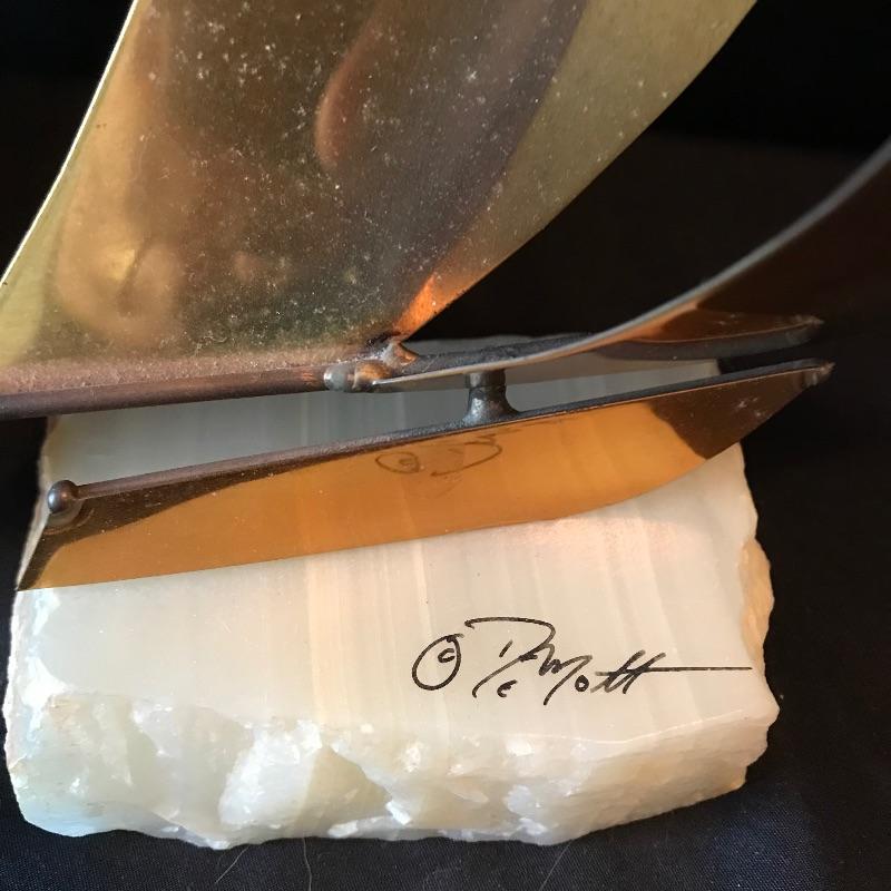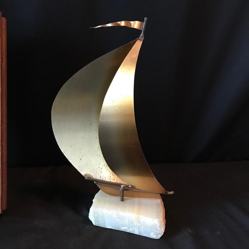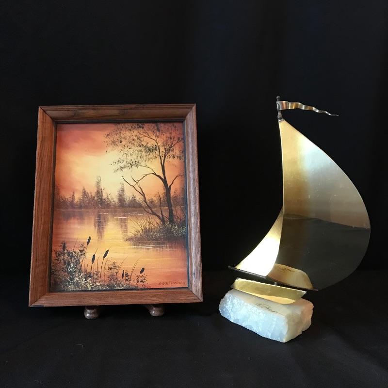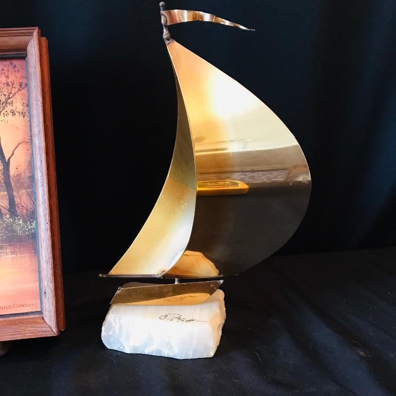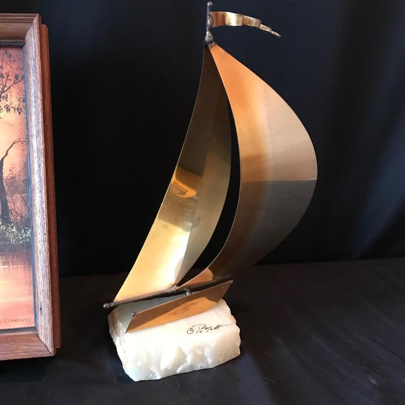 Lot 128 - J DeMott Brass Sailboat on Quartz with Jane Drynan Signed Art