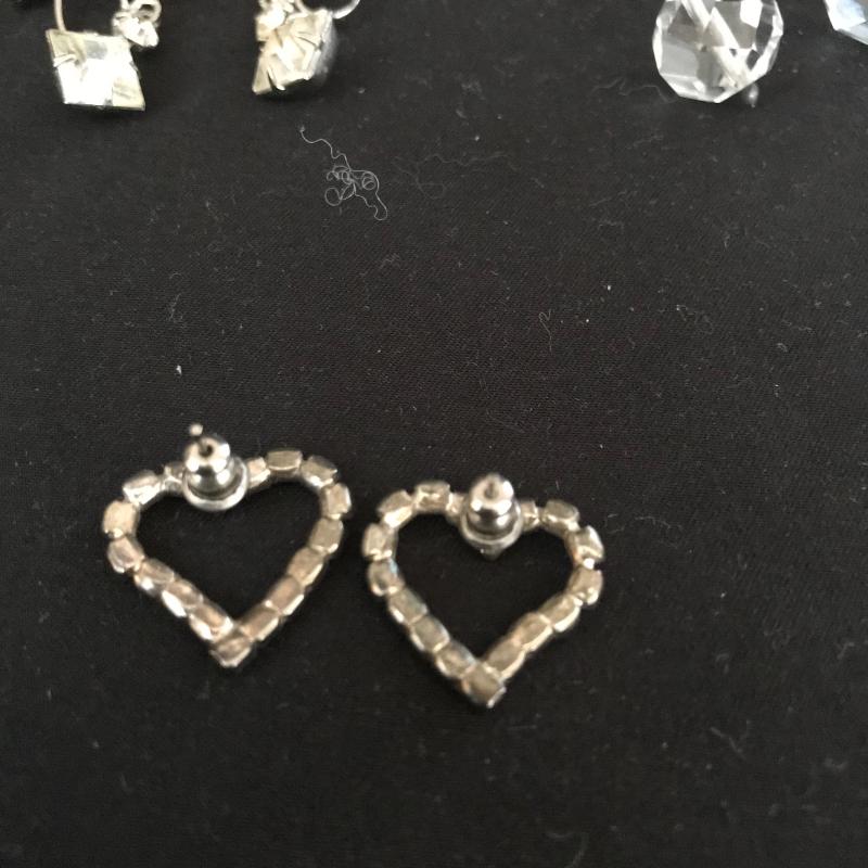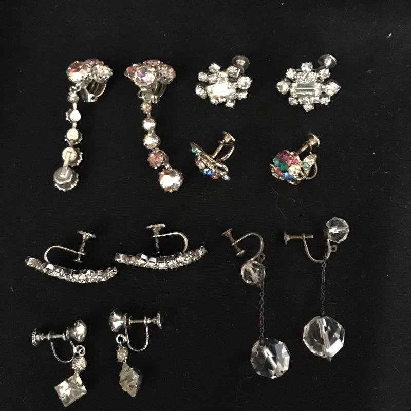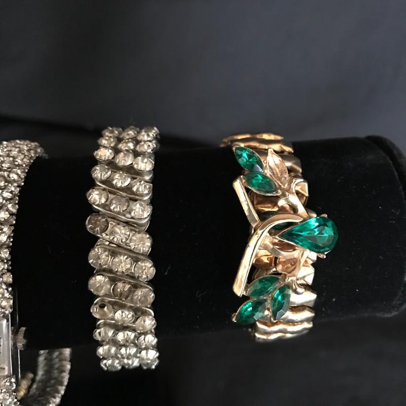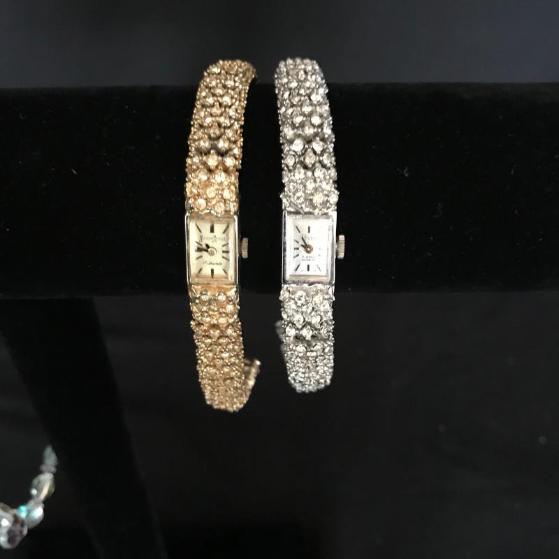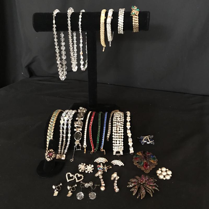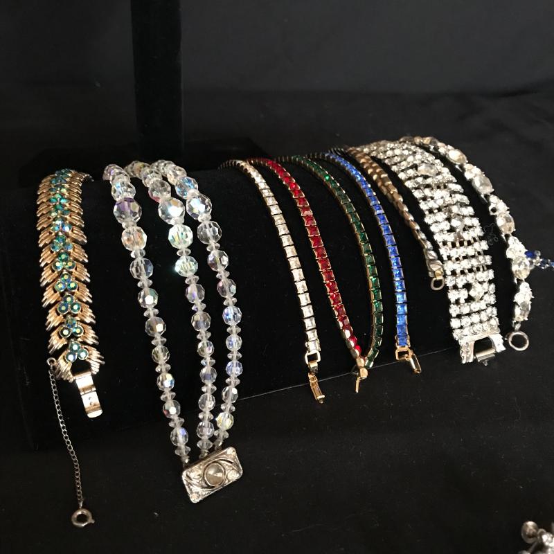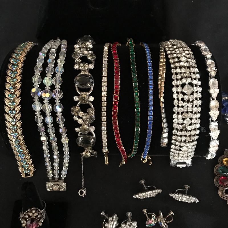 Large collection of clip-on earrings, bracelets with pins and necklaces too. Neman Marcus and Pedre watches. Heart shaped earrings for pierced ears and a purple jeweled ring. See photos for entire inventory and conditions. Shipping available.