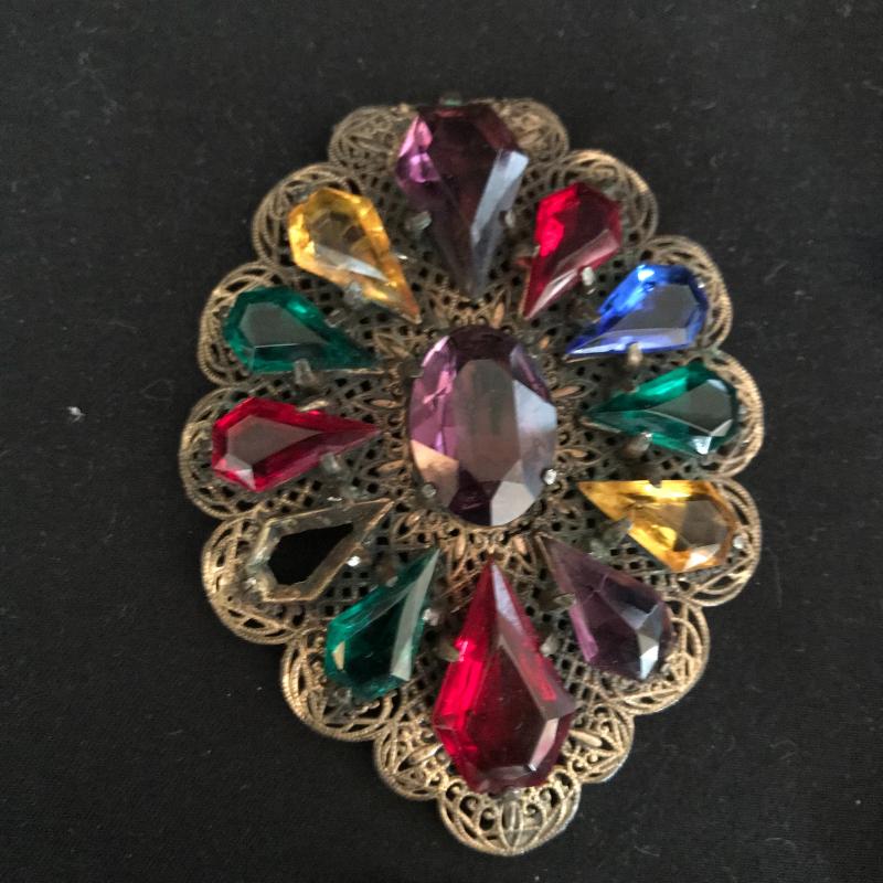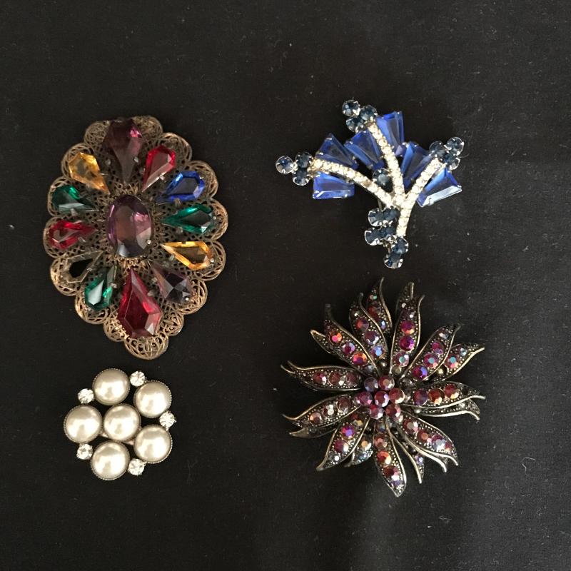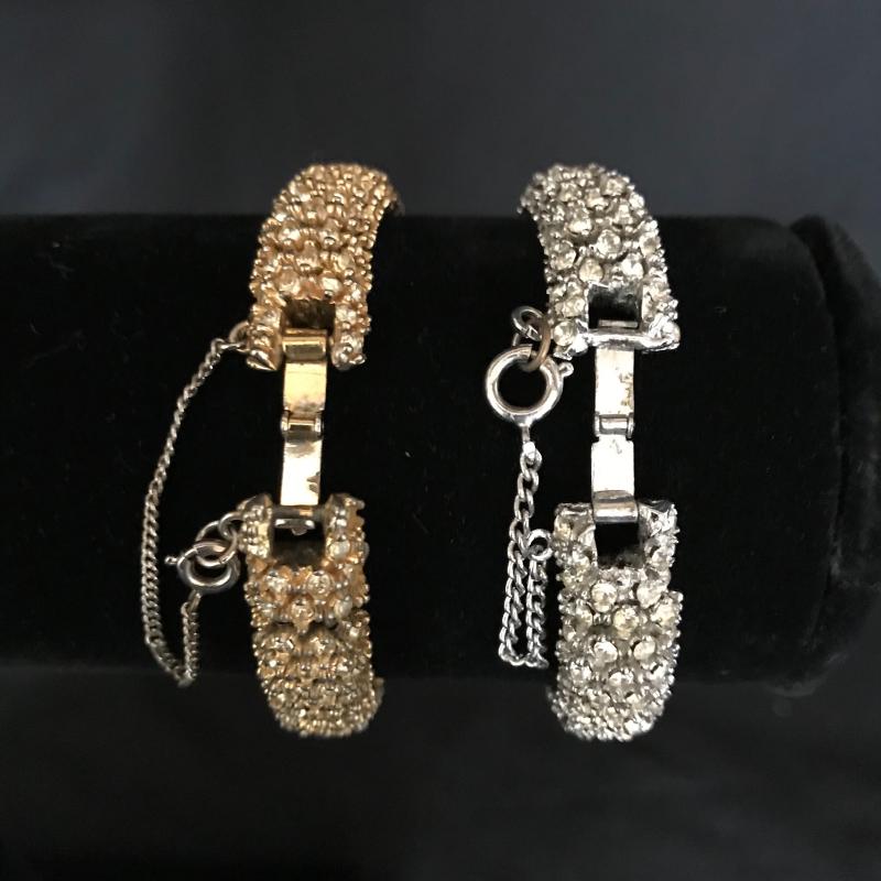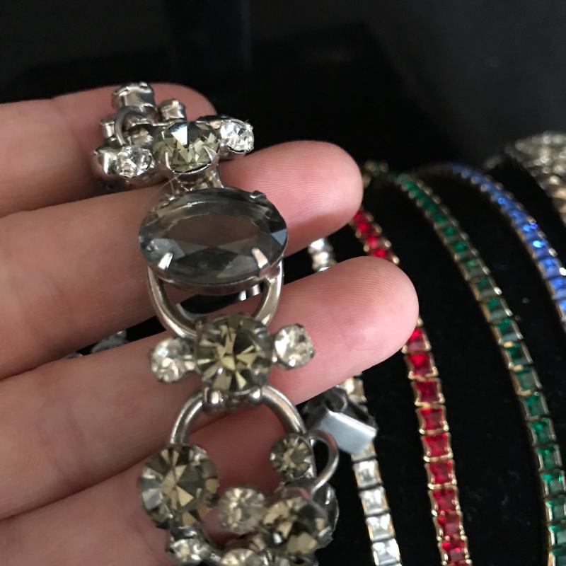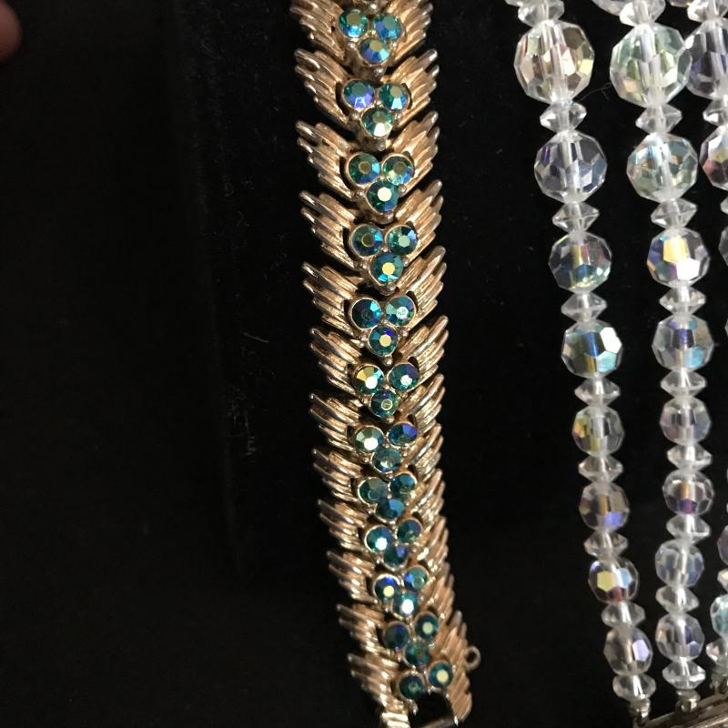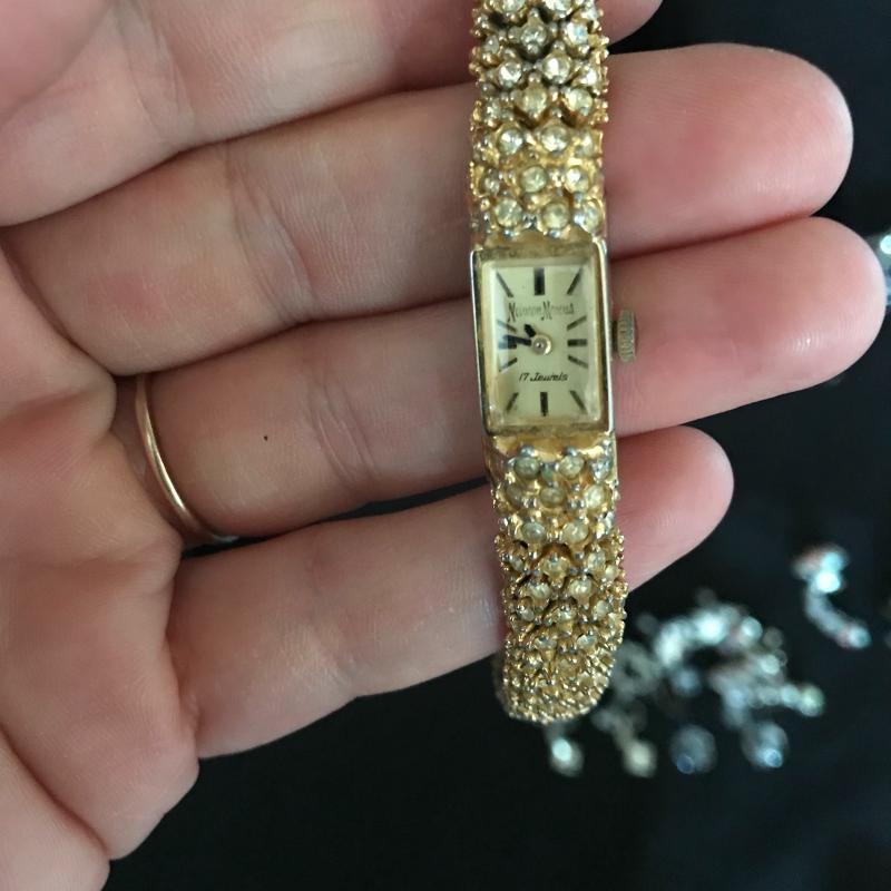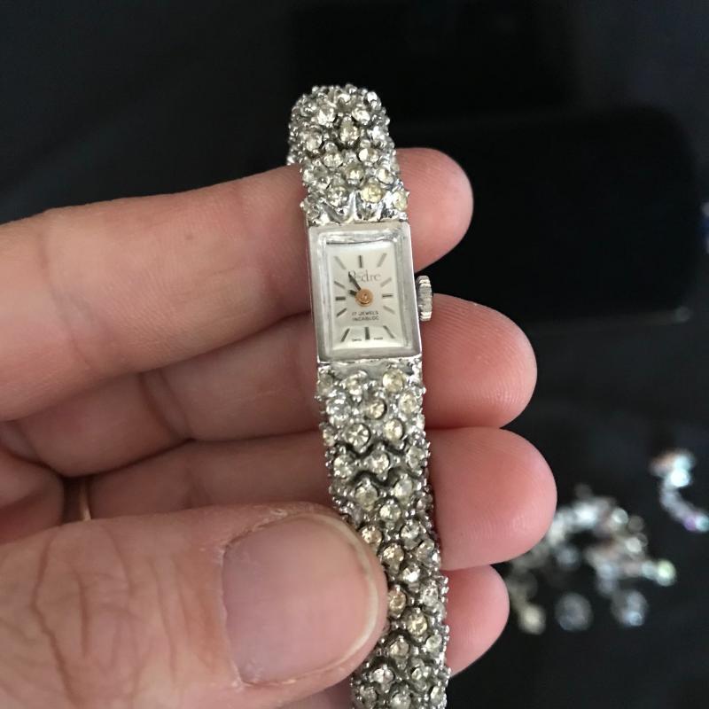 Large collection of clip-on earrings, bracelets with pins and necklaces too. Neman Marcus and Pedre watches. Heart shaped earrings for pierced ears and a purple jeweled ring. See photos for entire inventory and conditions. Shipping available.