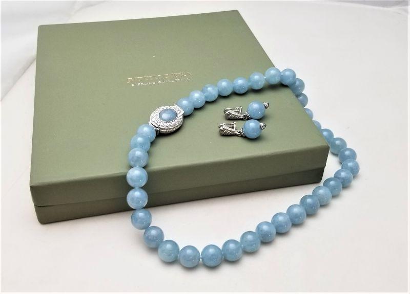 Lot #128  Judith Ripka Sterling  18" Milky Aqua Bead Necklace & matching clip earrings