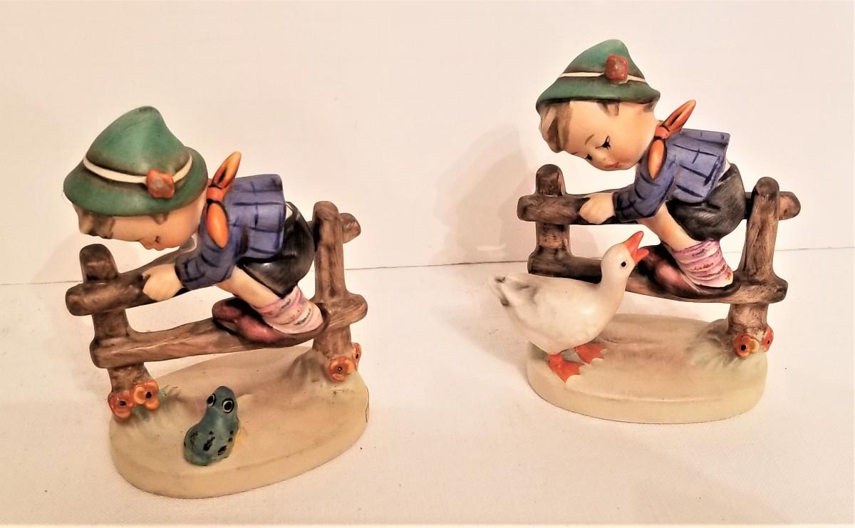 Lot #128  Lot of 2 vintage Hummel figurines  "Retreat to Safety", one with frog, one with goose