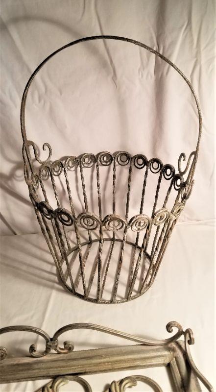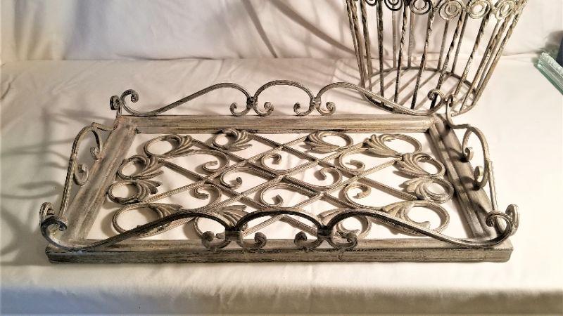 Contemporary decorator metal pieces - tray and basket. The tray is 20" x 12", the basket 17"tall and 11" across. Good condition - shabby chic.
